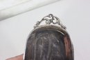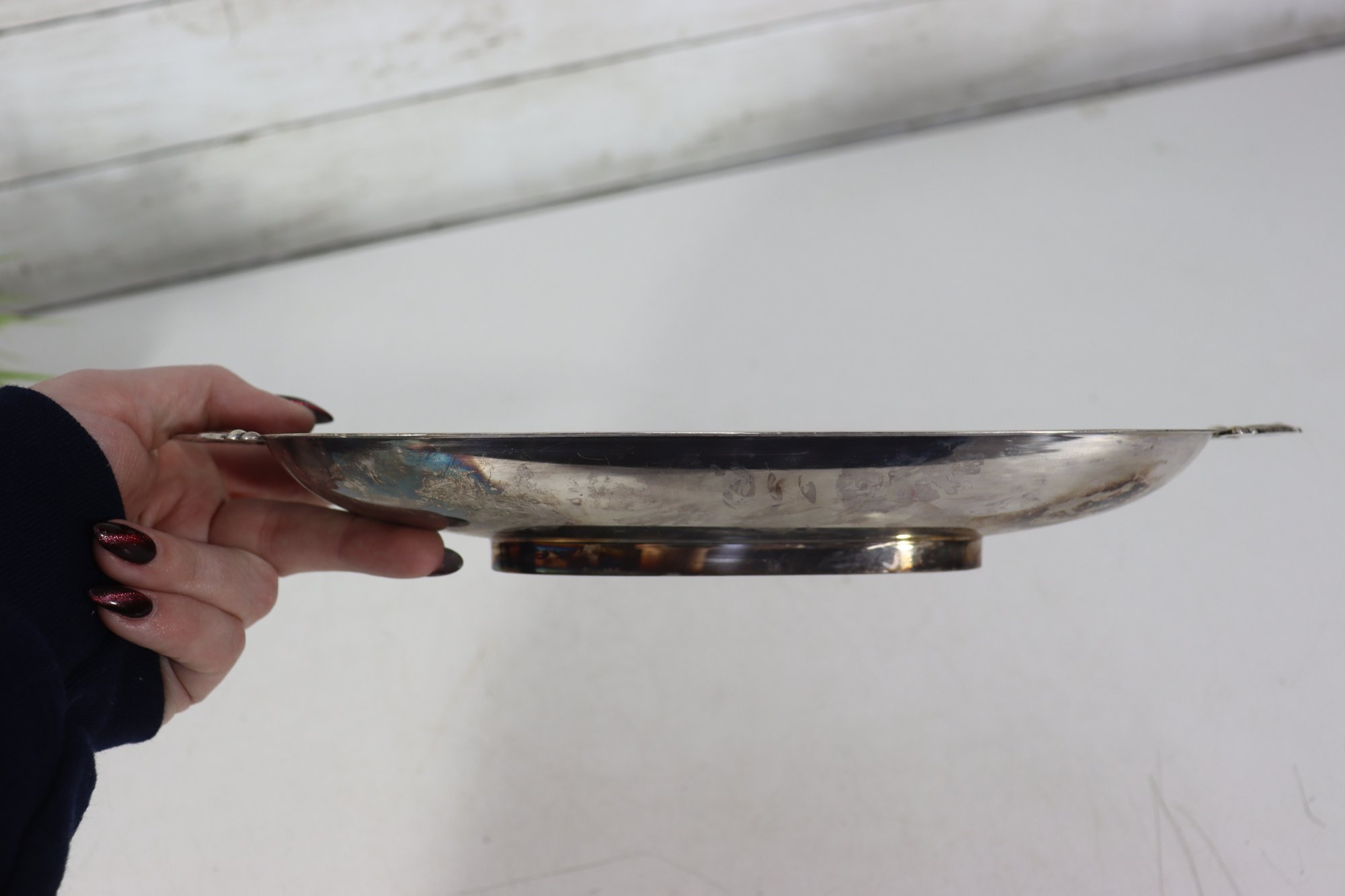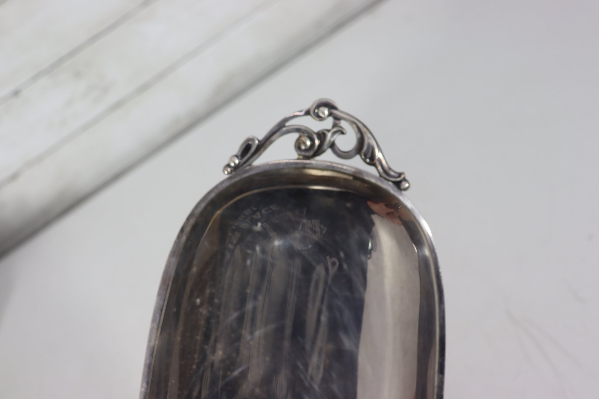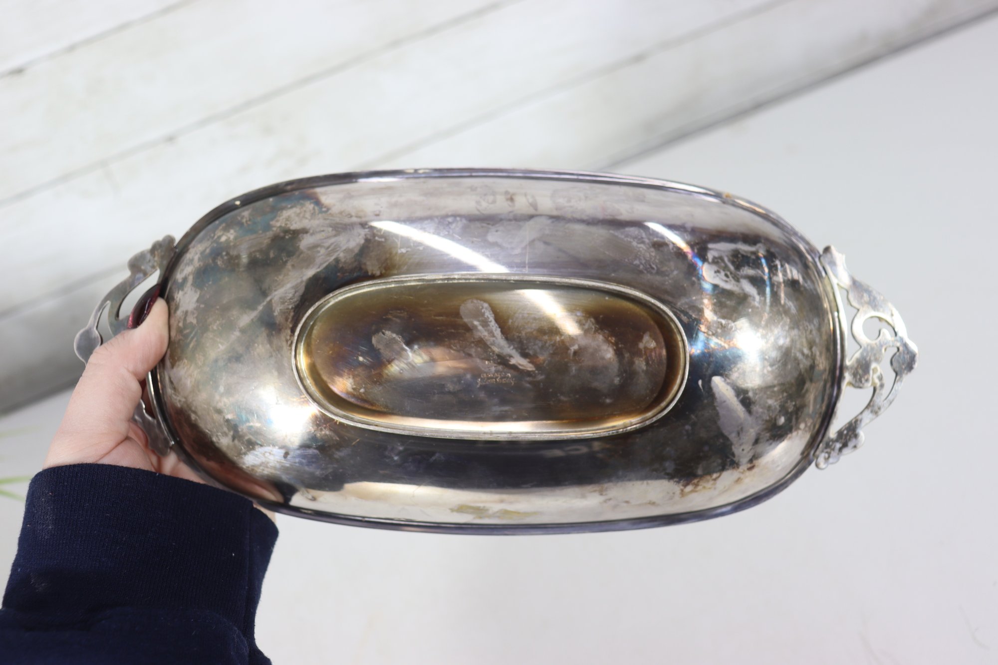 a Danish silverplate oval serving tray, marked Denmark No. 470 and designed by Gidom Fraberg. This elegant tray features a classic oval form with gently raised edges and ornate pierced handles, showcasing refined Scandinavian design.