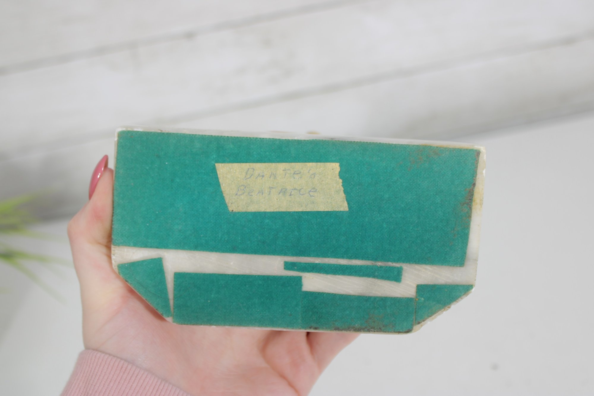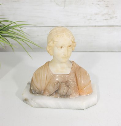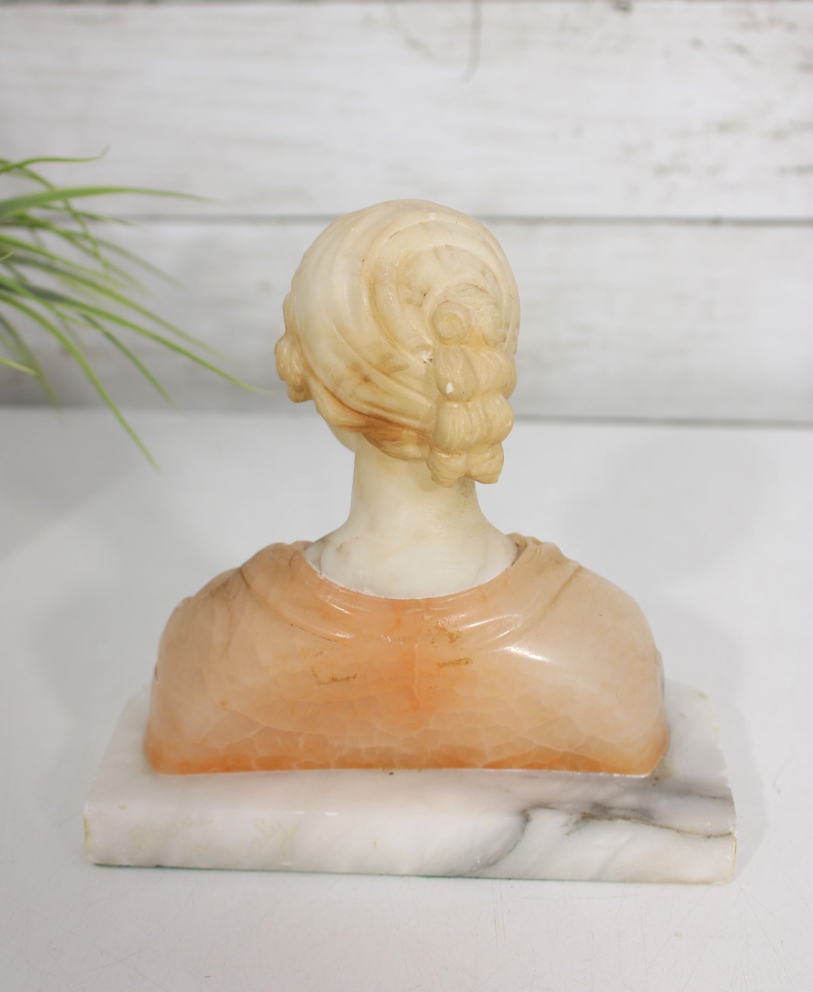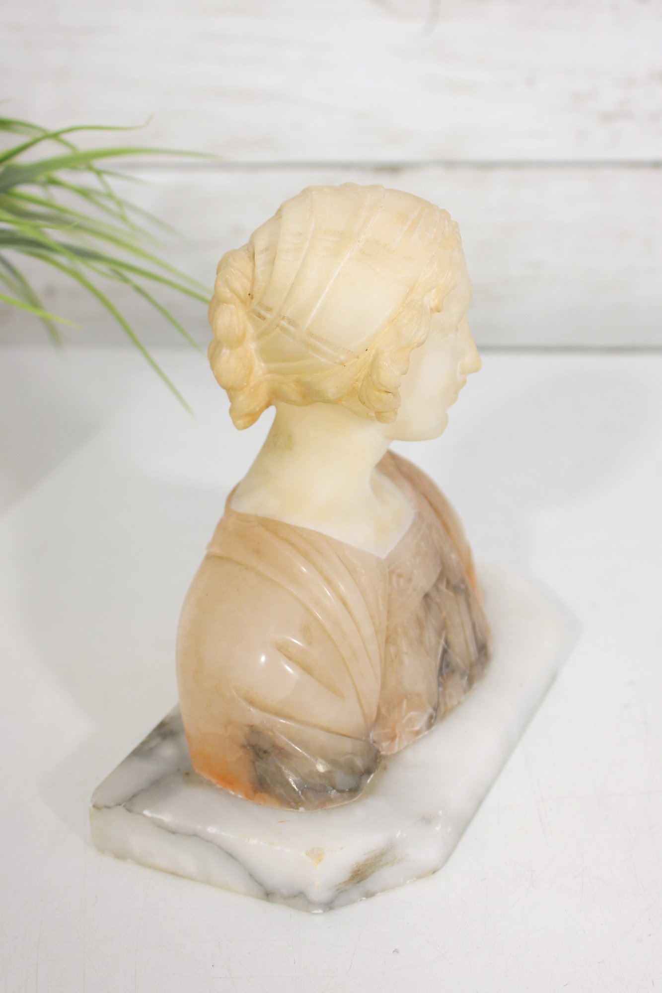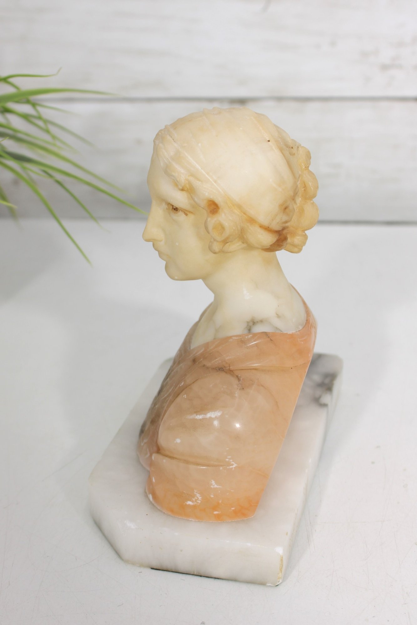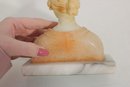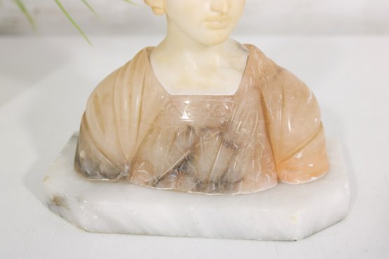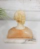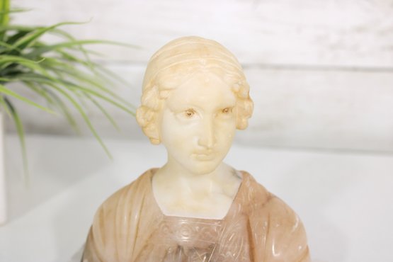 bust sculpture of Beatrice from Dante’s Divine Comedy, rendered in a classical style with soft, serene features and flowing drapery. The piece is crafted in a marble or alabaster-style material, showcasing warm natural tones of cream, blush, and soft gray veining.