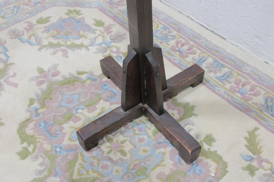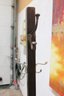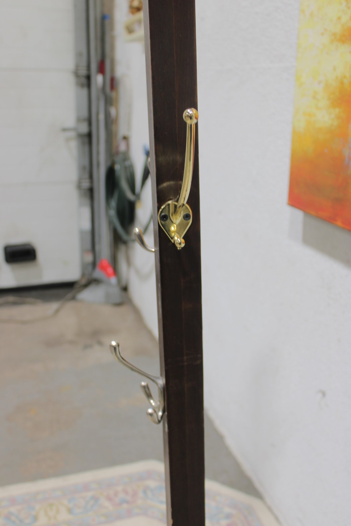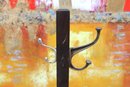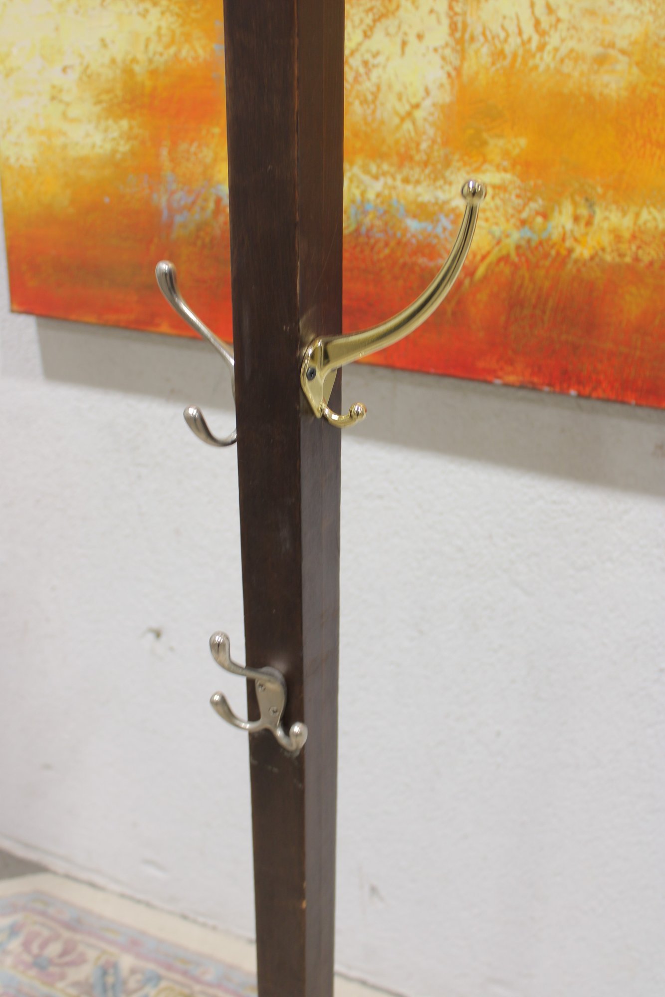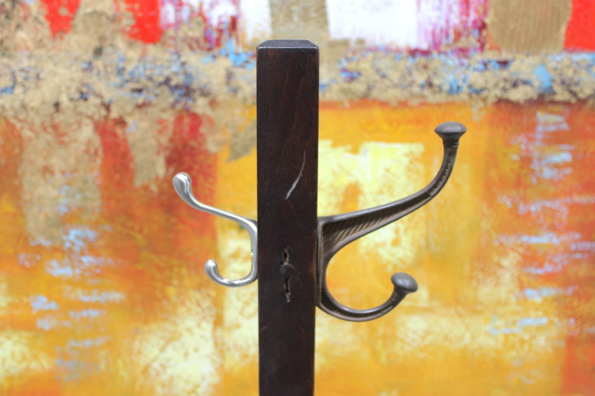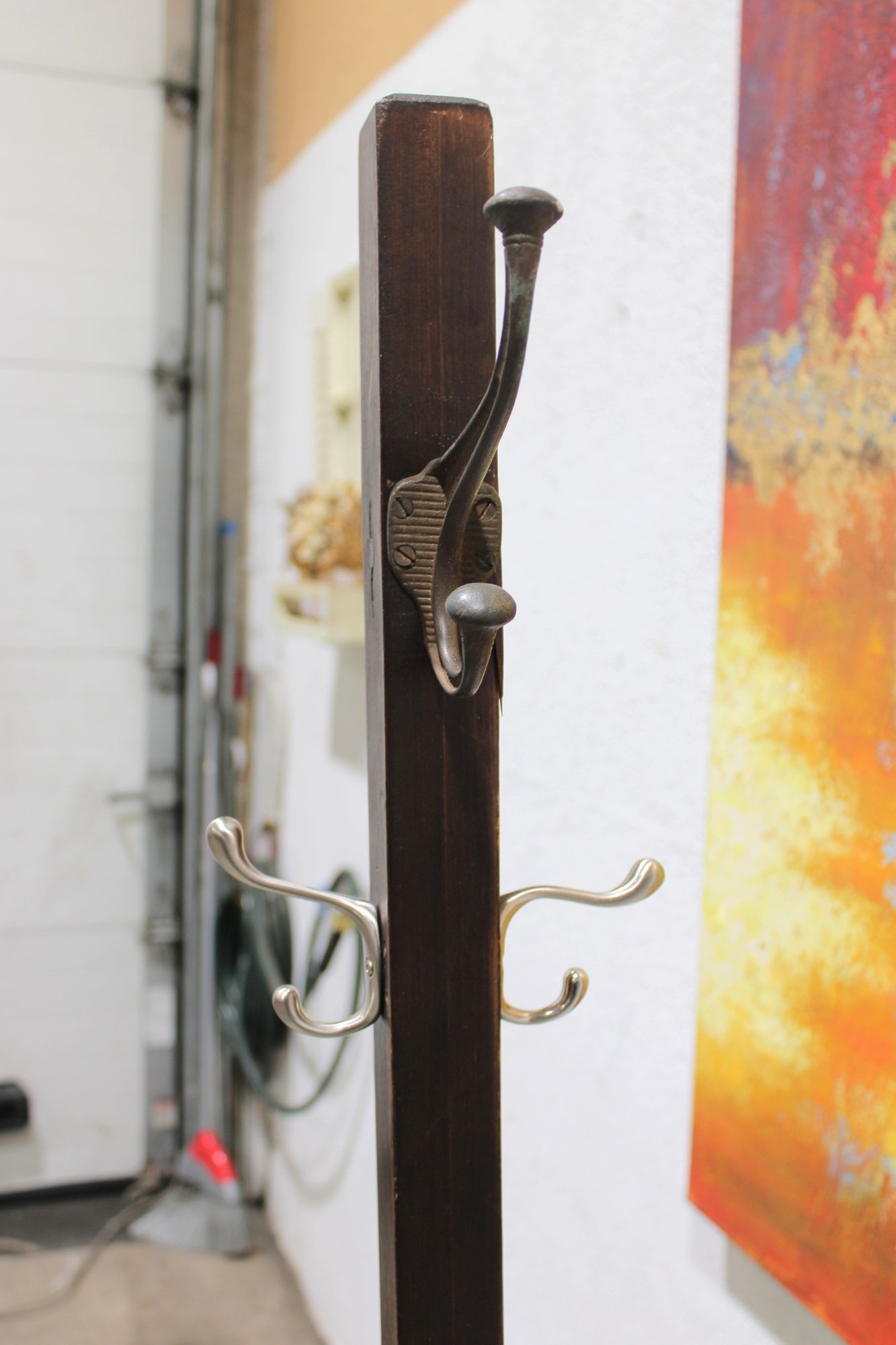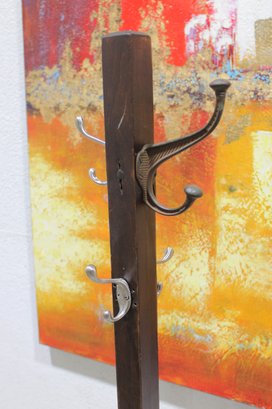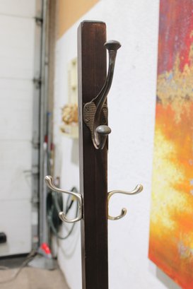 Freestanding coat rack featuring a dark wood post, cross-form base, and multiple curved metal hooks for hanging coats, hats, scarves, or bags. Its simple upright design makes it a practical addition to an entryway, office, mudroom, or bedroom while offering a classic mixed-material look.