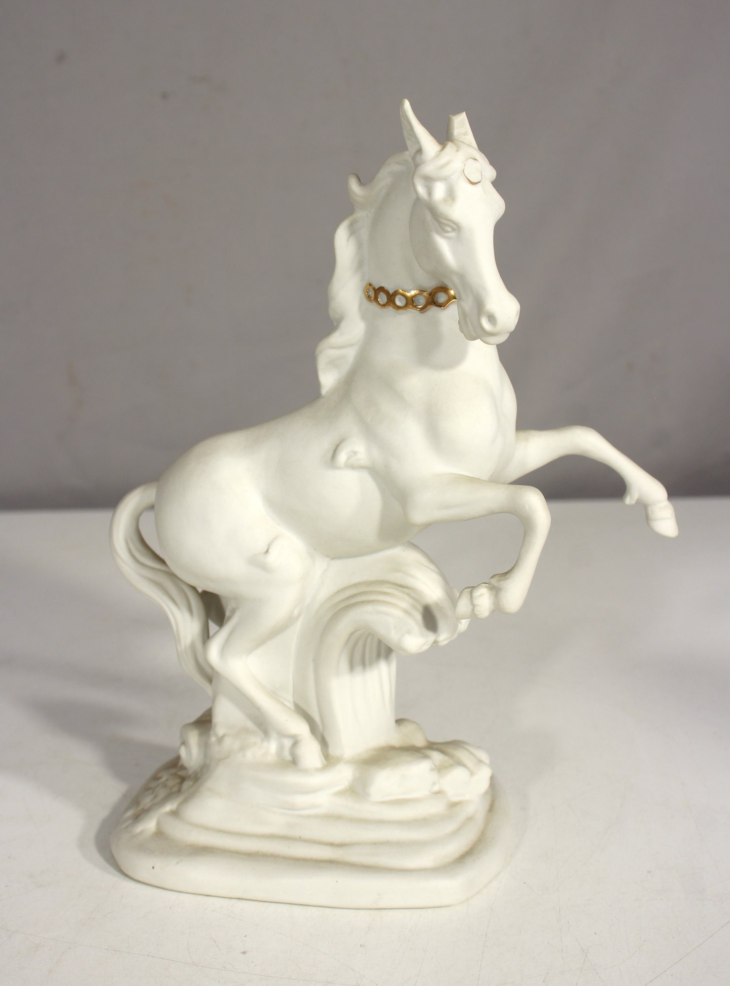 stunning bisque porcelain unicorn figurine titled Unicorn: The Messenger of Love by renowned artist David Cornell. Crafted in fine bisque porcelain, this elegant 9-inch-tall sculpture features a majestic unicorn rearing gracefully over a sculpted base. The piece is adorned with a delicate gold-tone chain collar, adding a touch of regal charm.