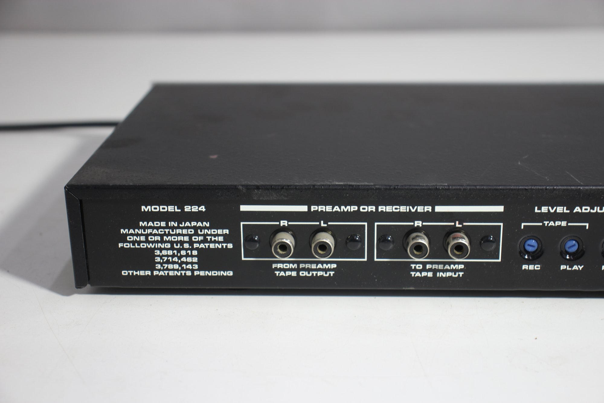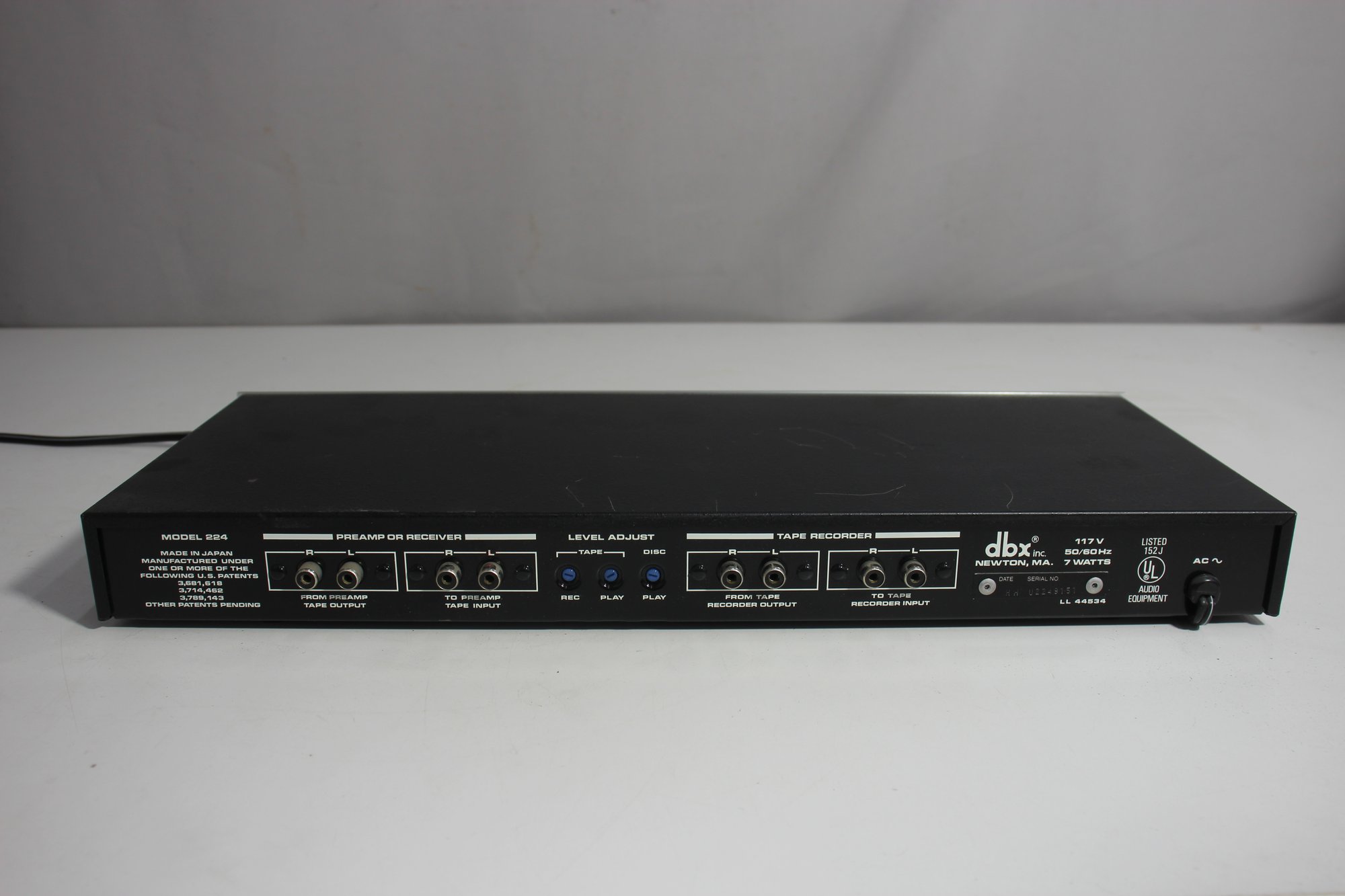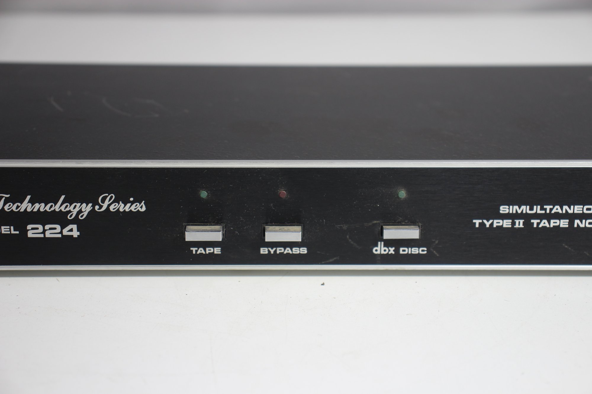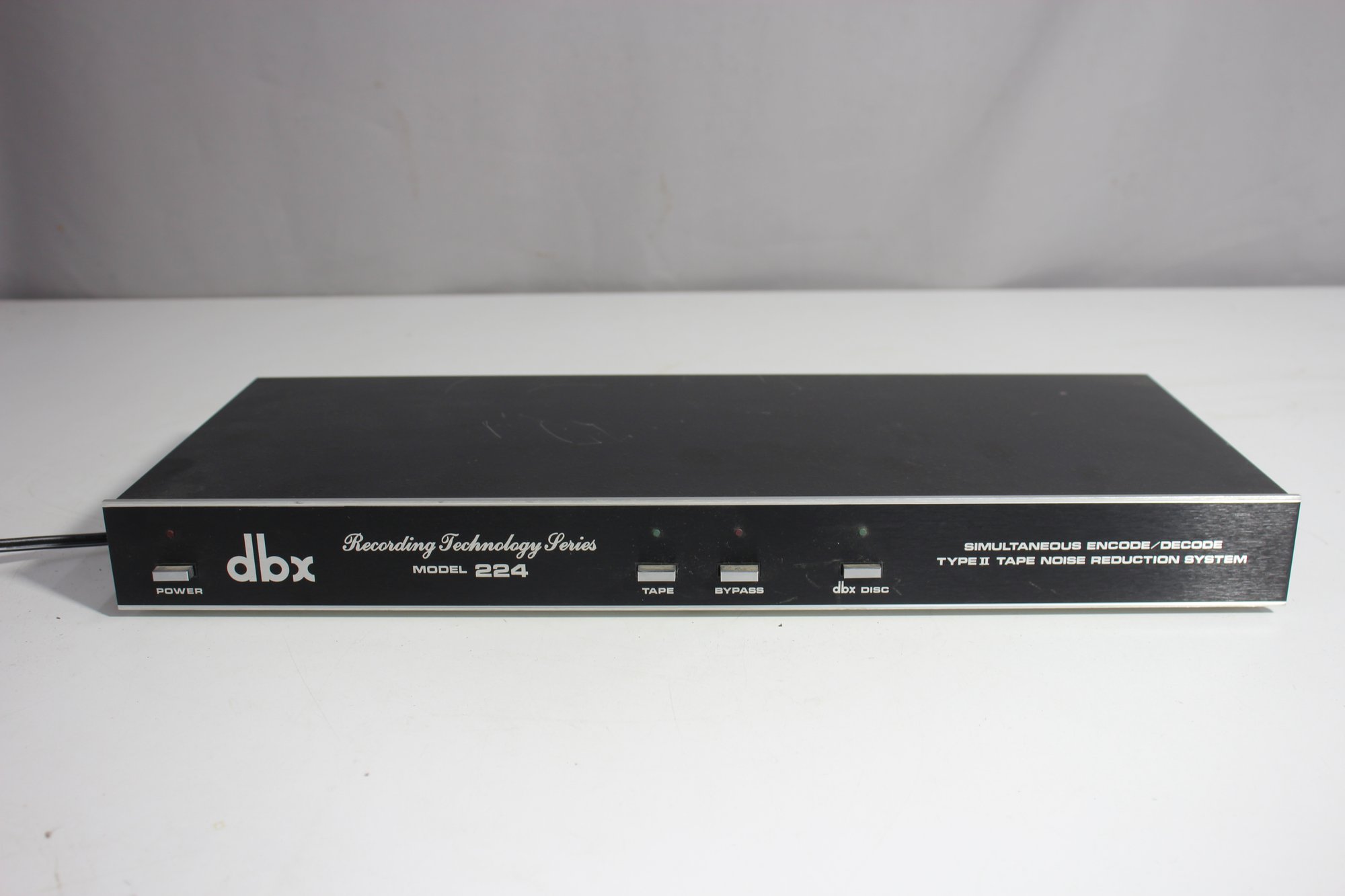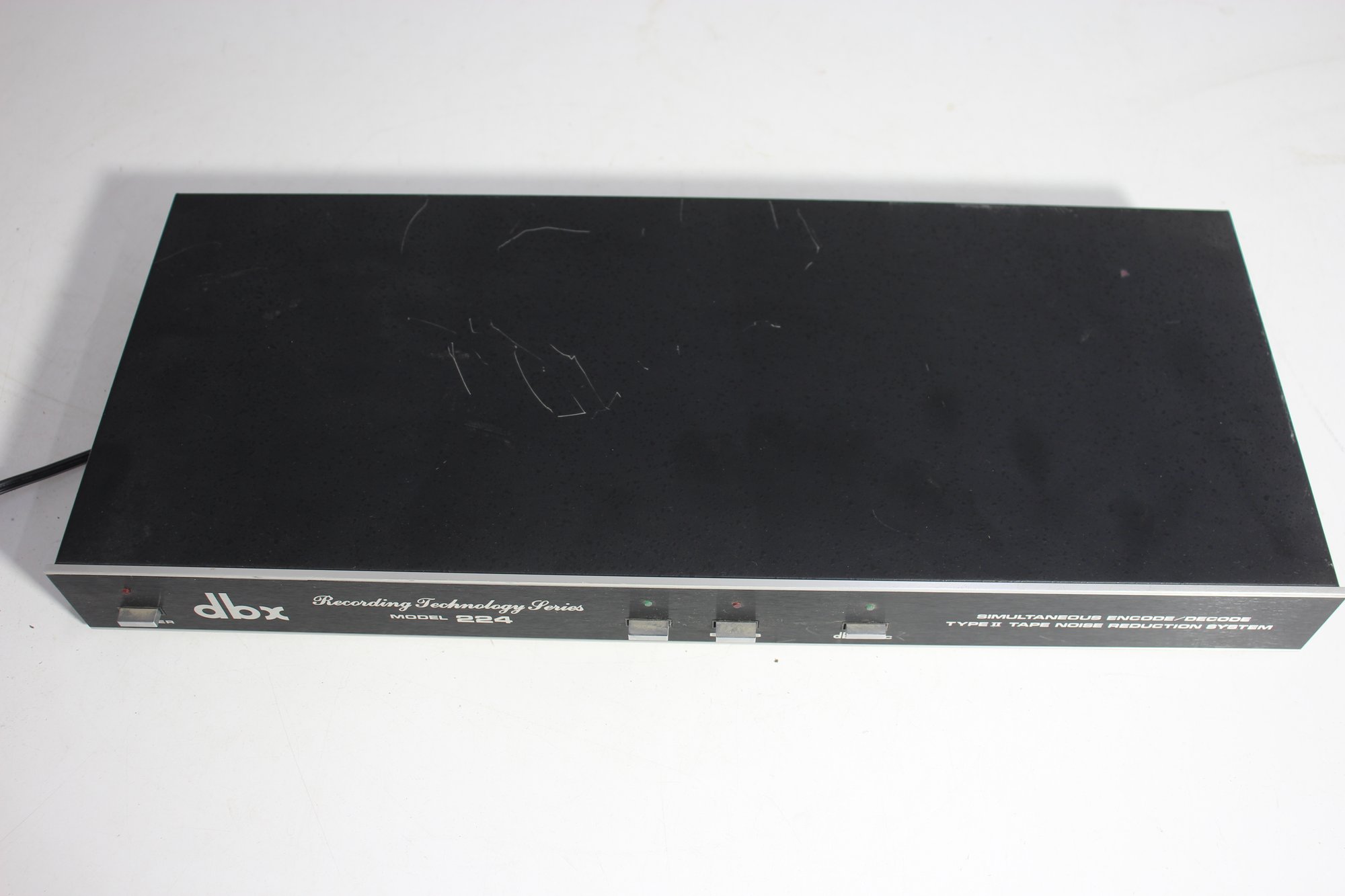 vintage dbx Model 224 Tape Noise Reduction System, part of the dbx Recording Technology Series. This unit was designed for simultaneous encode and decode functions, featuring Type II noise reduction for high-quality tape recording. Built with premium components, the unit includes a range of RCA inputs and outputs for seamless integration into vintage audio setups.