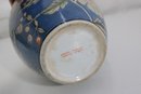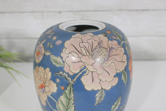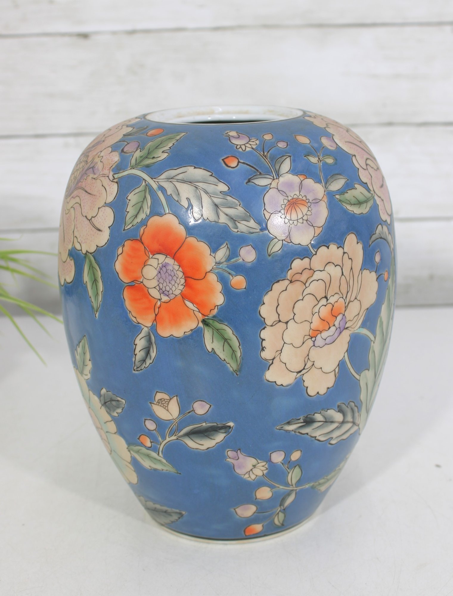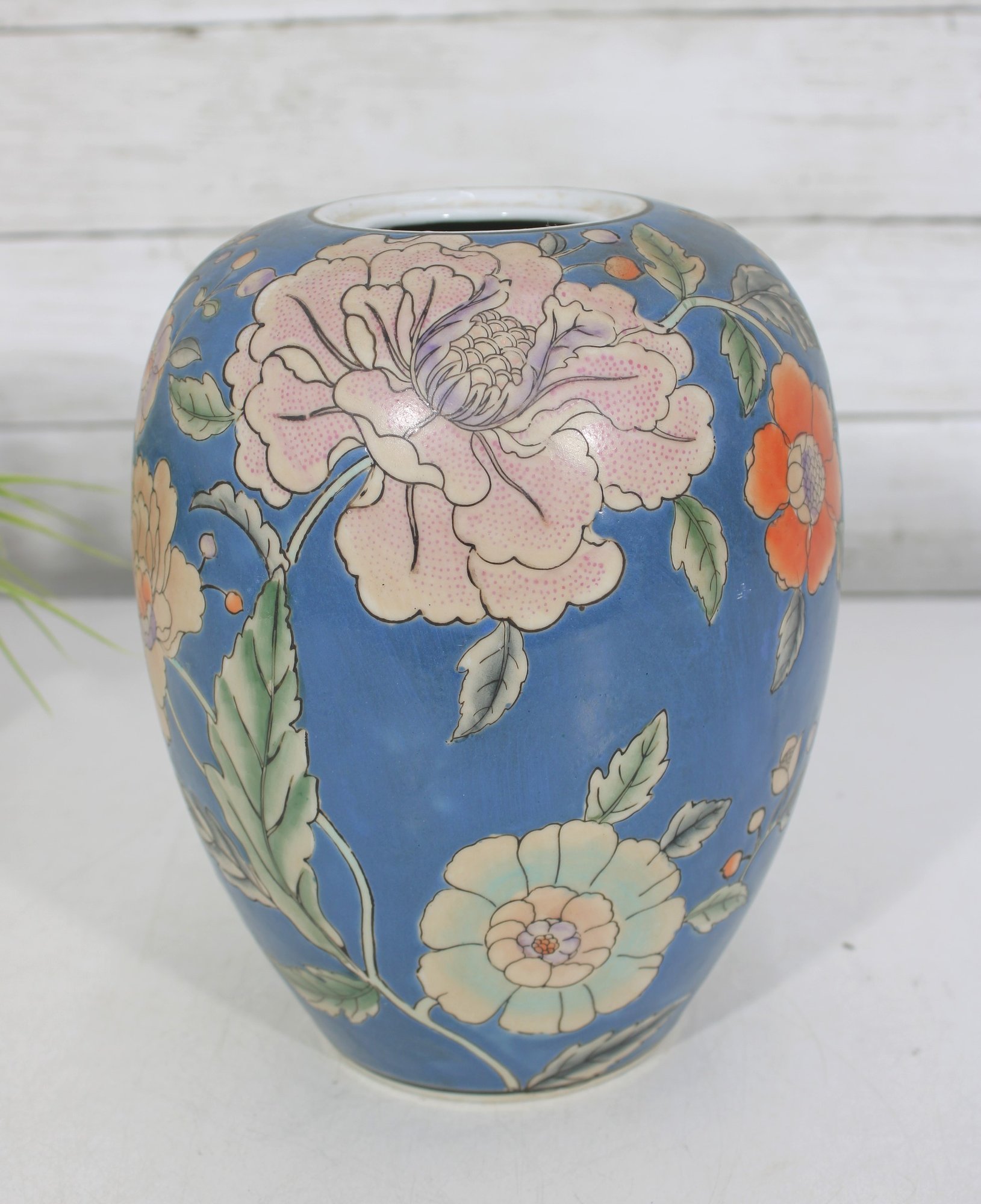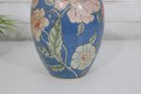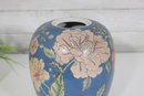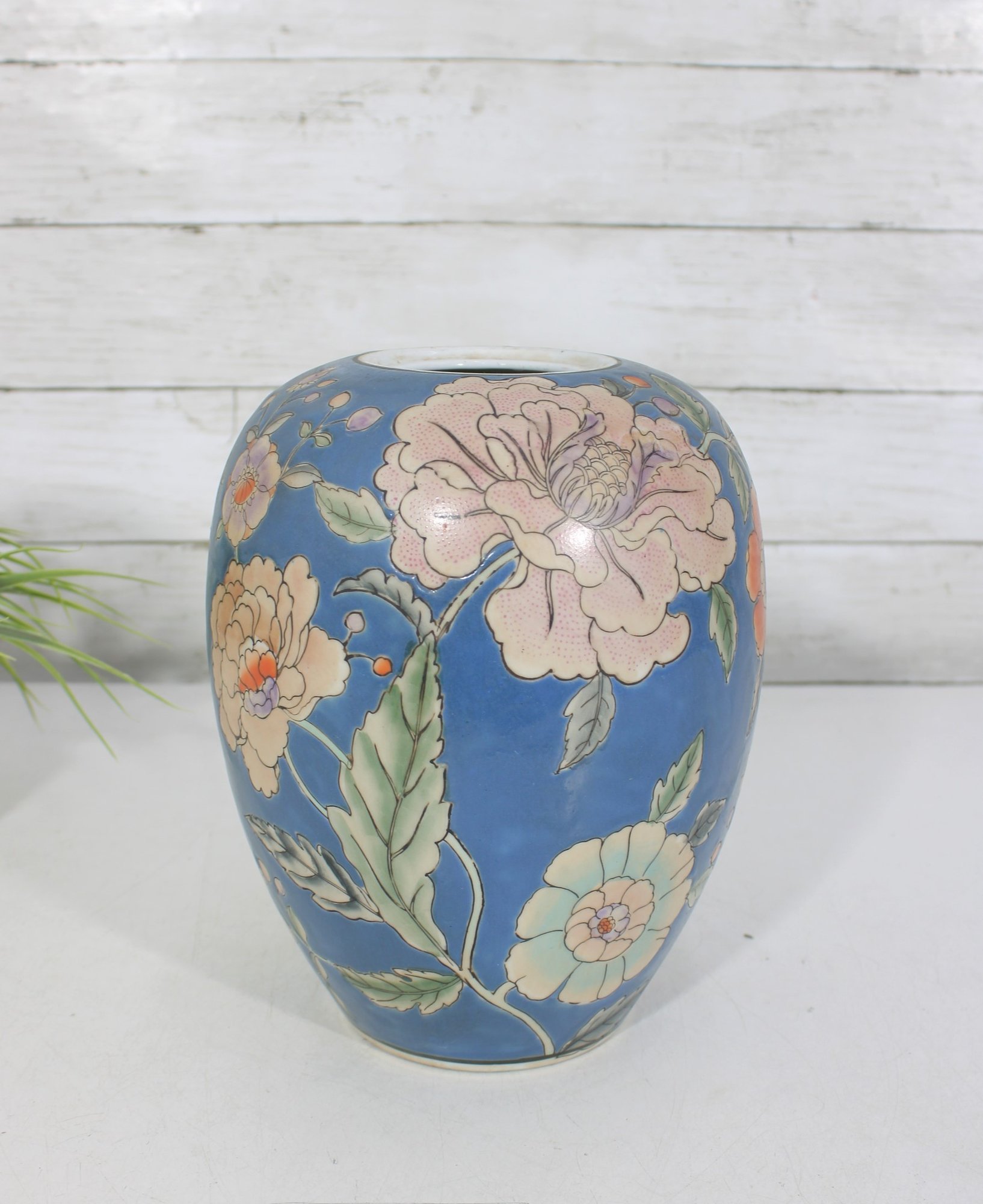 a decorative ceramic vase, measuring approximately 9 inches tall. This attractive piece features a rich blue background adorned with soft pastel floral motifs, including large blossoms, leafy stems, and delicate accent flowers that wrap around the body.