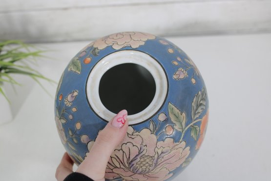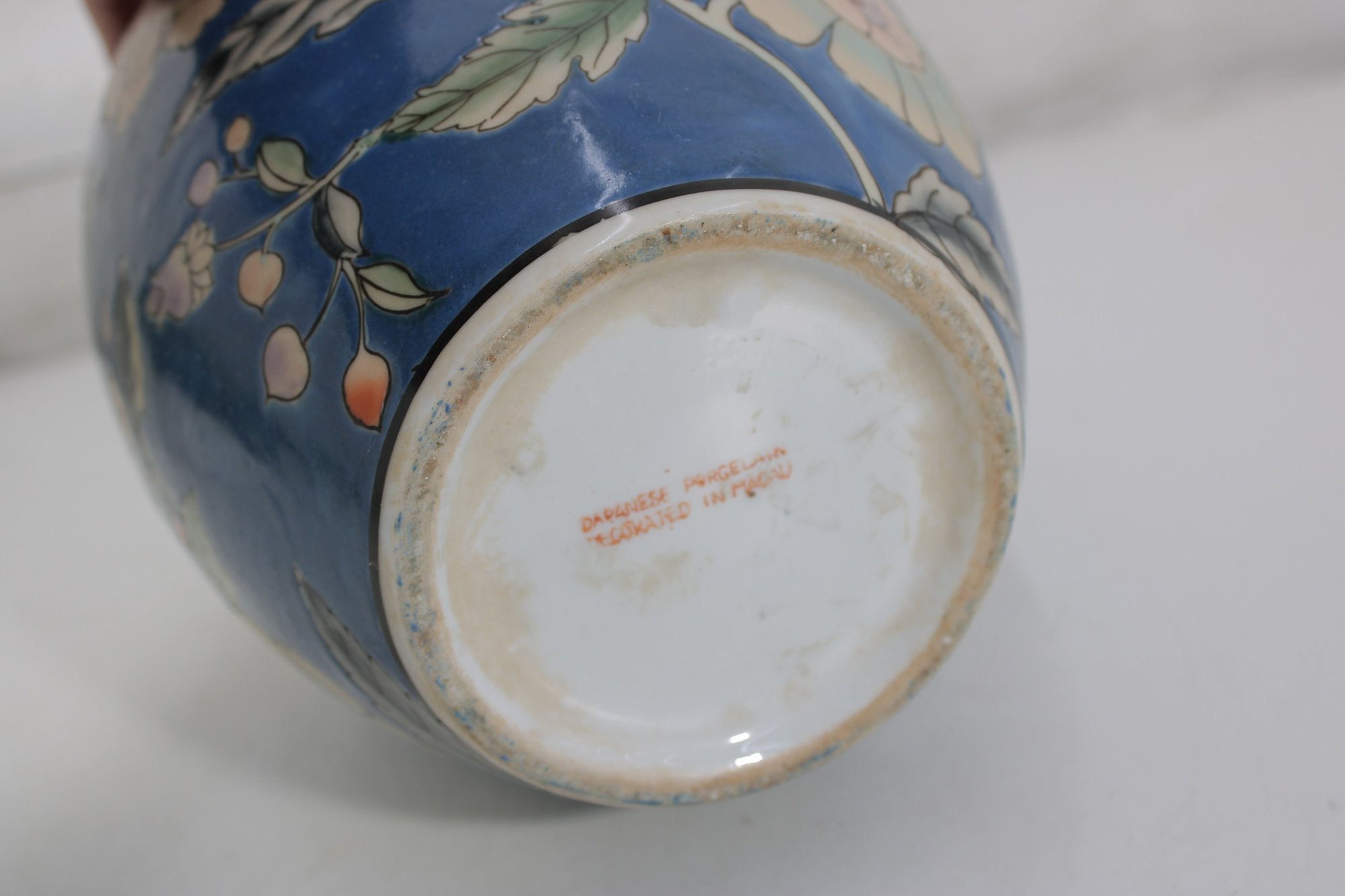 The rounded form and wide opening make it suitable for floral arrangements or as a standalone decorative accent. The painted design and smooth glazed finish give it a classic, elegant look that works well in traditional, cottage, or vintage-inspired interiors.