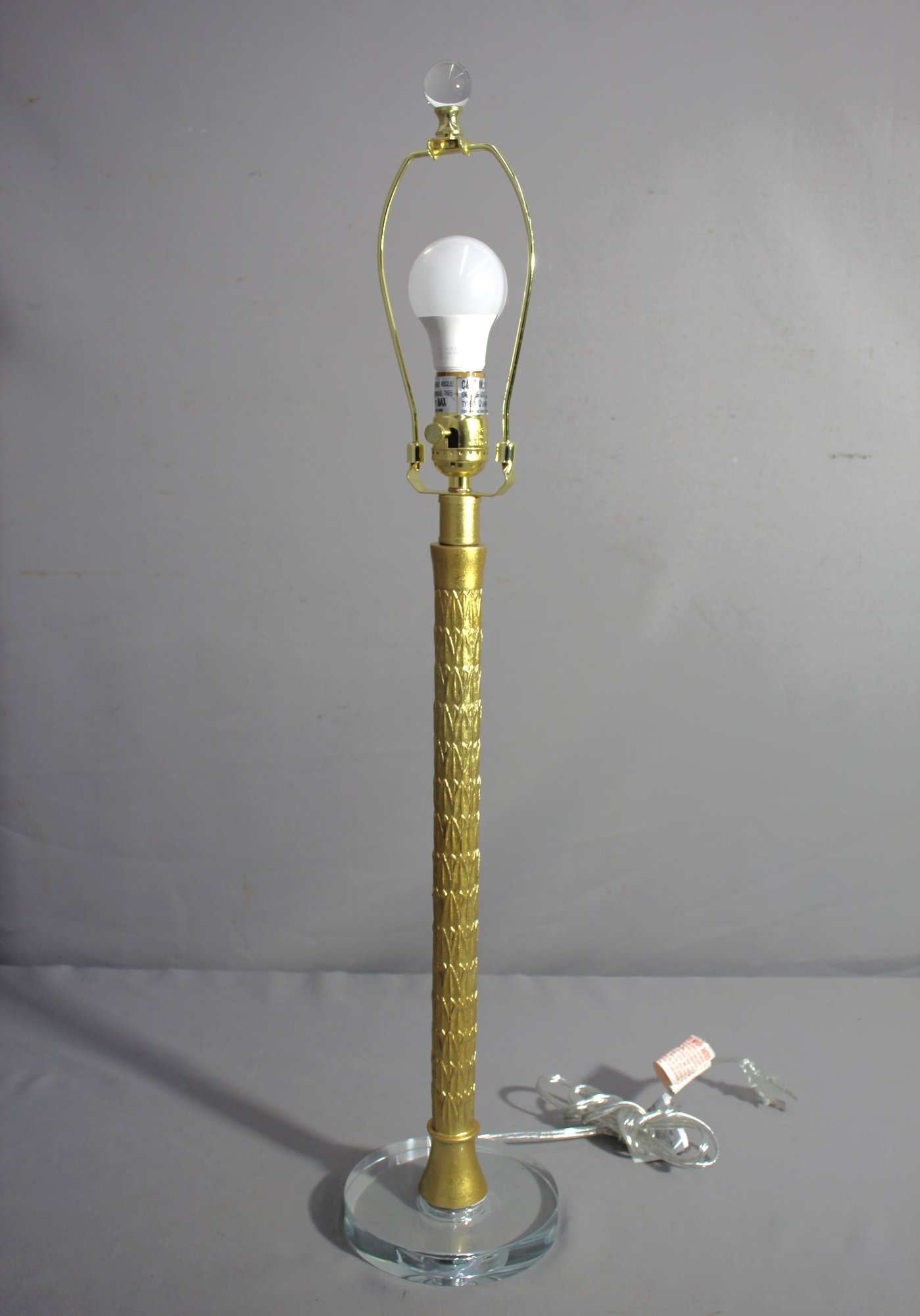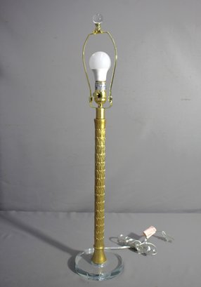 The lamp's design features a sleek, gold-tone brass column with an intricate pattern that captures the light and draws the eye. Resting on a clear glass base
