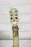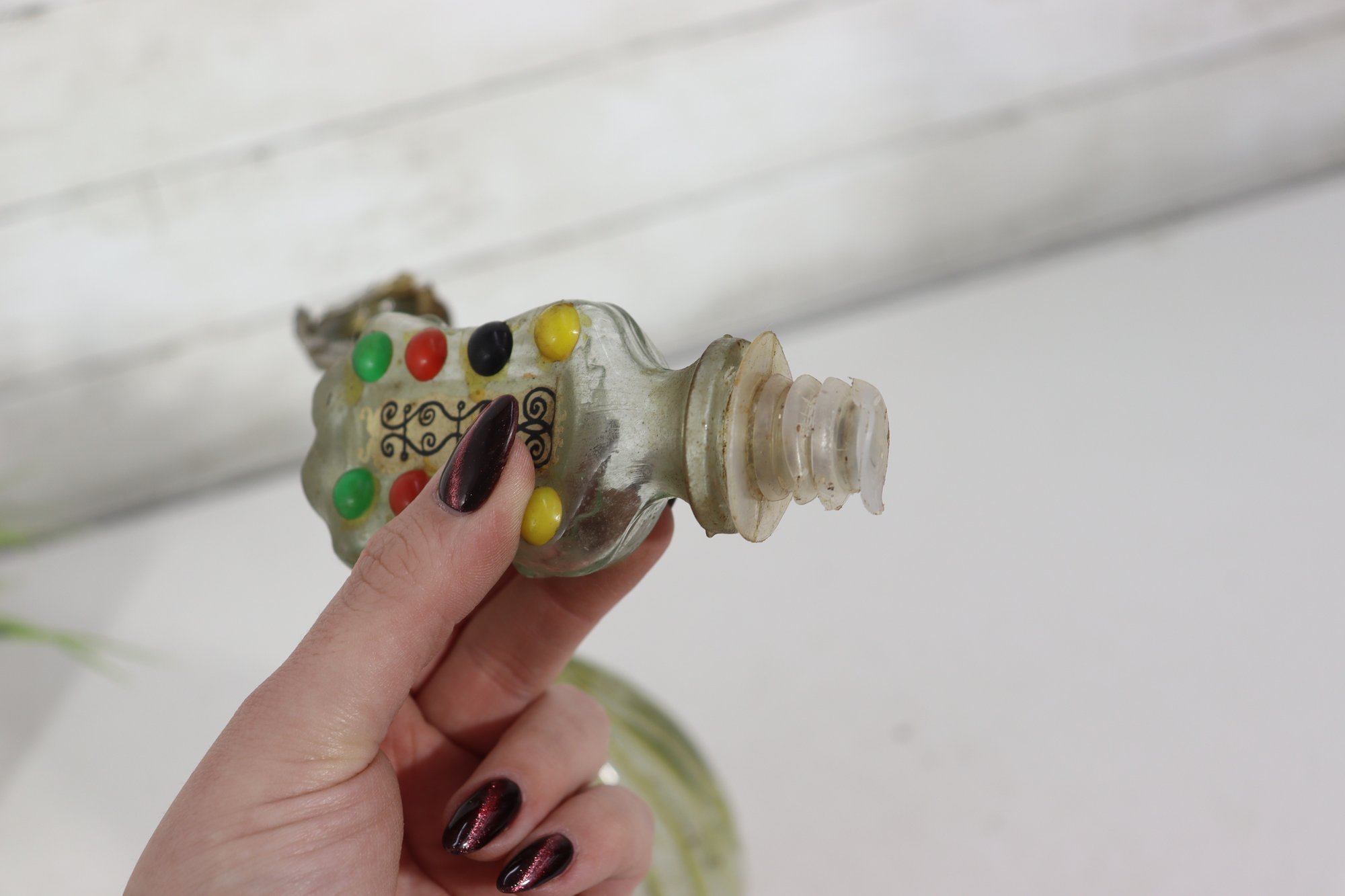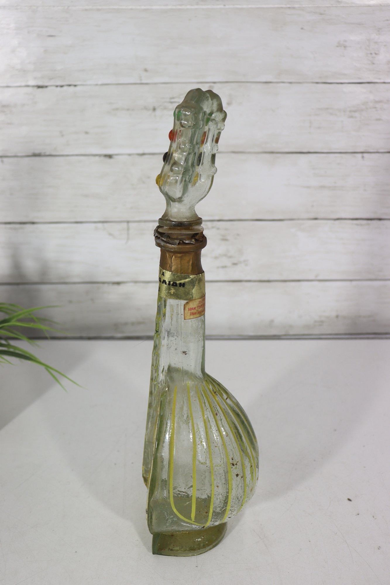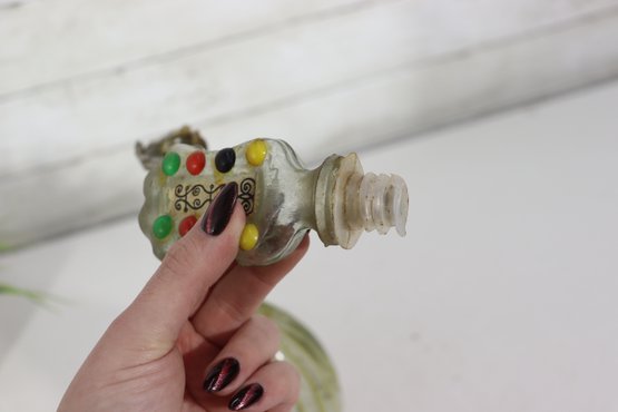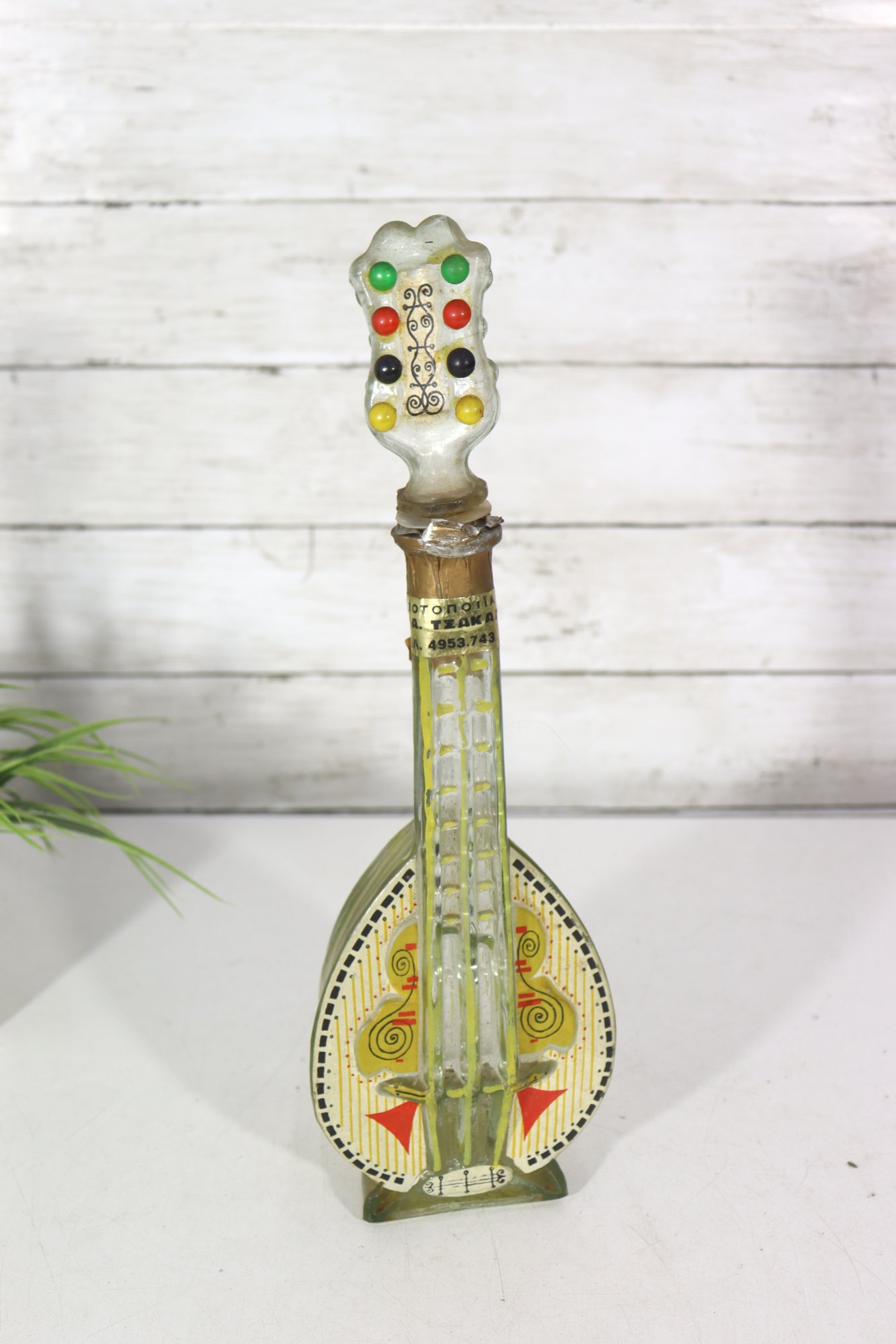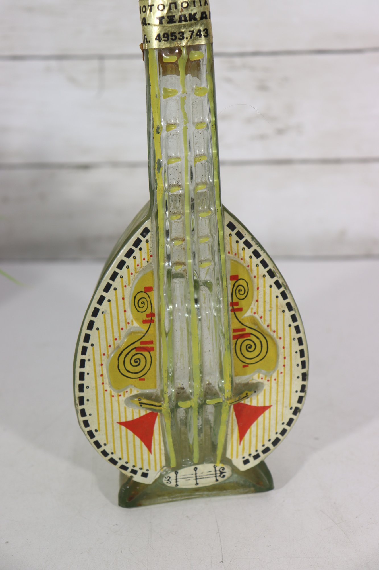 The sculptural form, combined with painted decoration and molded glass details, makes this an eye-catching decorative object suitable for display in an eclectic, folk art, or music-themed collection.