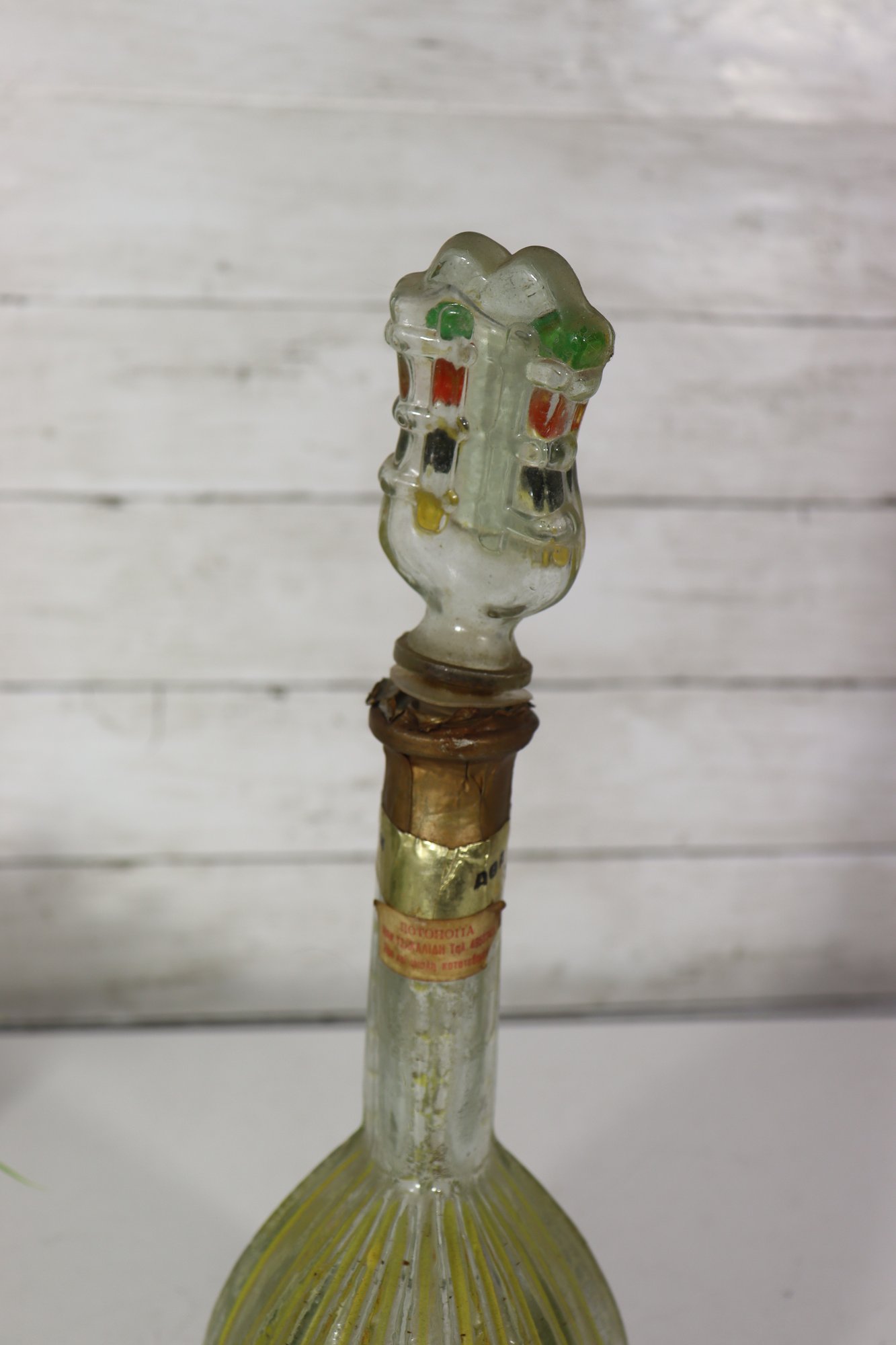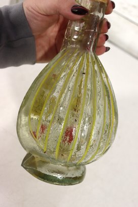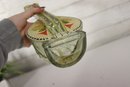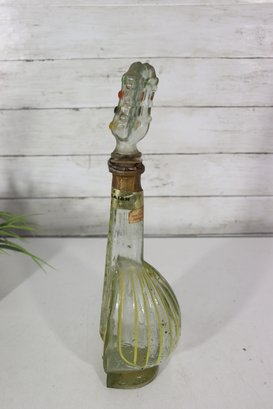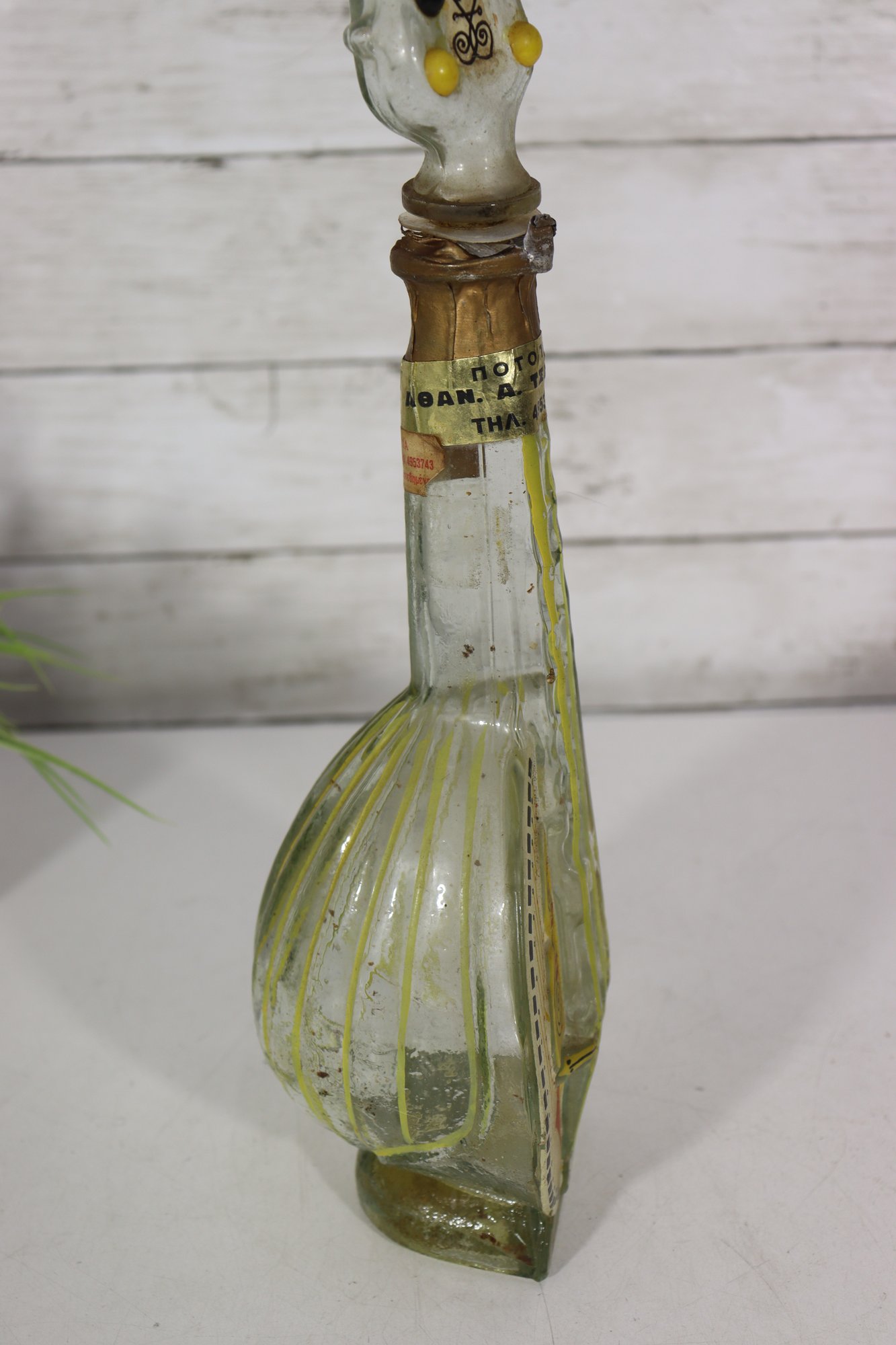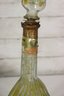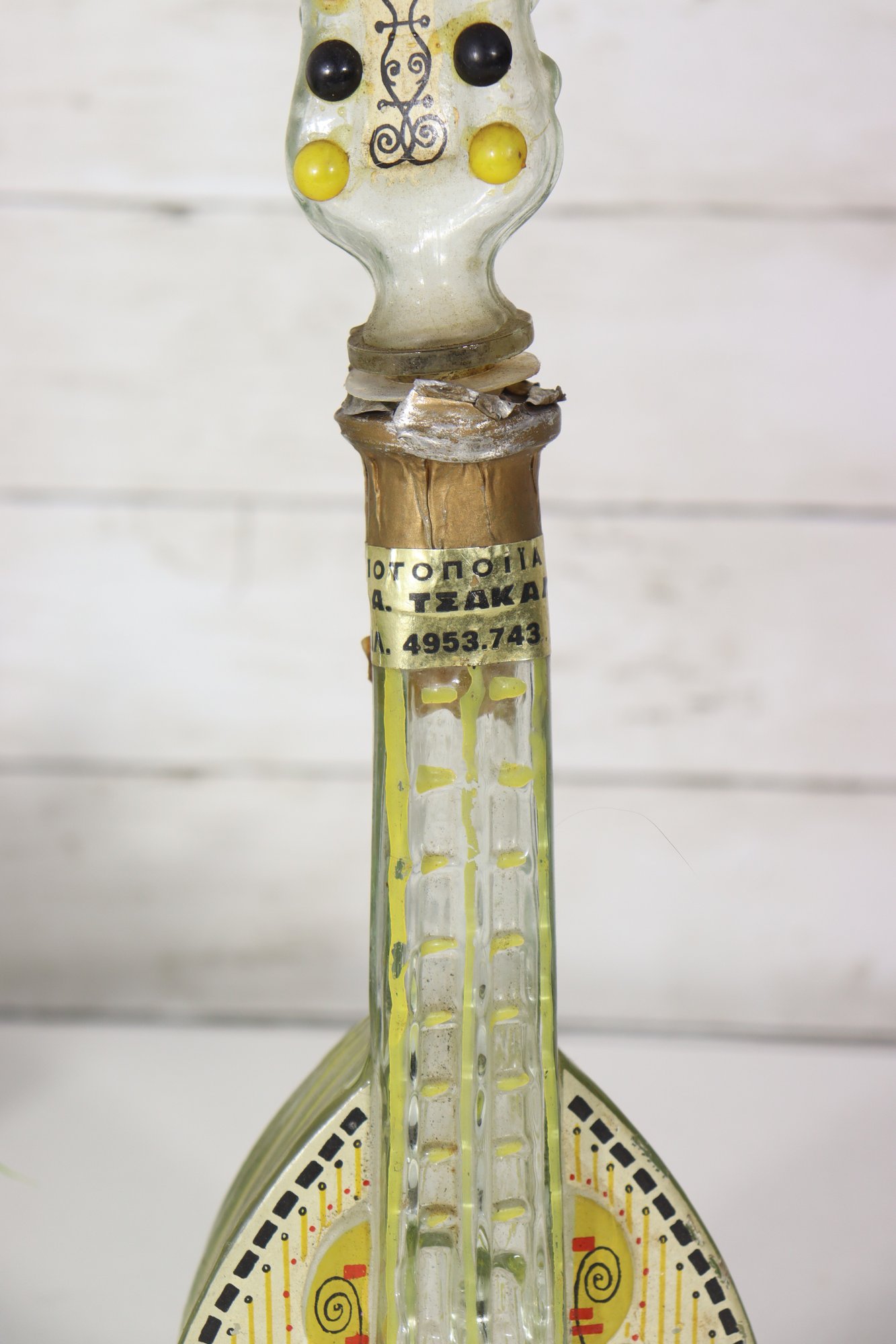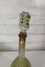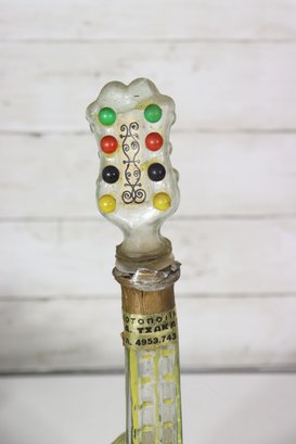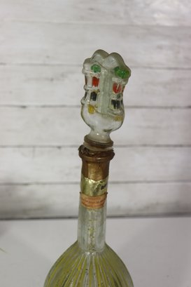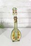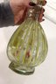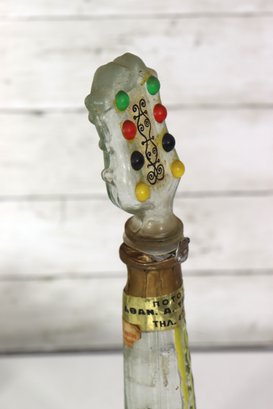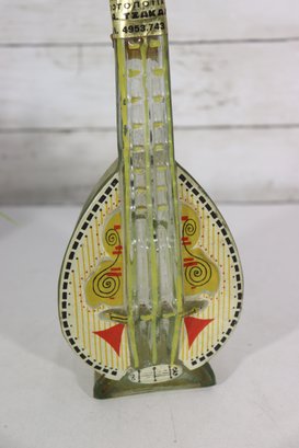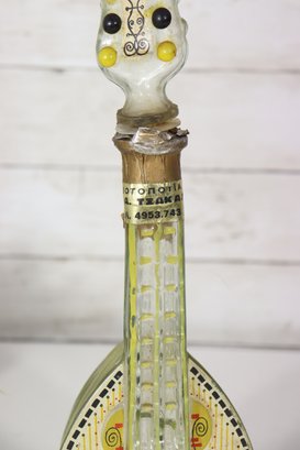 a unique decorative glass bottle formed in the shape of a stringed musical instrument, featuring hand-painted detailing and an expressive figural stopper at the top. The piece displays a translucent green glass body with painted geometric and folk-style motifs on the front, creating a striking and whimsical presentation.