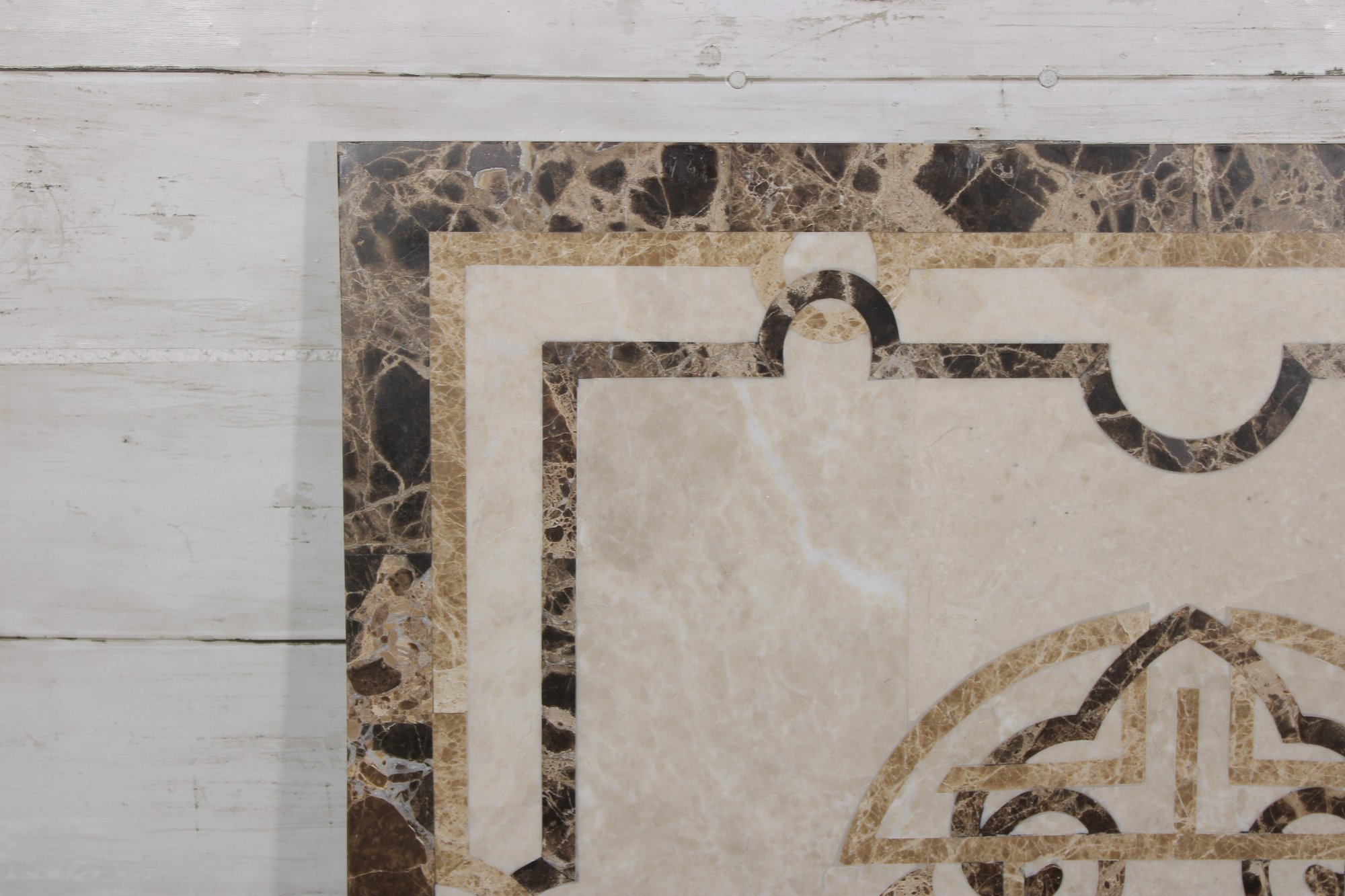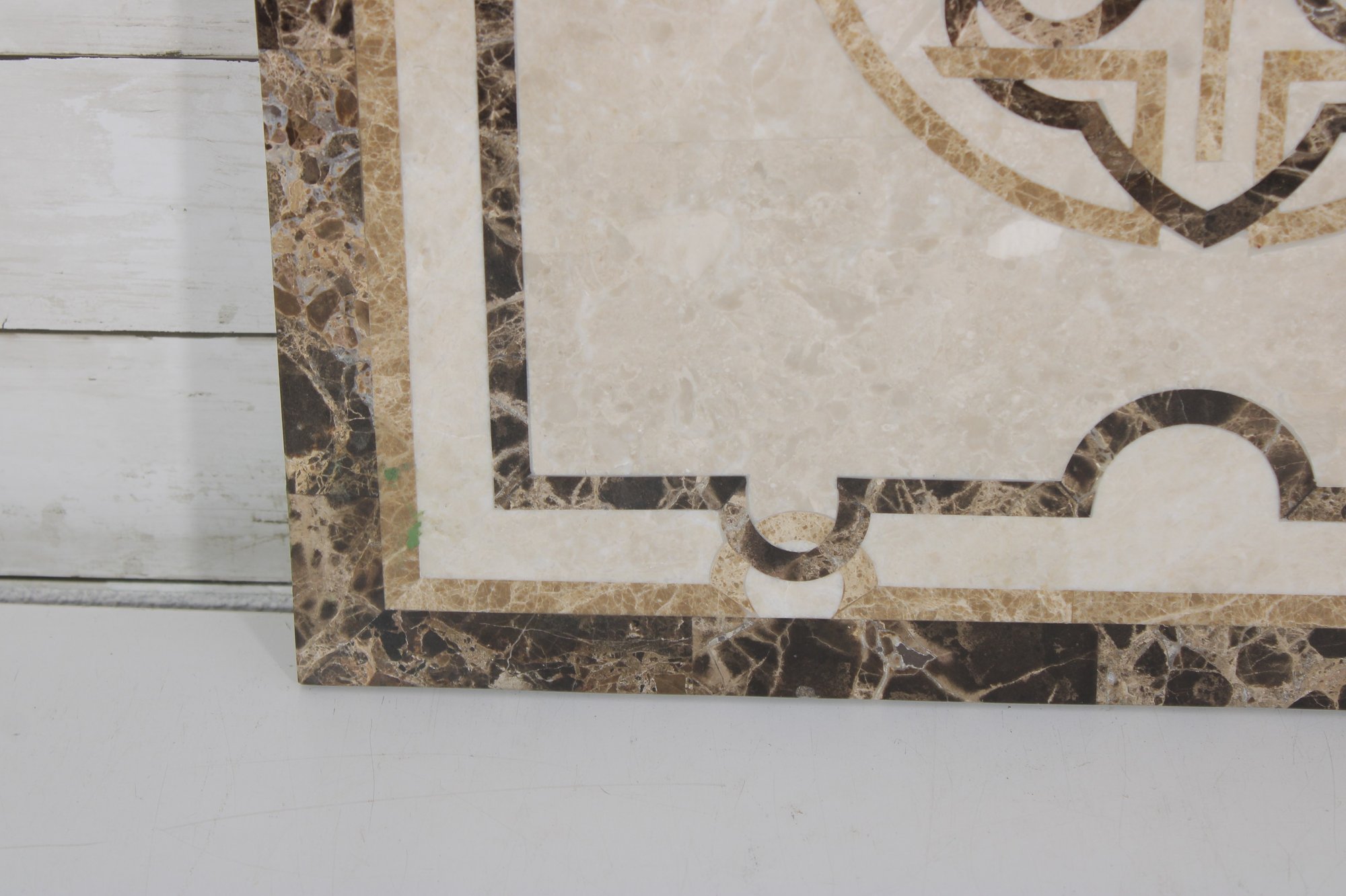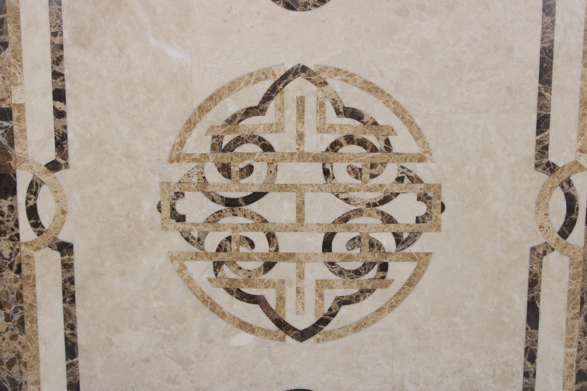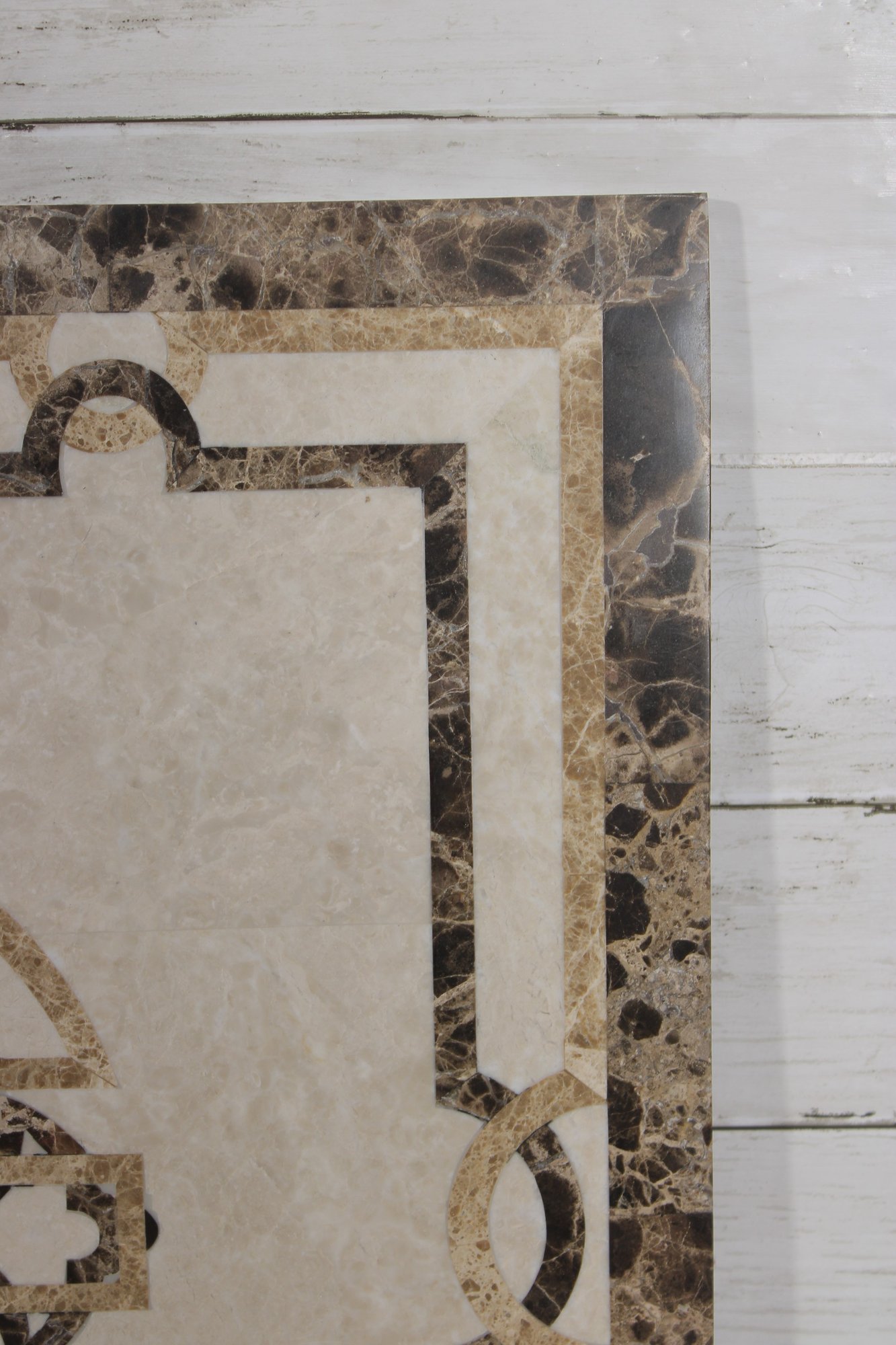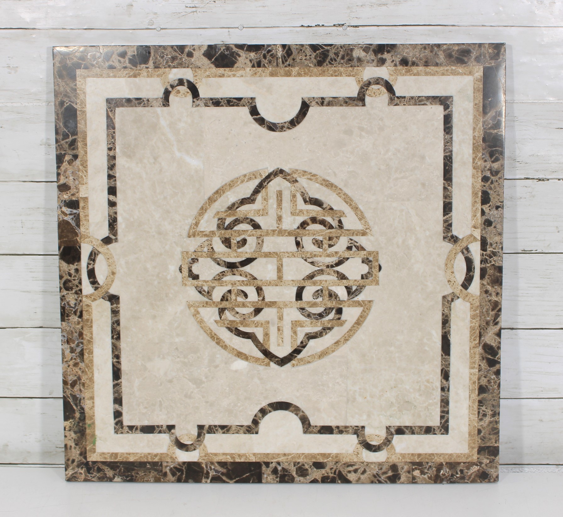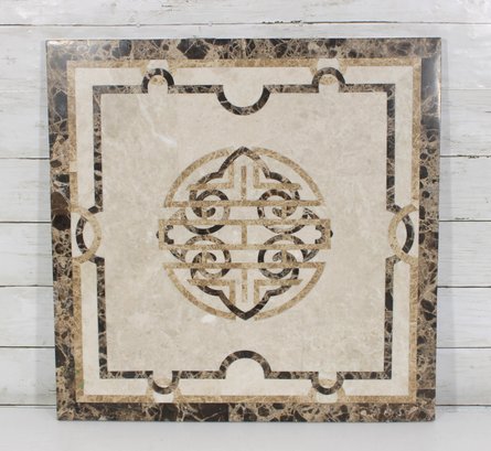 This solid stone piece showcases a neutral cream-toned center with intricate inlaid patterns in darker marble, framed by a richly veined border. The symmetrical design and natural stone variation give it a high-end, classic look suitable for a variety of uses.