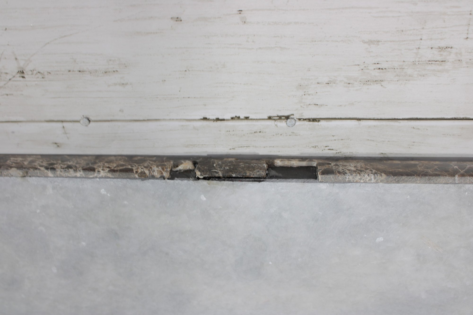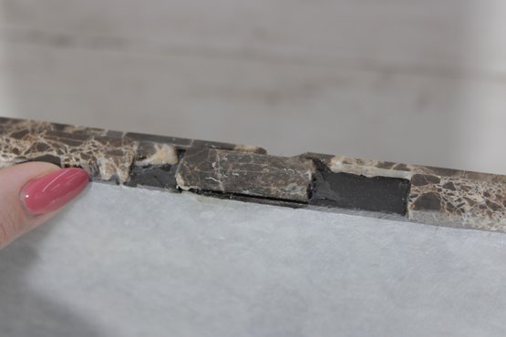 Pre-owned condition. The surface is in good overall shape with typical light wear. There is a visible edge chip/repair area (see close-up photo), along with minor imperfections consistent with use. Back shows standard unfinished stone backing.
