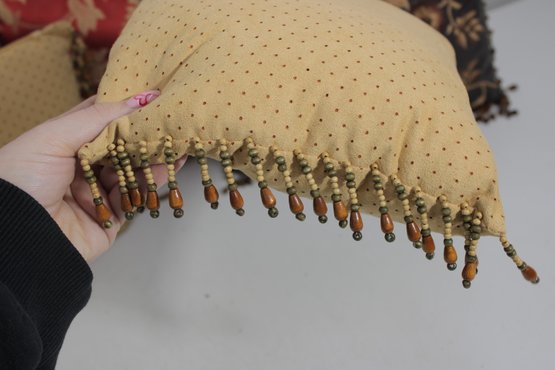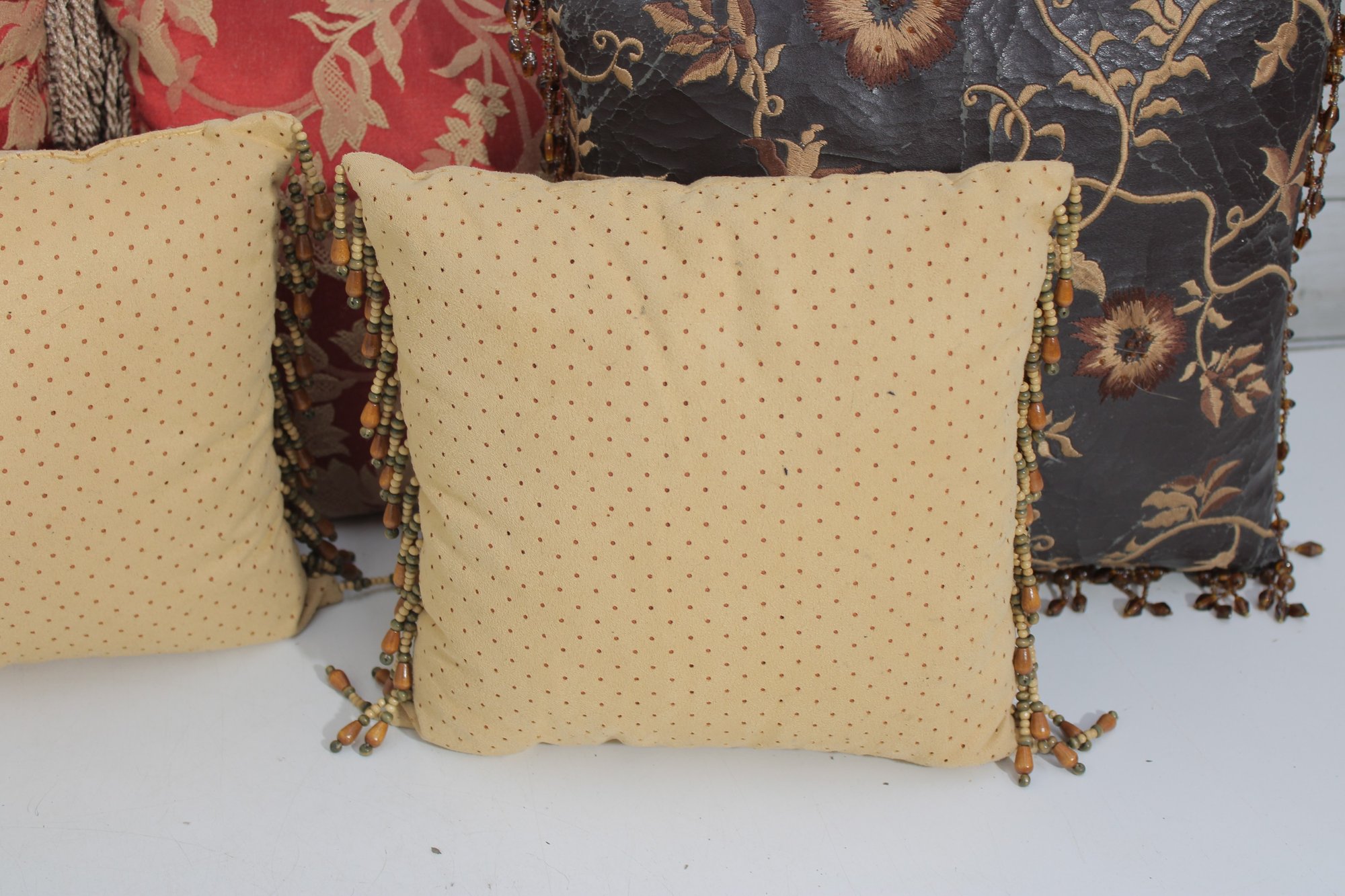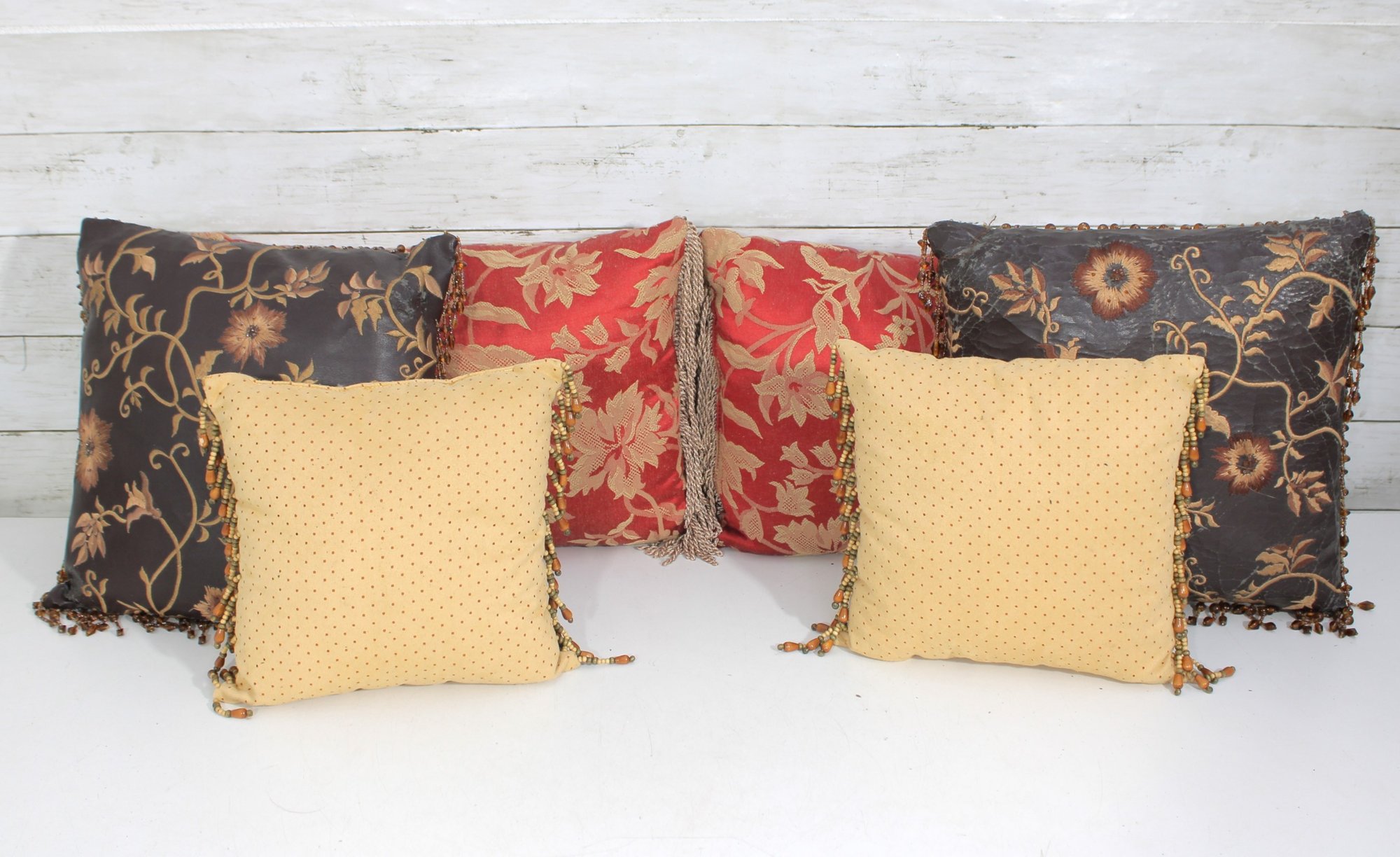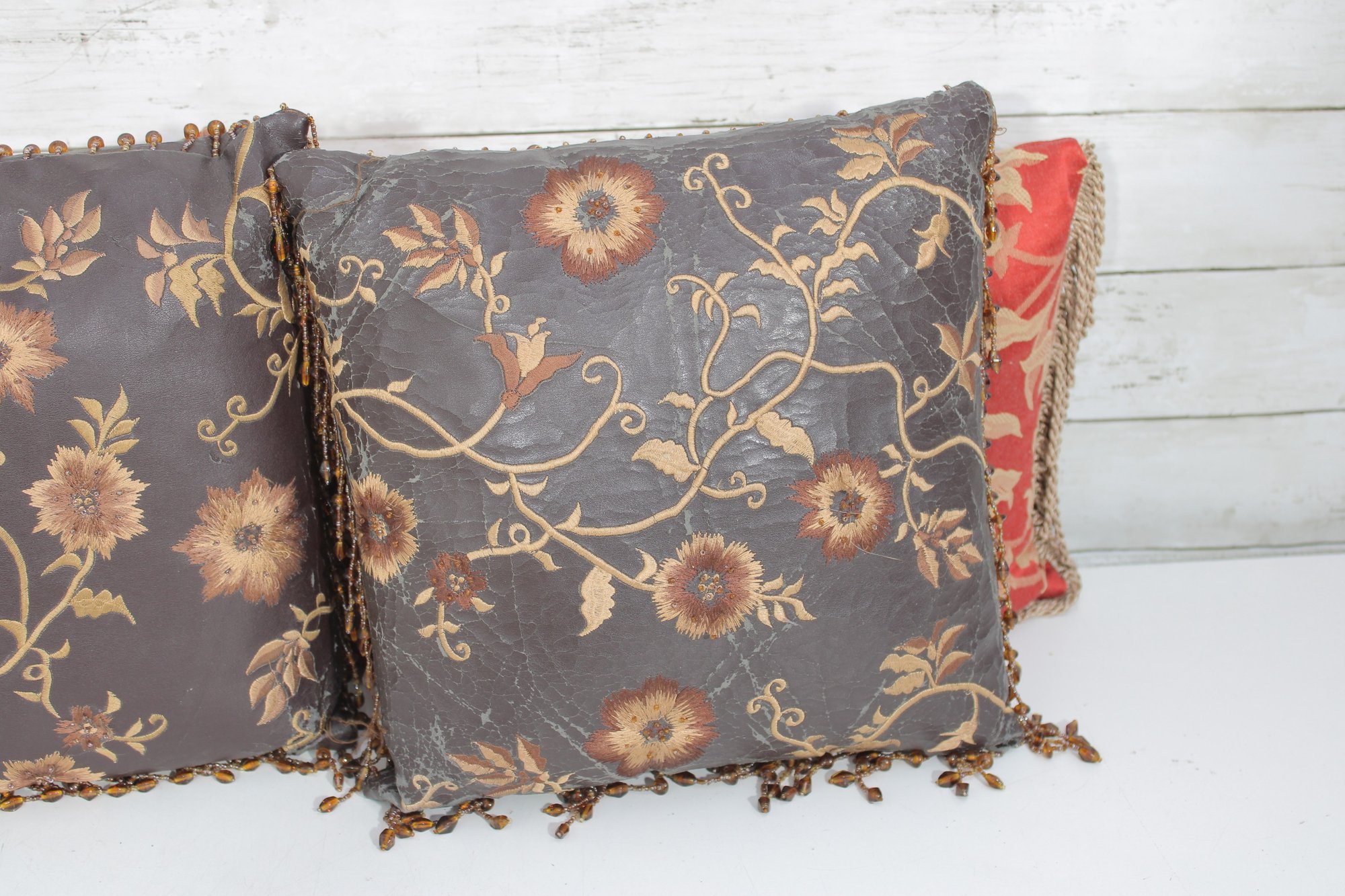 Add rich texture and layered style to your décor with this coordinated collection of decorative throw pillows. This set features a mix of floral patterns and solid accent pillows, some trimmed with charming beaded fringe for added visual interest and character.