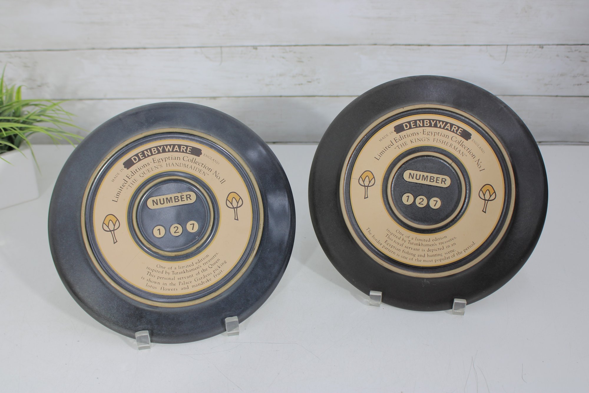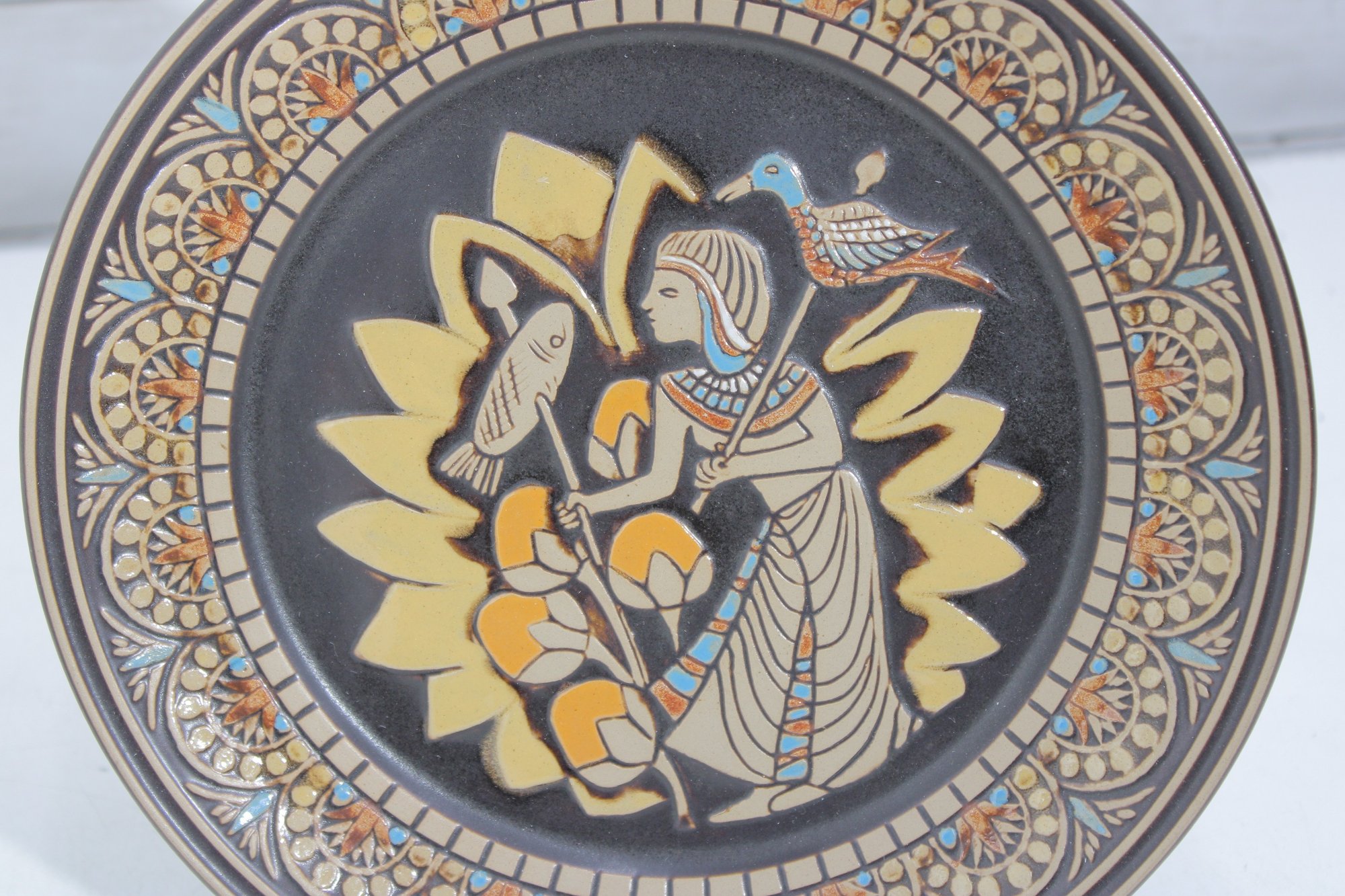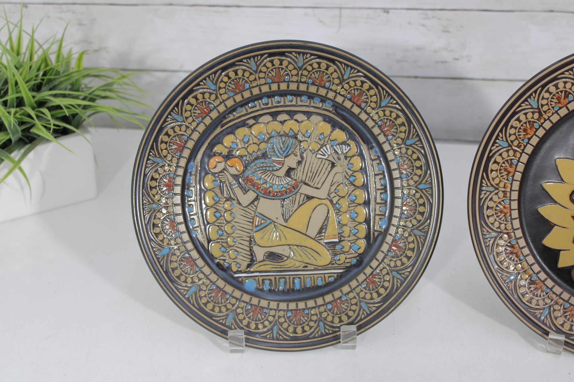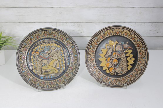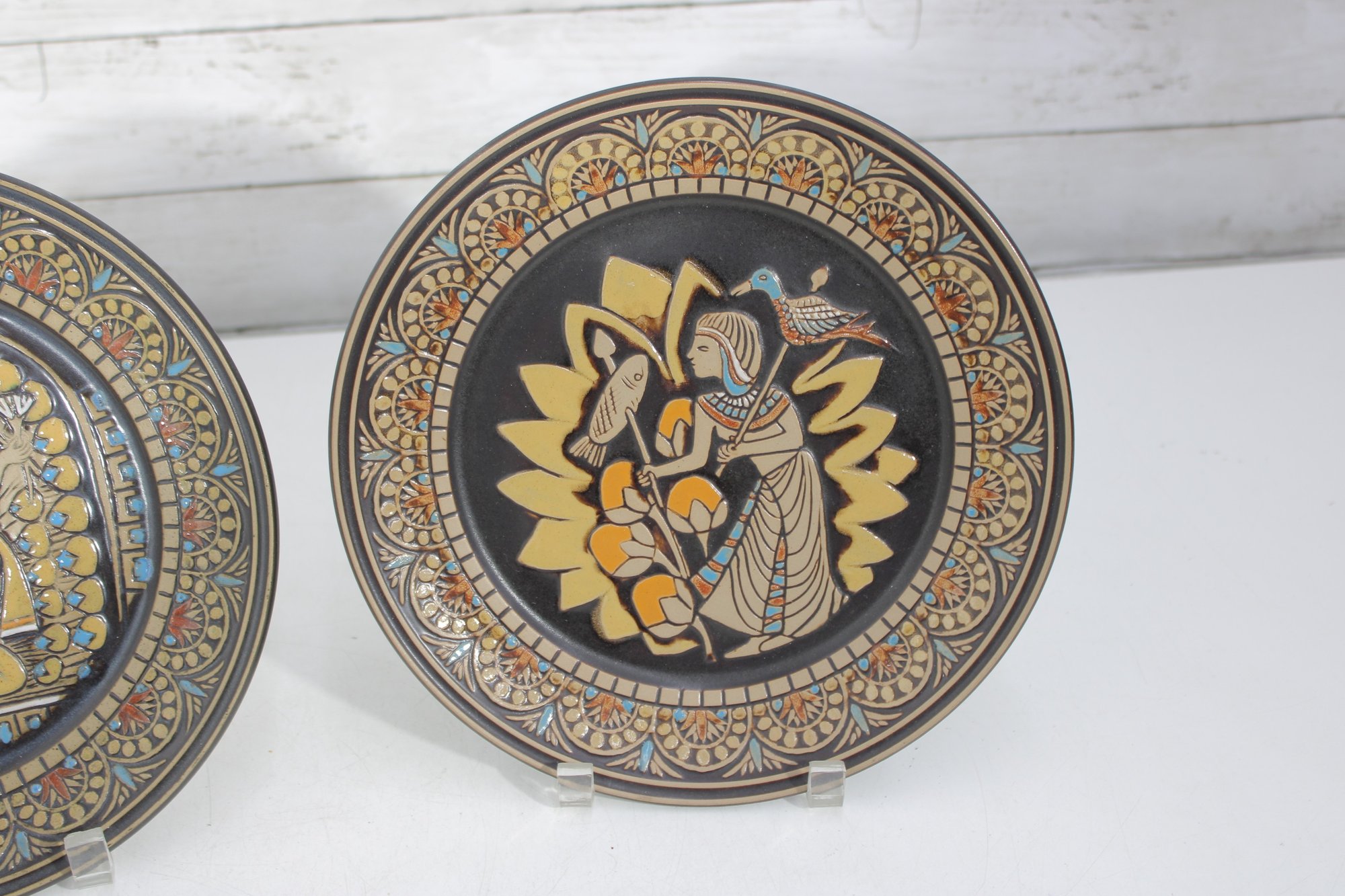 a pair of Denbyware decorative plates from the Egyptian Collection, featuring stylized ancient Egyptian–inspired figures and intricate geometric border designs. The plates display rich earth tones with gold, blue, and terracotta accents, creating a striking and graphic presentation.