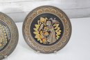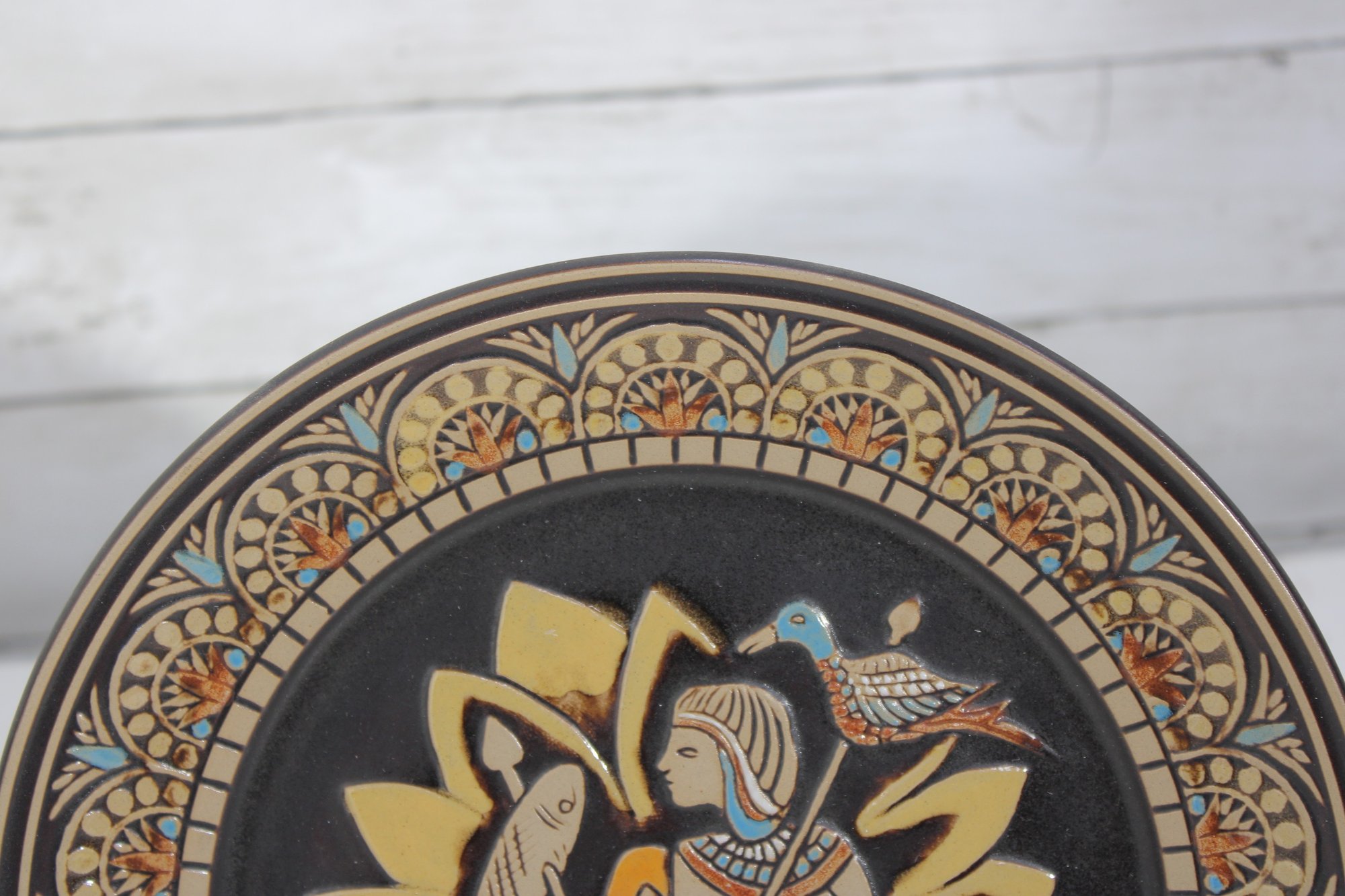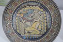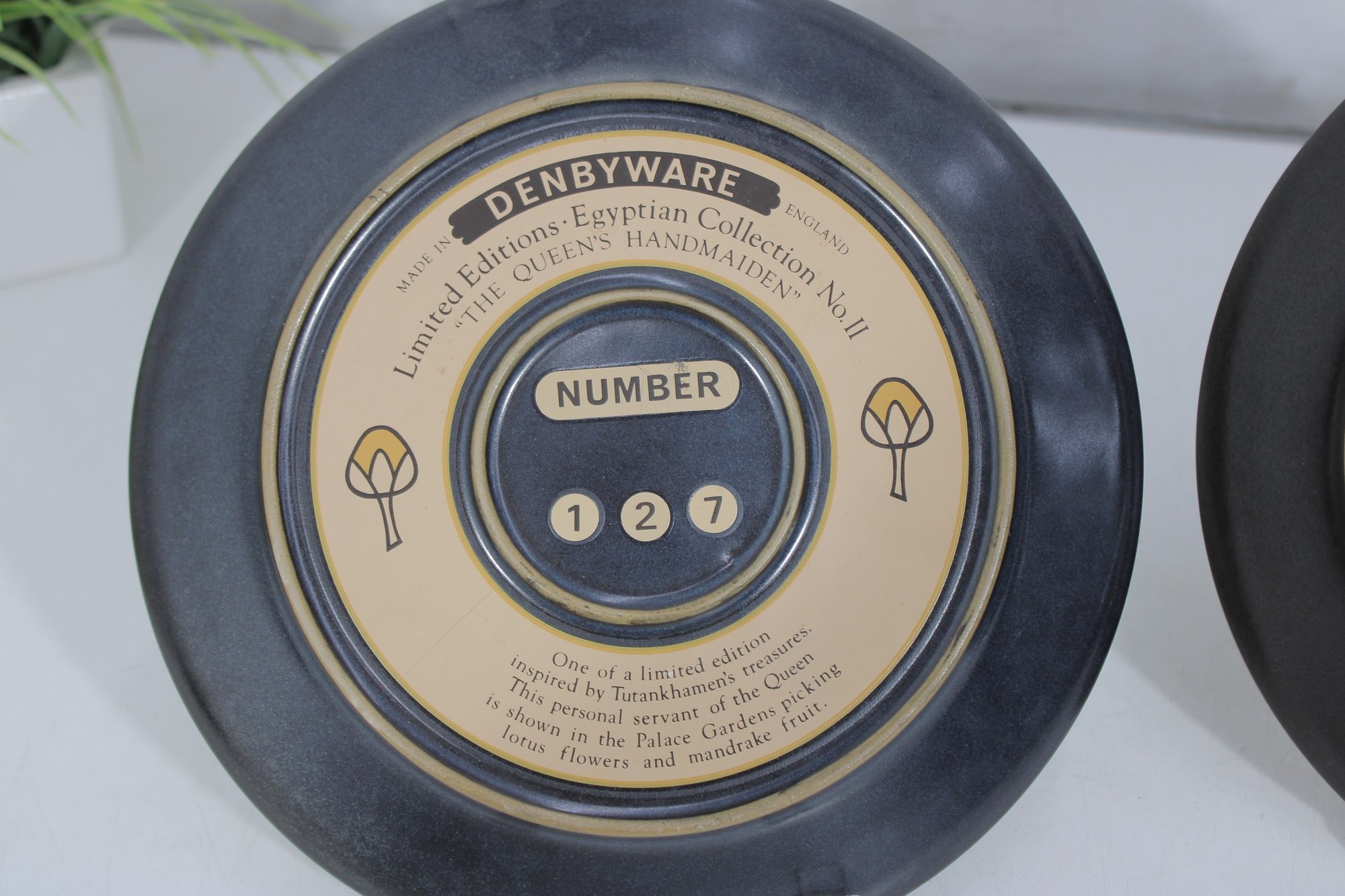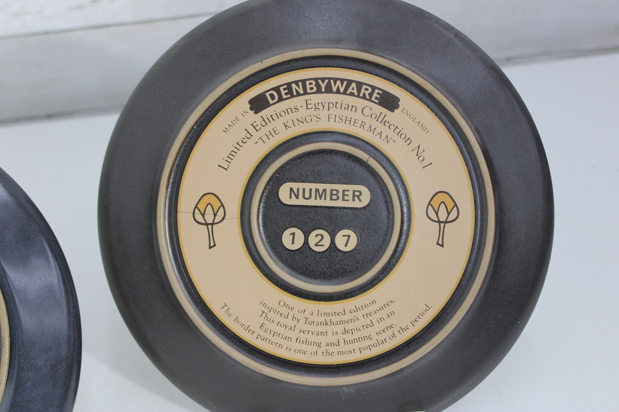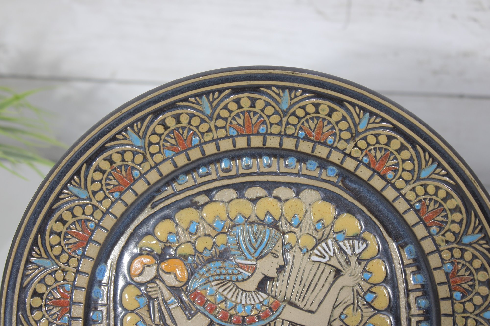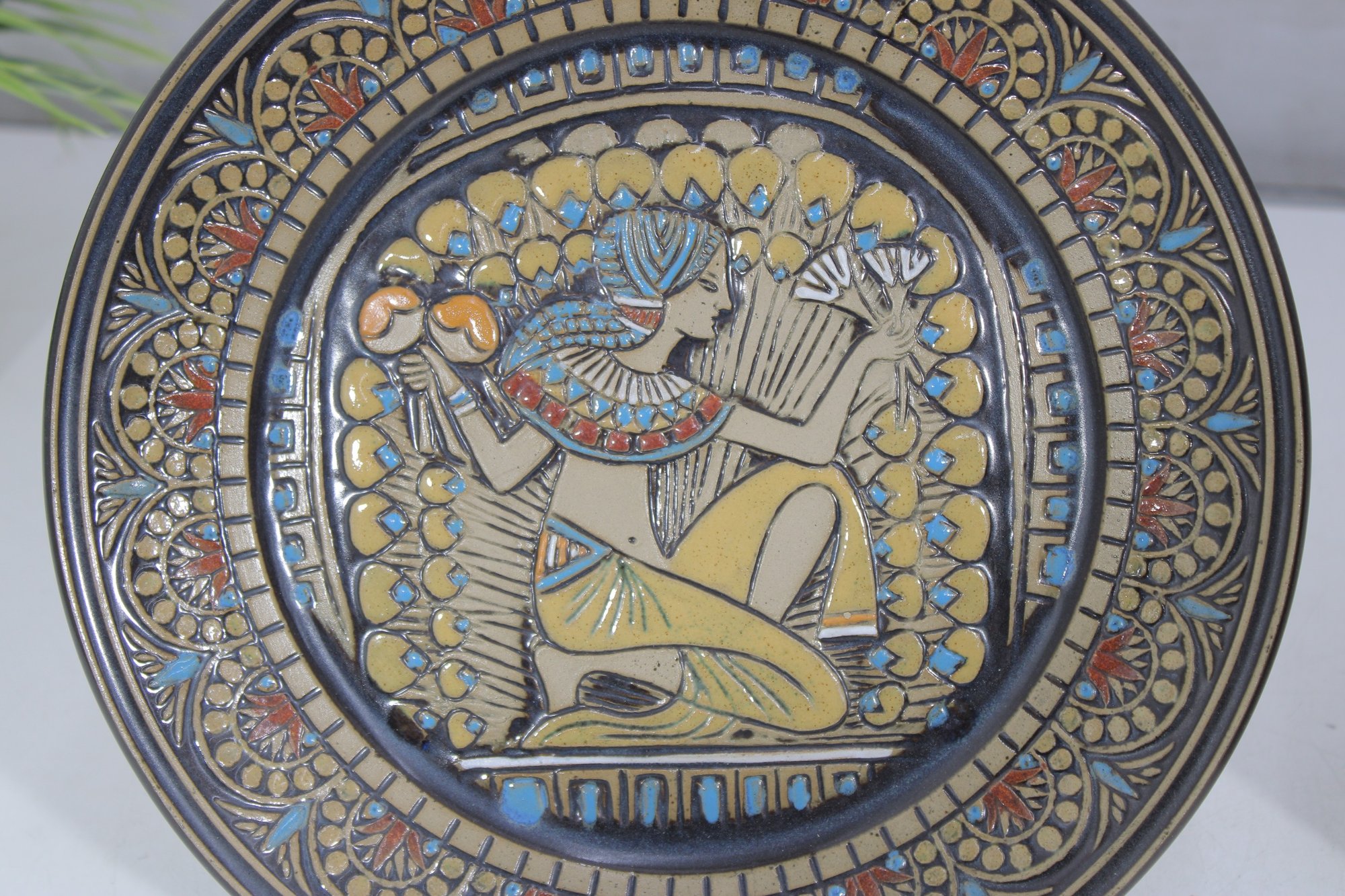 a pair of Denbyware decorative plates from the Egyptian Collection, featuring stylized ancient Egyptian–inspired figures and intricate geometric border designs. The plates display rich earth tones with gold, blue, and terracotta accents, creating a striking and graphic presentation.