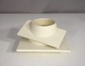 Striking and unique porcelain cup and saucer set by Derek Northfield, showcasing a bold Art Deco-inspired design. The angular square forms and clean white glaze offer a sculptural aesthetic that blends functionality with artistry. Each piece is signed by the artist on the base.