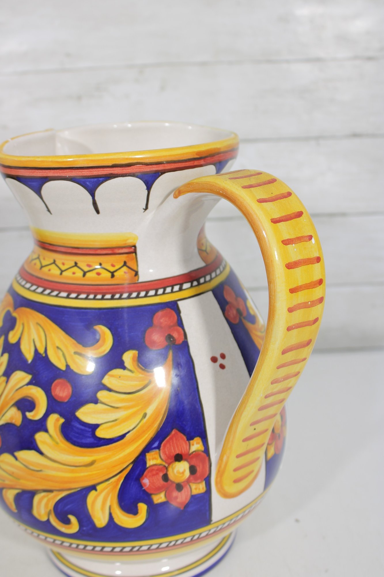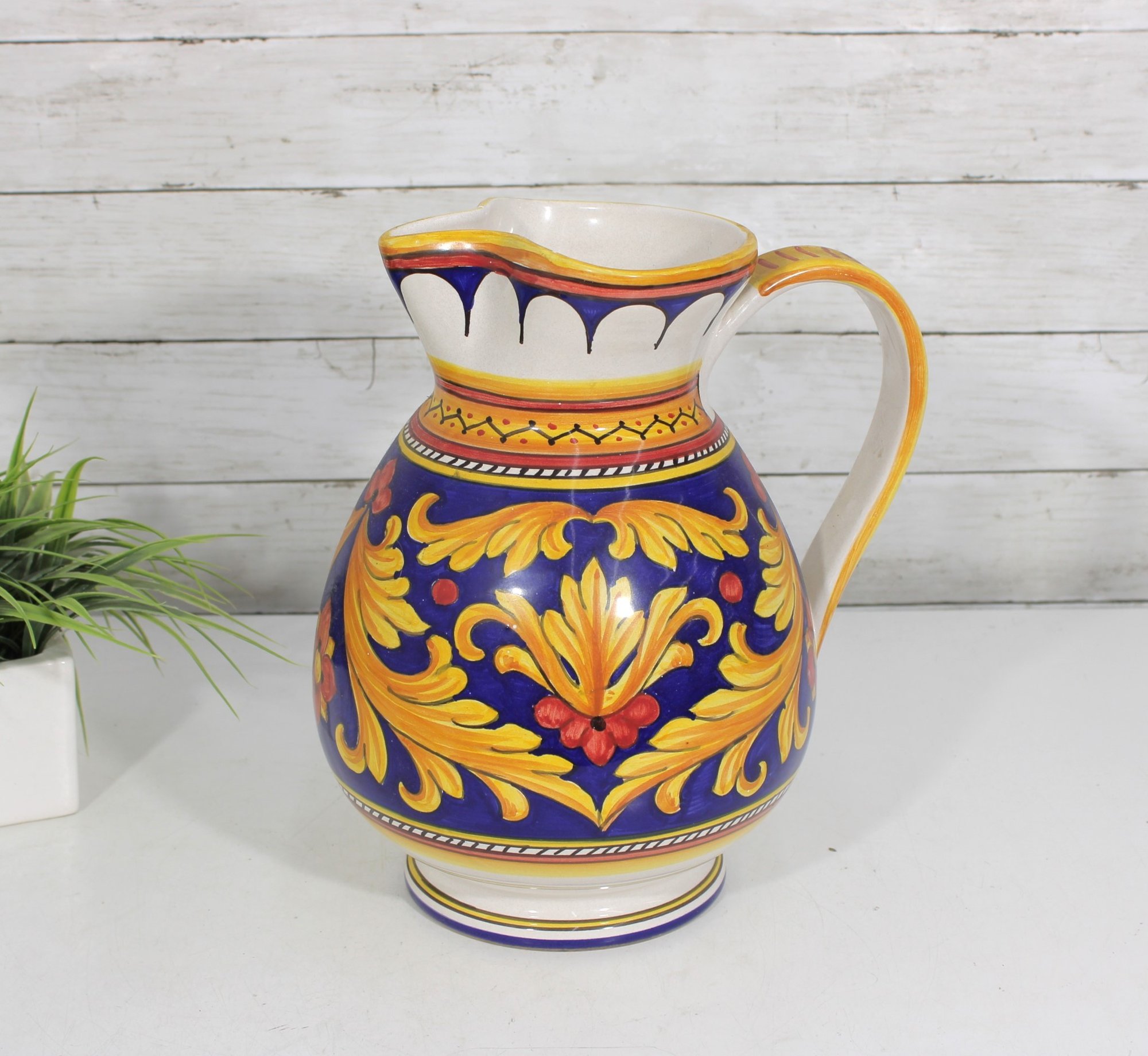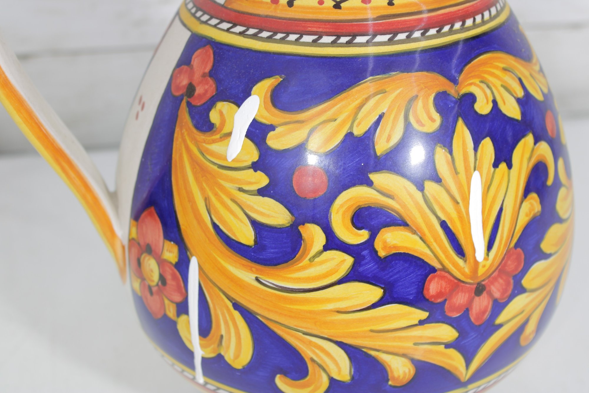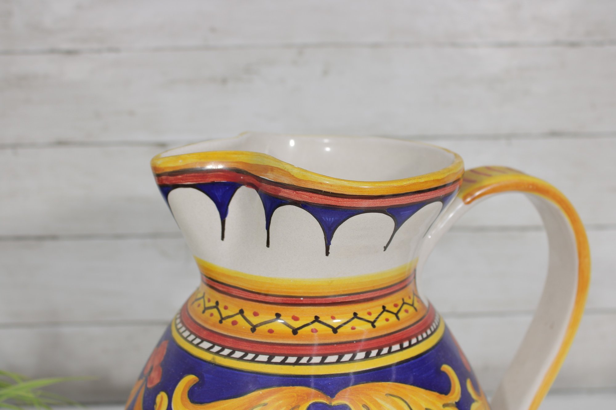 Vibrant hand-painted majolica pitcher from Deruta, Italy, showcasing the region’s renowned ceramic artistry. This eye-catching piece features a rich cobalt blue ground adorned with bold yellow and red scrolling floral motifs, accented by crisp decorative borders and a warm yellow handle.