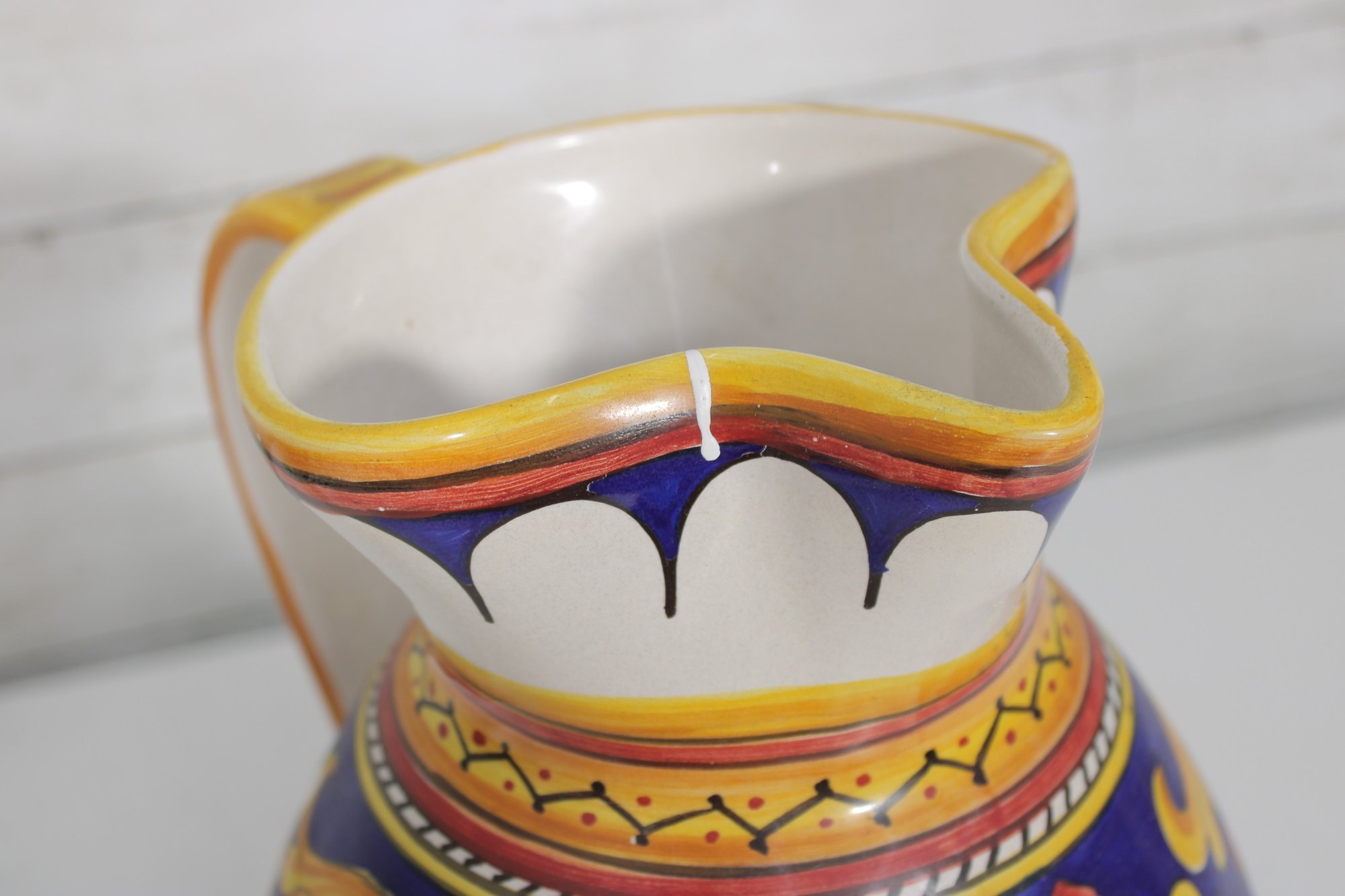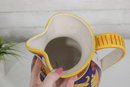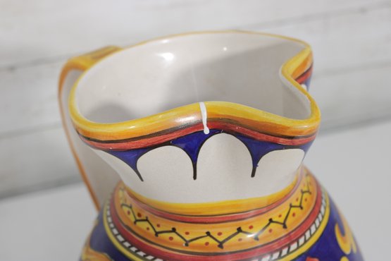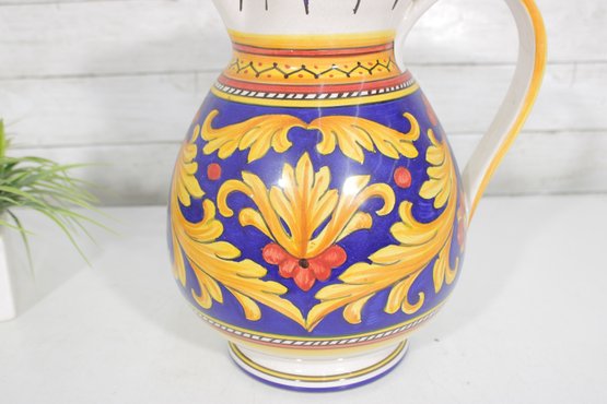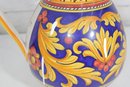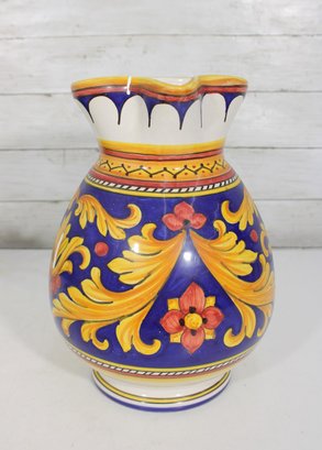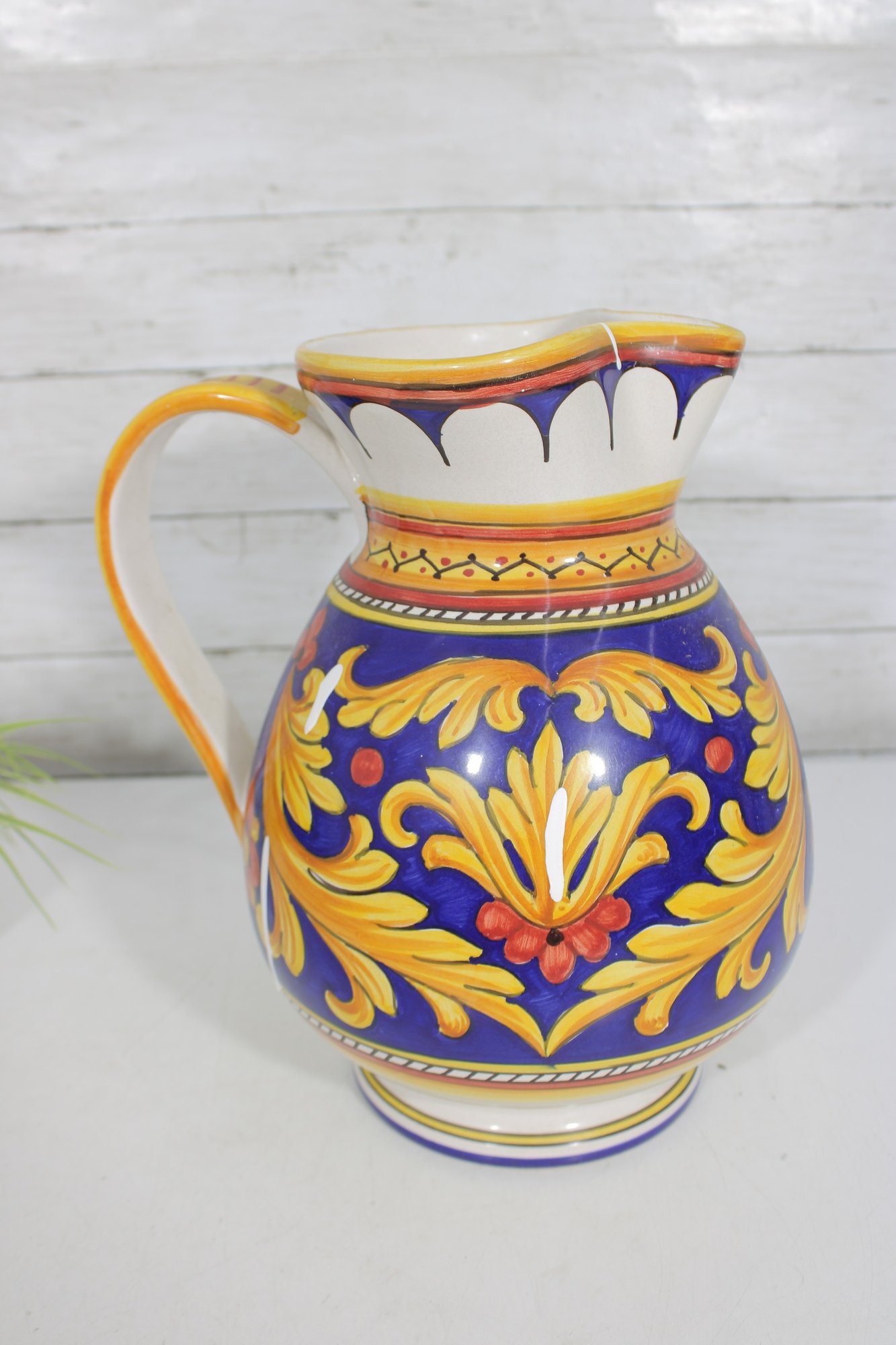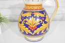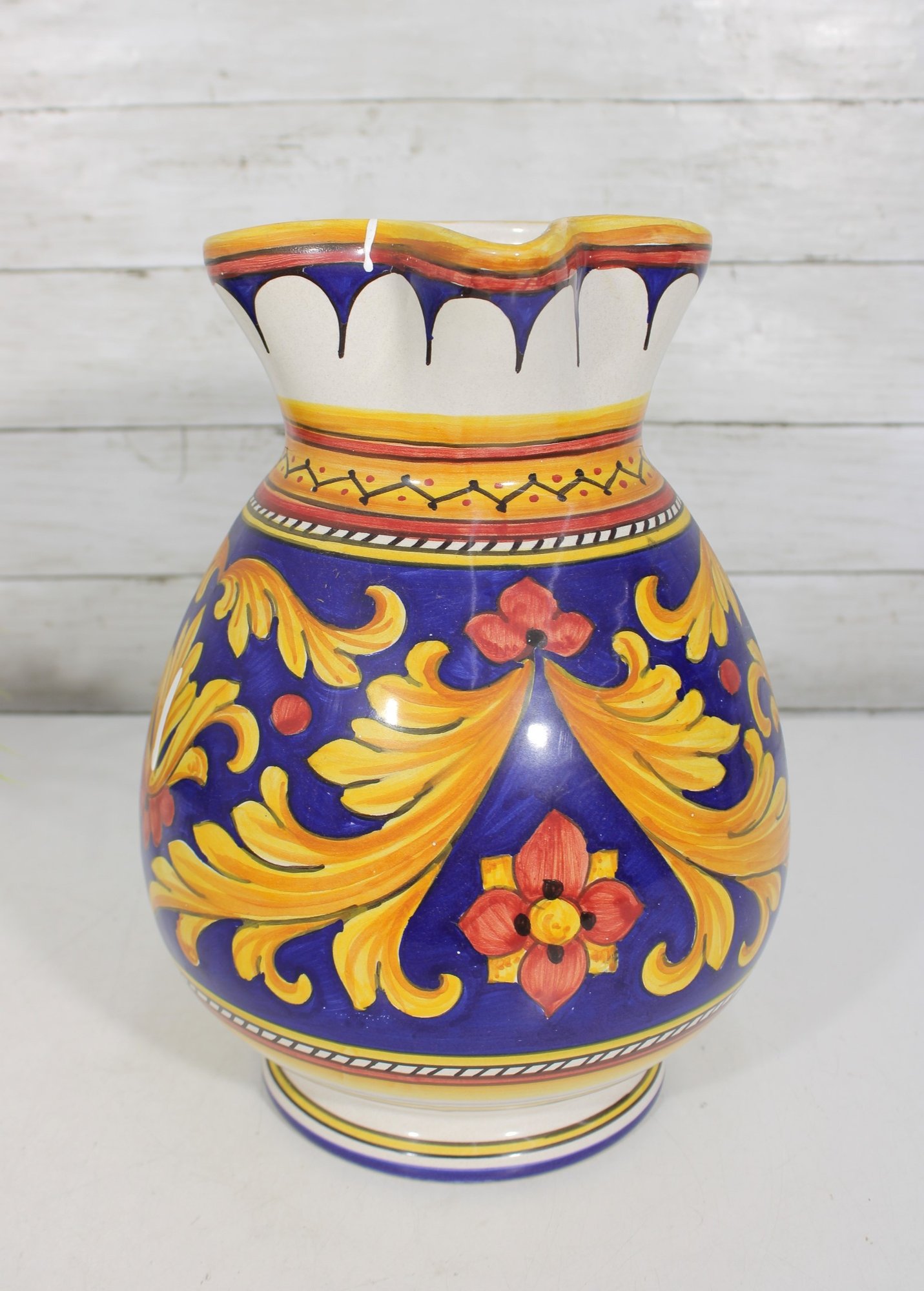 Vibrant hand-painted majolica pitcher from Deruta, Italy, showcasing the region’s renowned ceramic artistry. This eye-catching piece features a rich cobalt blue ground adorned with bold yellow and red scrolling floral motifs, accented by crisp decorative borders and a warm yellow handle.