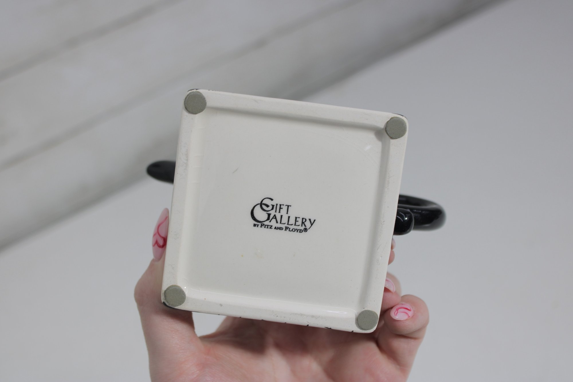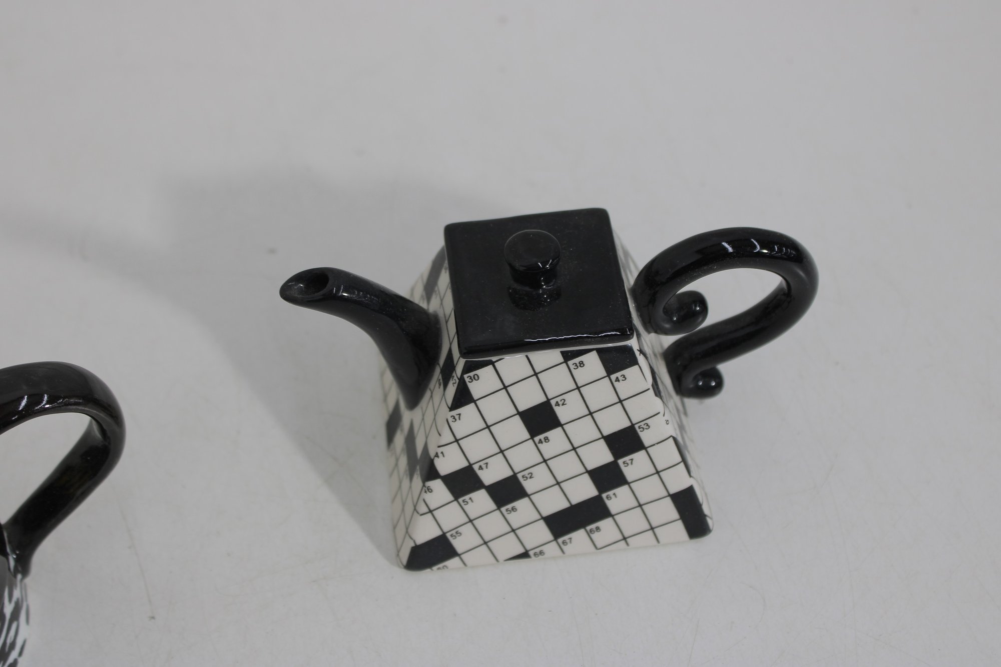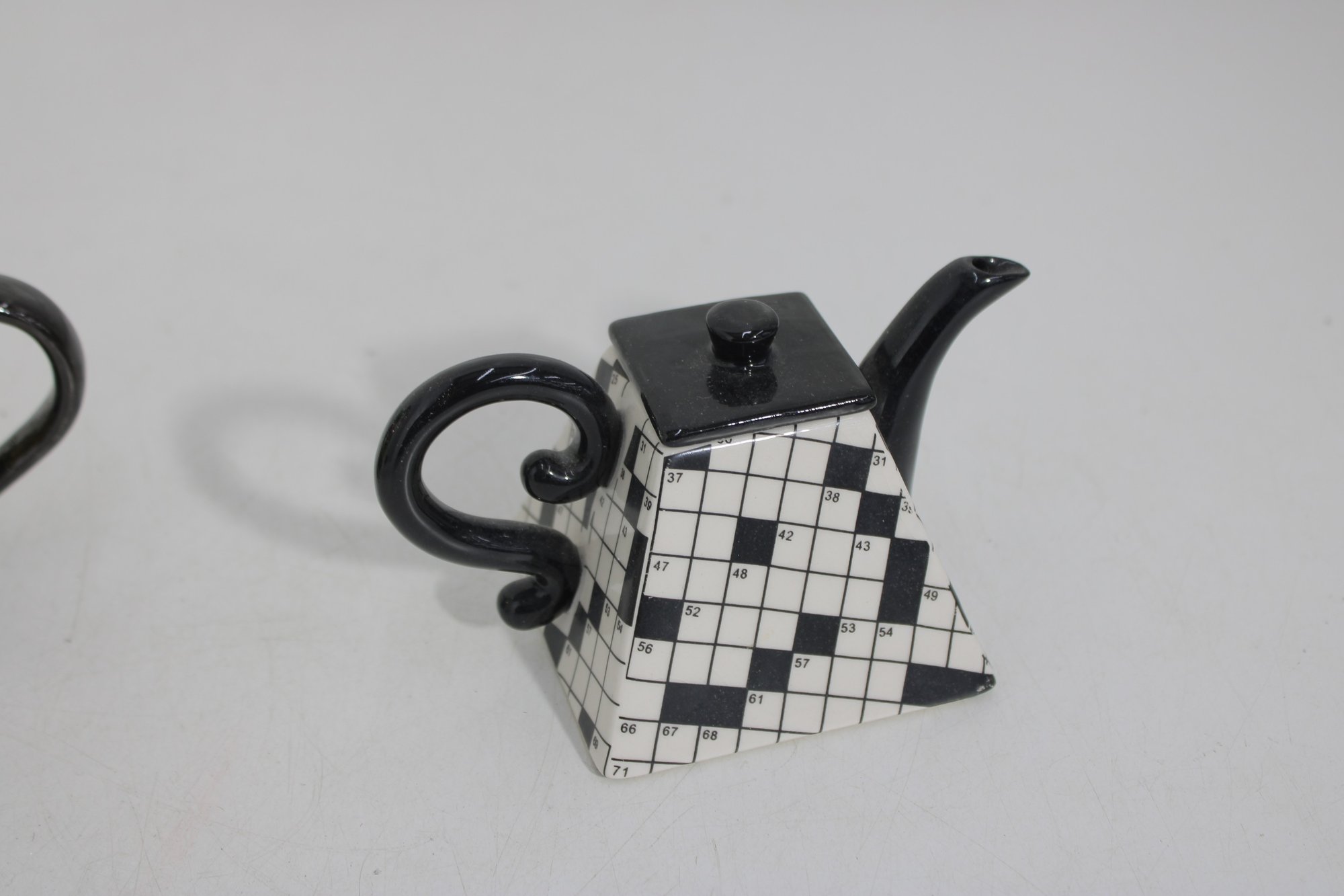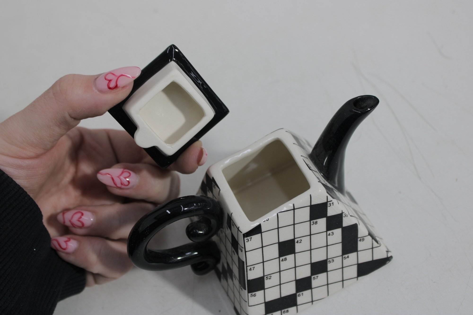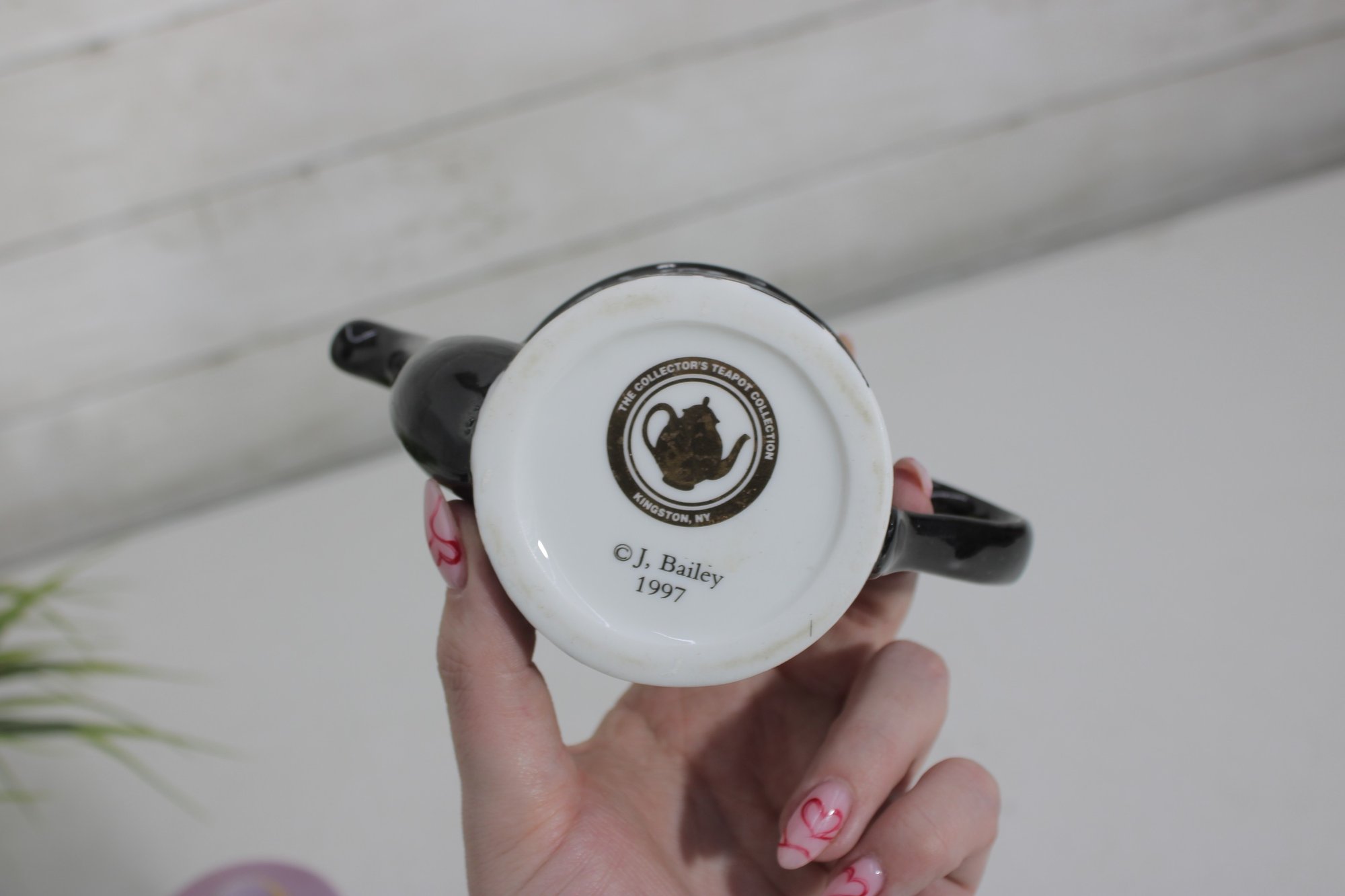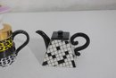 A modern black-and-white geometric teapot marked Art Gallery (approx. 3" tall)