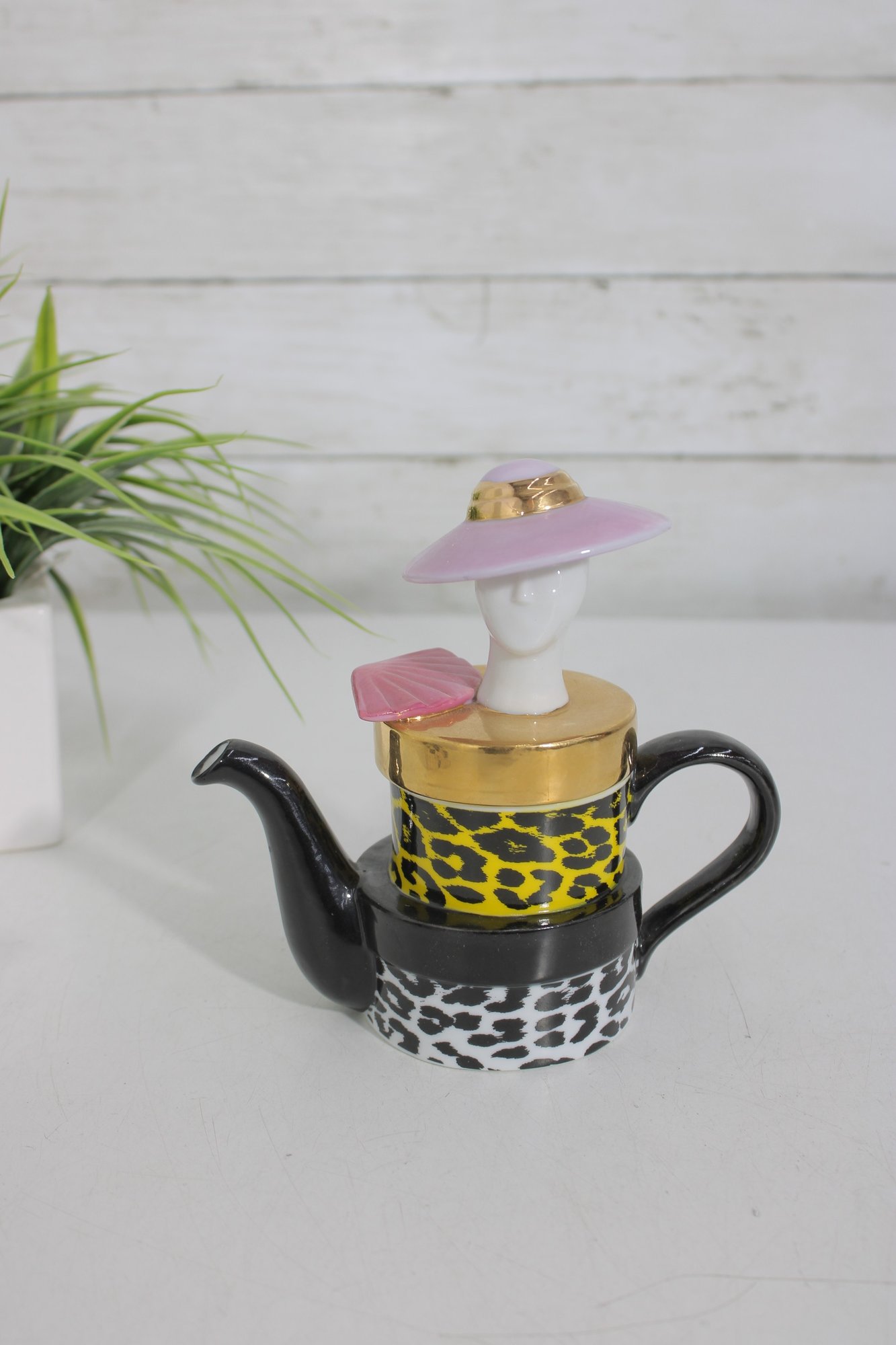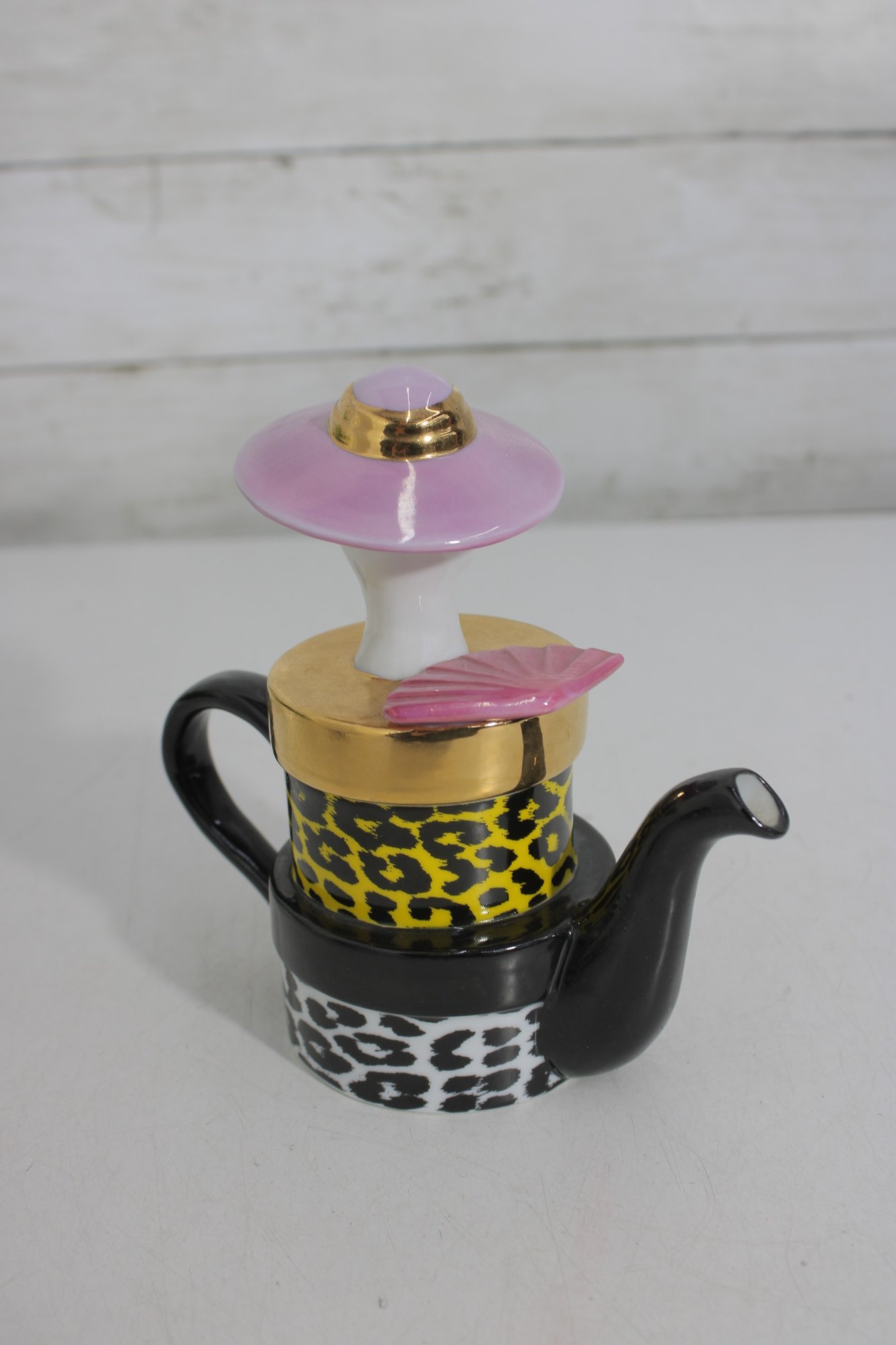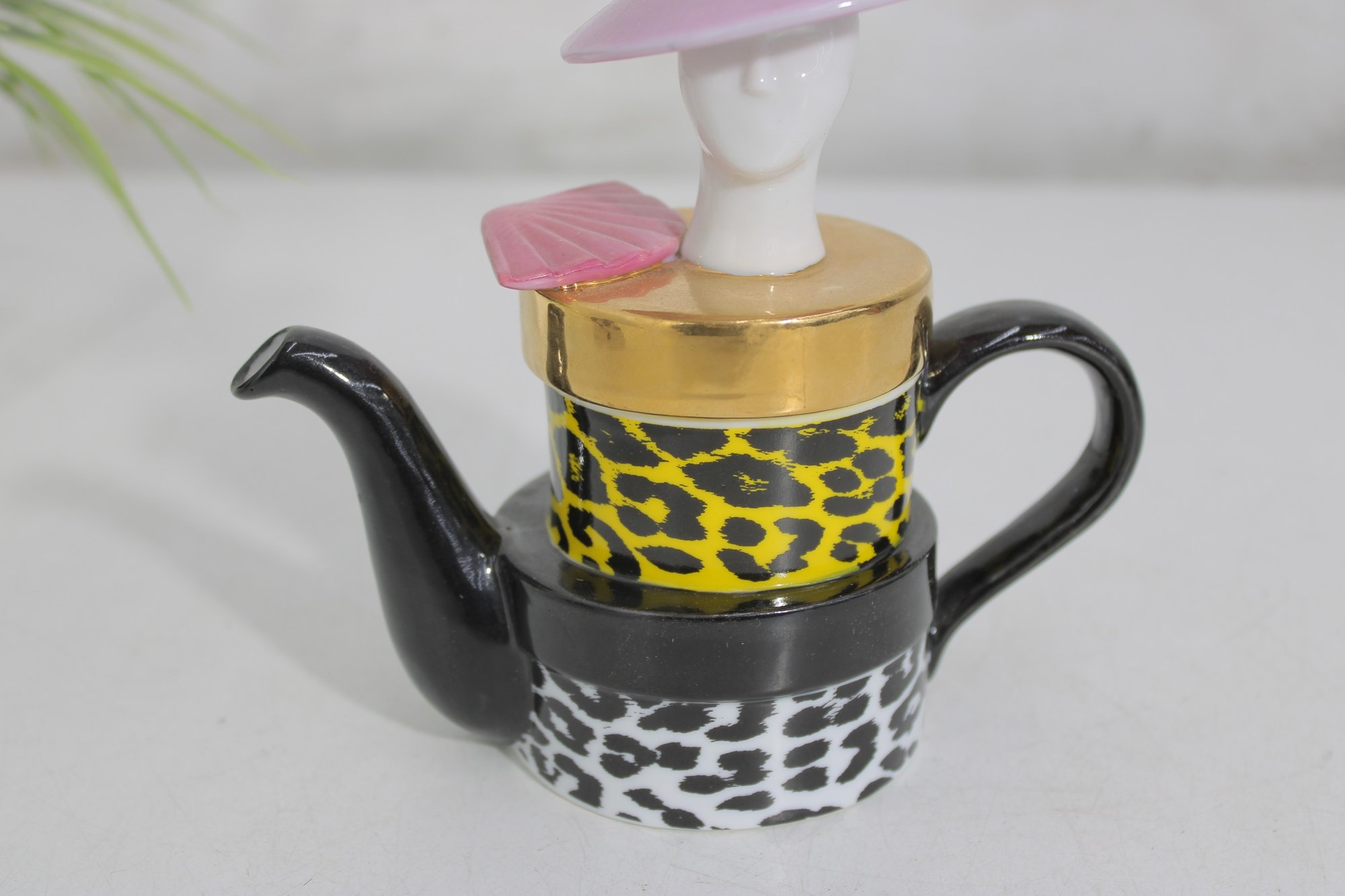 A whimsical teapot by C.J. Italy (1997) featuring layered animal-print patterns and a sculptural lid with a stylized figure (approx. 5" tall)