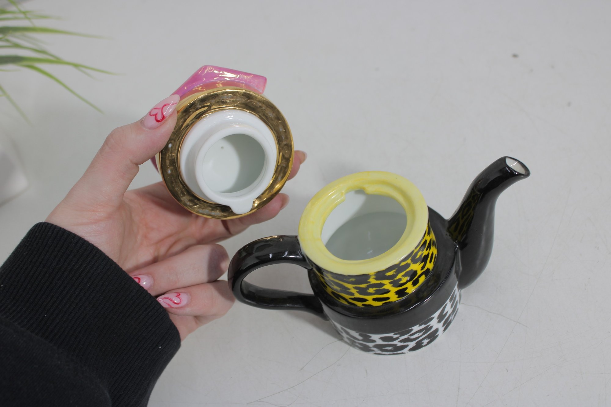 Both pieces are intended as decorative collectibles rather than functional teapots. Their eye-catching forms and patterns make them perfect for display on shelves, in curio cabinets, or as part of a tea-themed vignette.