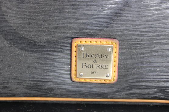 Classic Dooney & Bourke tote featuring the brand’s iconic black textured exterior with rich tan leather trim and handles. This timeless handbag offers a structured silhouette with elegant contrast stitching and a front logo plaque marked “Dooney & Bourke 1975.”