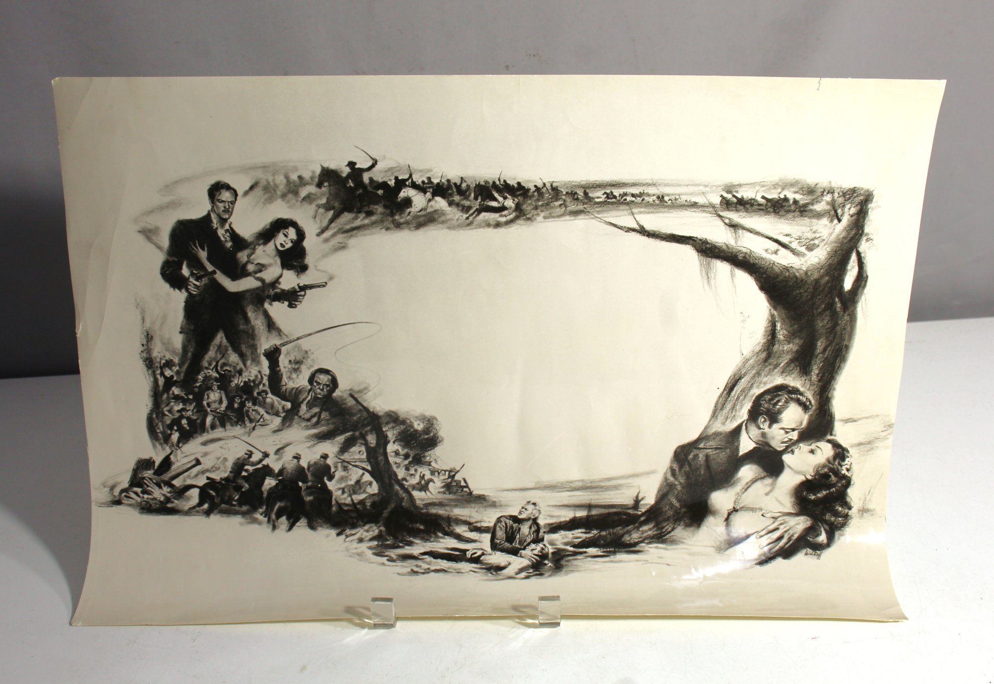 A striking 14" by 20" black-and-white illustration depicting an intense action scene. The image portrays a combination of battle, tension, and drama, with dynamic figures in motion. The detailed work includes figures engaged in combat, a poignant emotional scene of a man and woman, and vivid expressions of struggle. Perfect for collectors of vintage artwork or illustrations, this piece makes a bold statement with its powerful imagery and skilled artistry. Signed in the corner, it offers a captivating glimpse into a dramatic narrative.