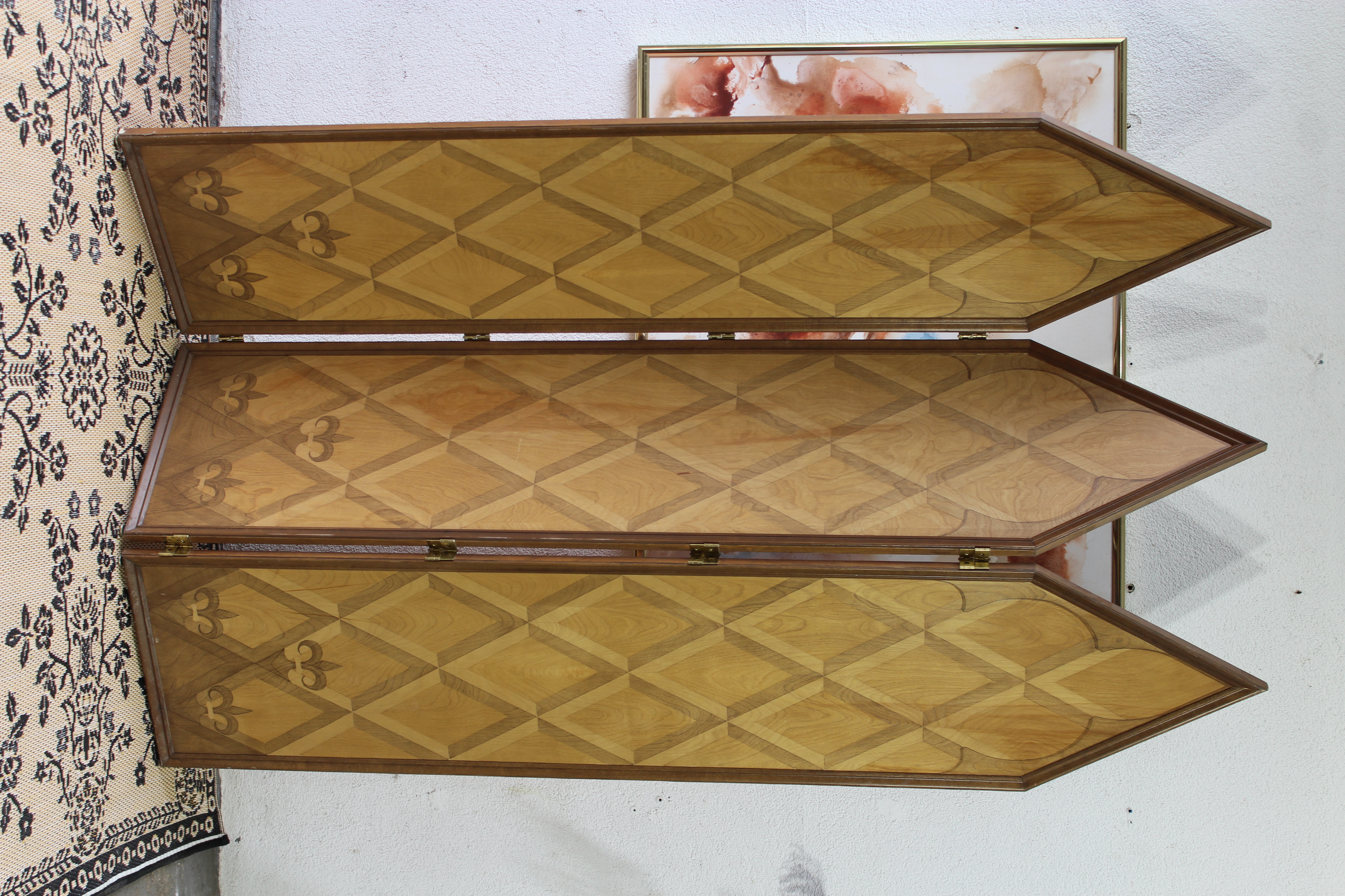This stunning three-panel screen is a versatile and unique piece, perfect for adding elegance and functionality to any room. One side showcases a sophisticated wood inlay pattern with a golden floral motif, while the reverse side features a beautifully painted sky at sunset, offering a warm and serene atmosphere.