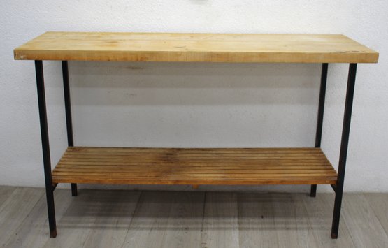 This sleek and minimalist console table features a solid wood top with a natural finish, supported by a sturdy metal base. The industrial-style design is complemented by a lower slatted wooden shelf, providing both style and functional storage space for books, baskets, or decorative items. The black metal legs offer a striking contrast to the warm wooden surfaces, making this piece suitable for a variety of interior decor styles, from modern industrial to rustic farmhouse.