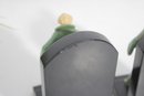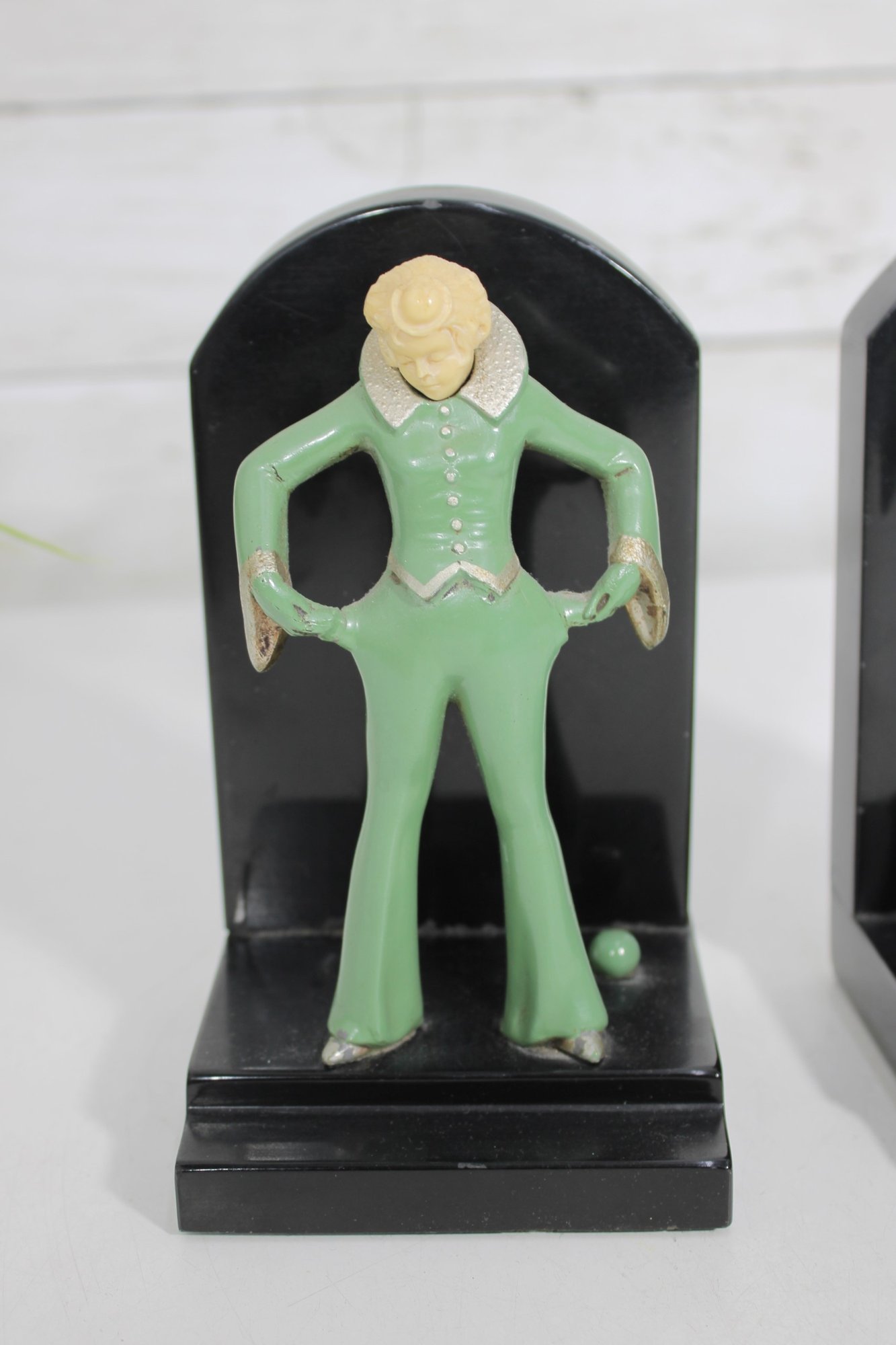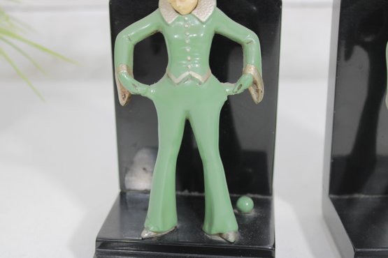 pair of early 1930s Art Deco bookends titled “Empty Pockets.” These charming figural bookends depict a stylized gentleman in period attire, standing with turned-out empty pockets—an iconic and whimsical nod to the economic hardships of the Great Depression era.