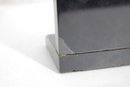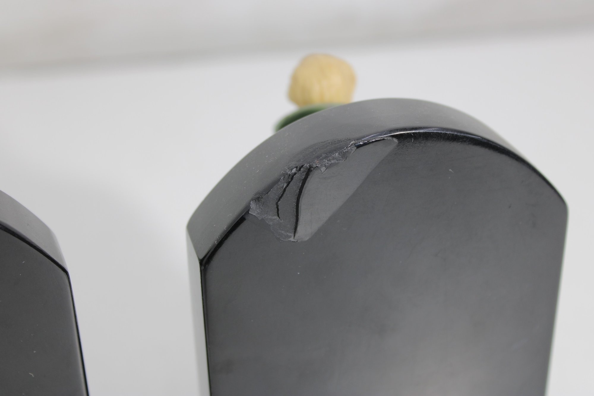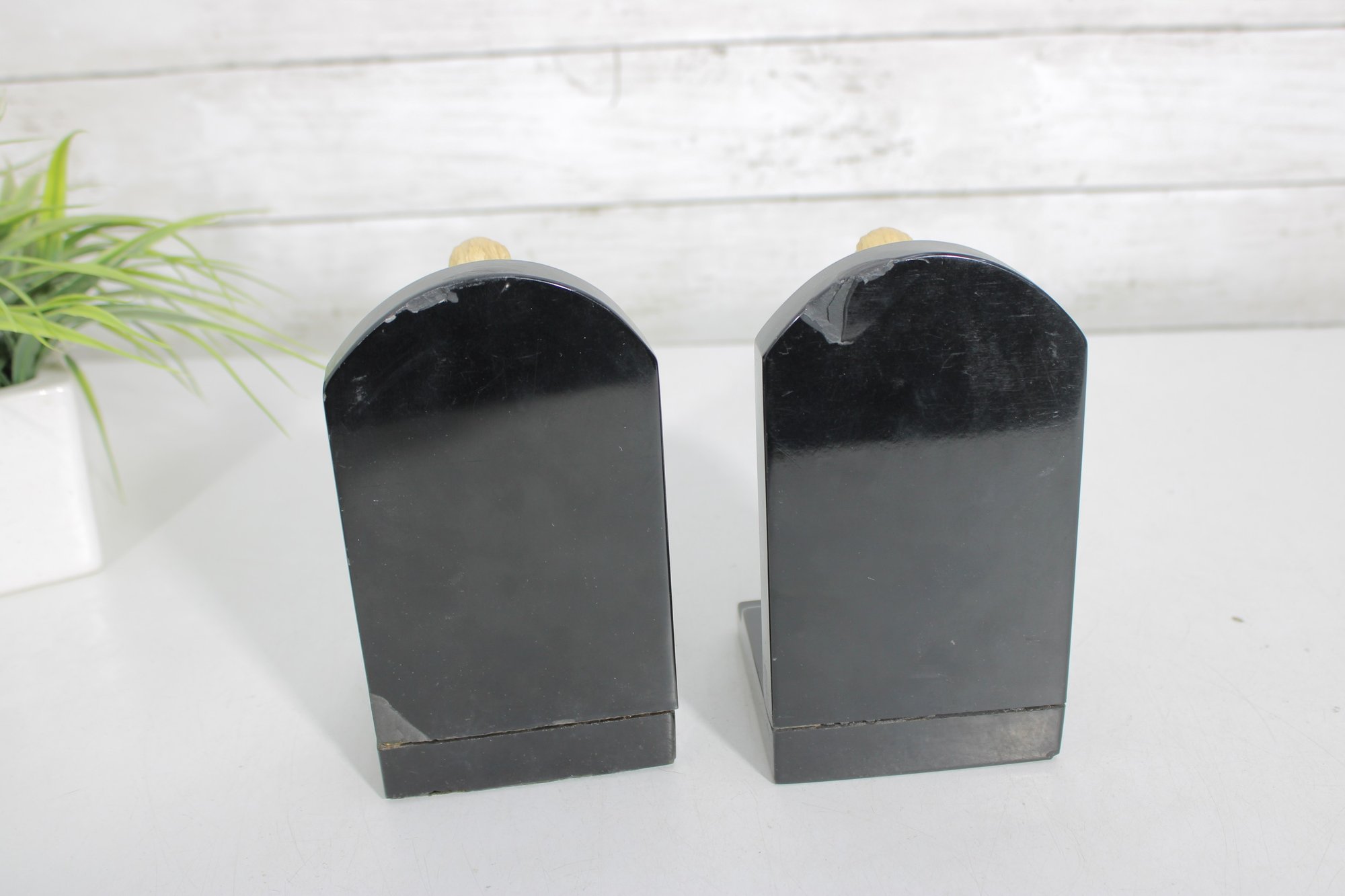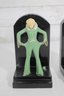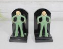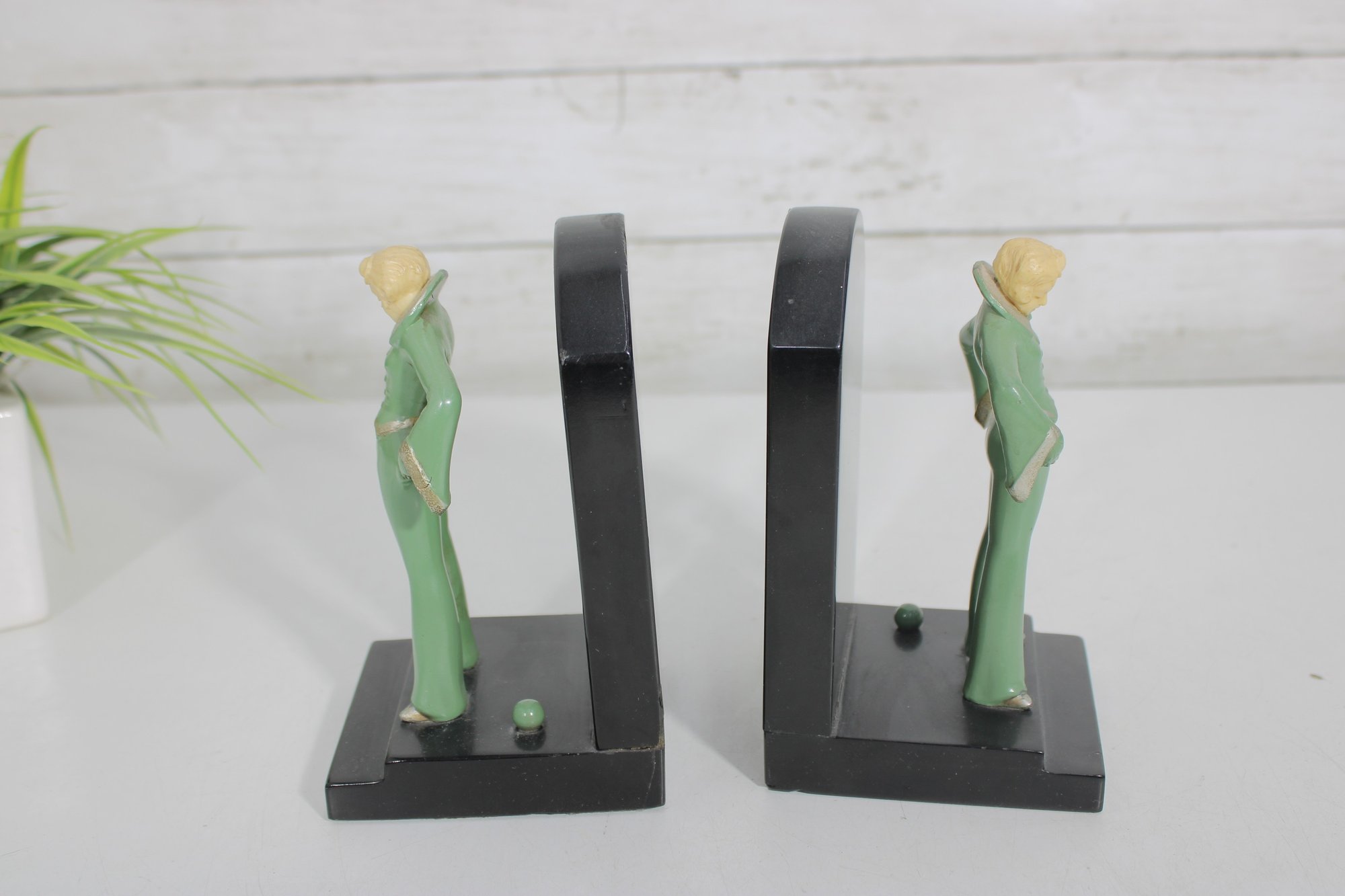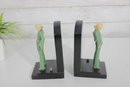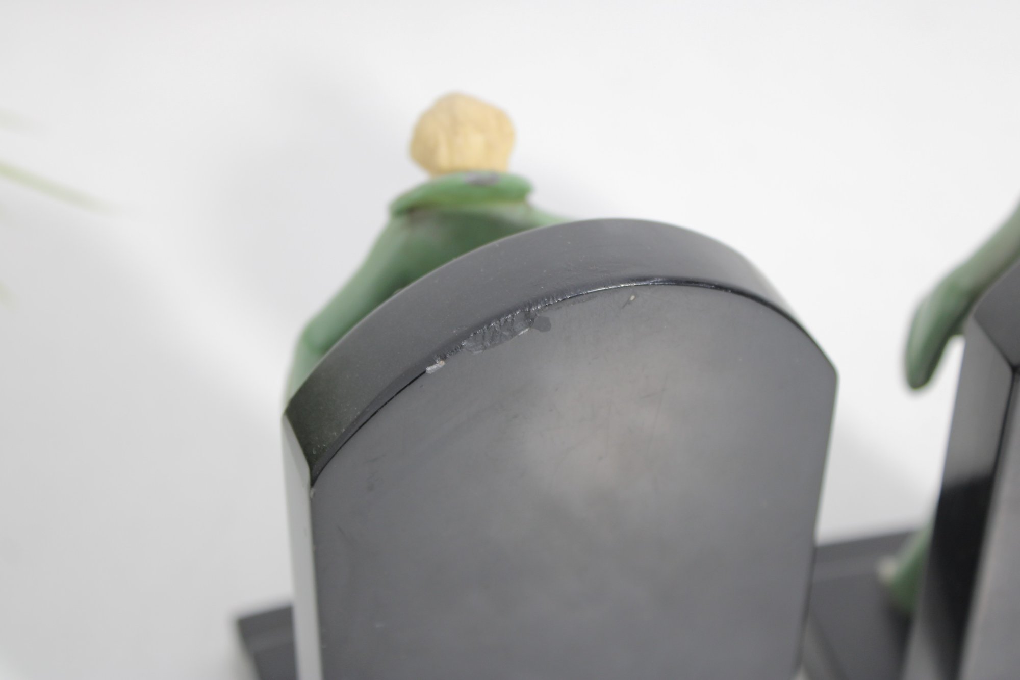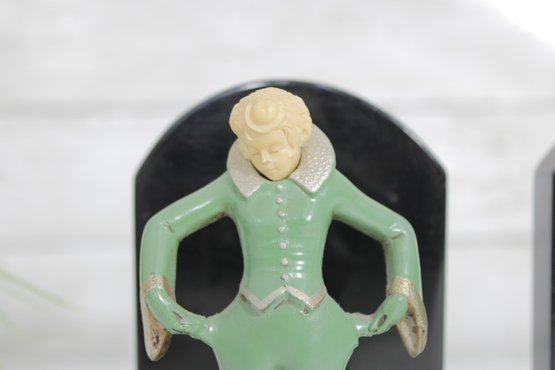 Each figure is rendered in a soft green tone with contrasting details, set against a sleek black arched backdrop typical of Art Deco design. The sculptural quality and clean lines make these both functional and highly decorative pieces.