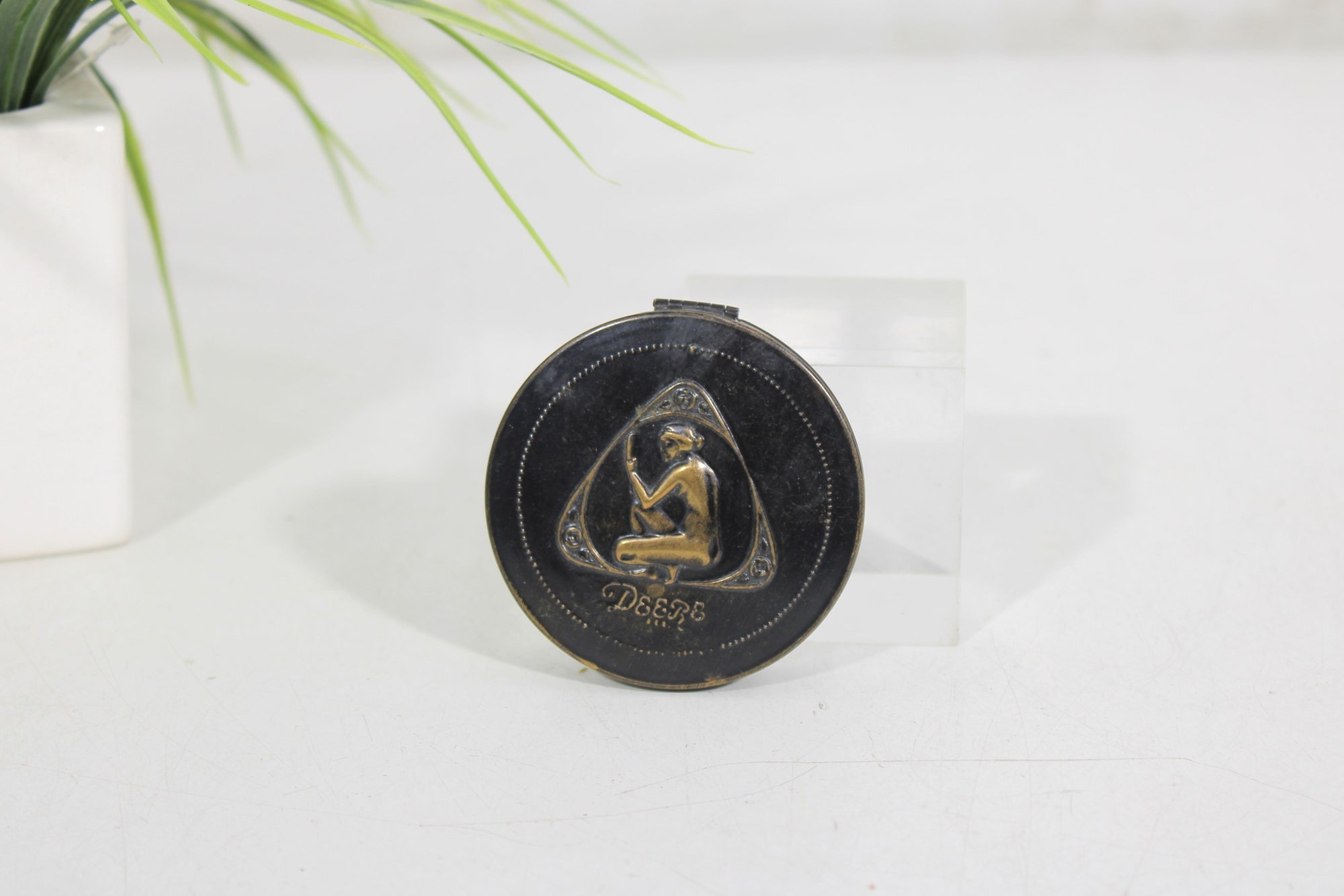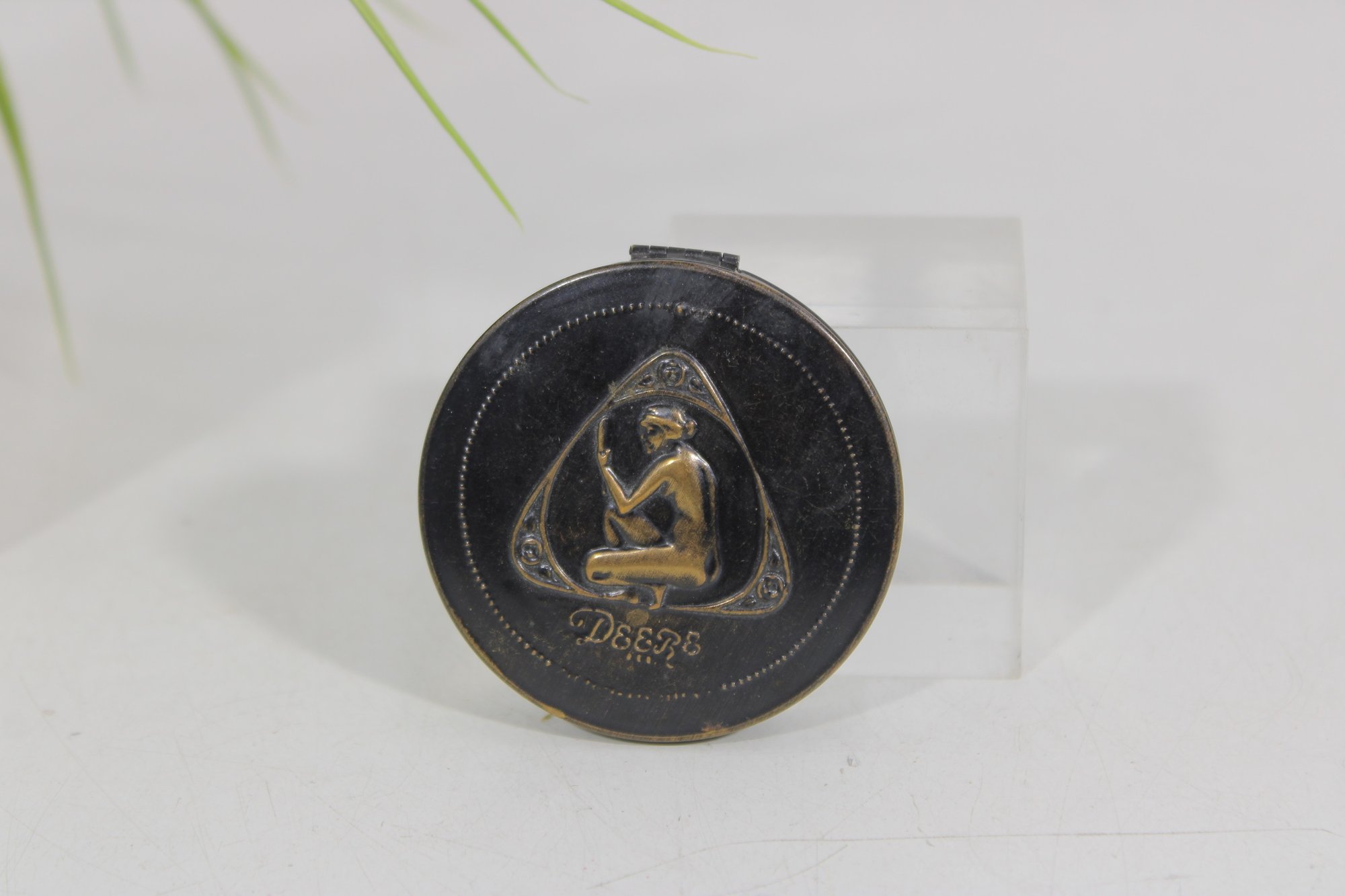 an early Art Deco Deere powder compact featuring the distinctive kneeling nude logo design on the lid. The compact has a classic round black case with a raised triangular emblem showcasing the iconic Art Deco figure and the “Deere” name beneath the design.