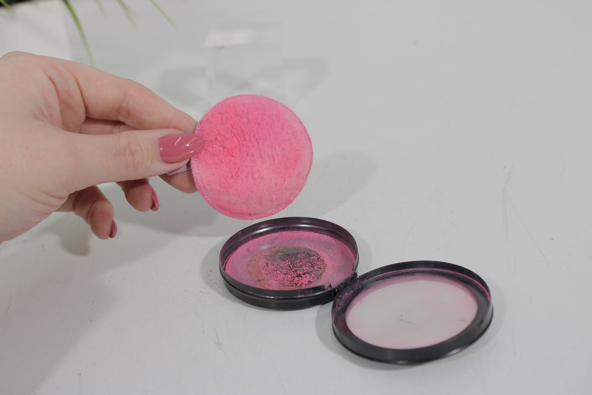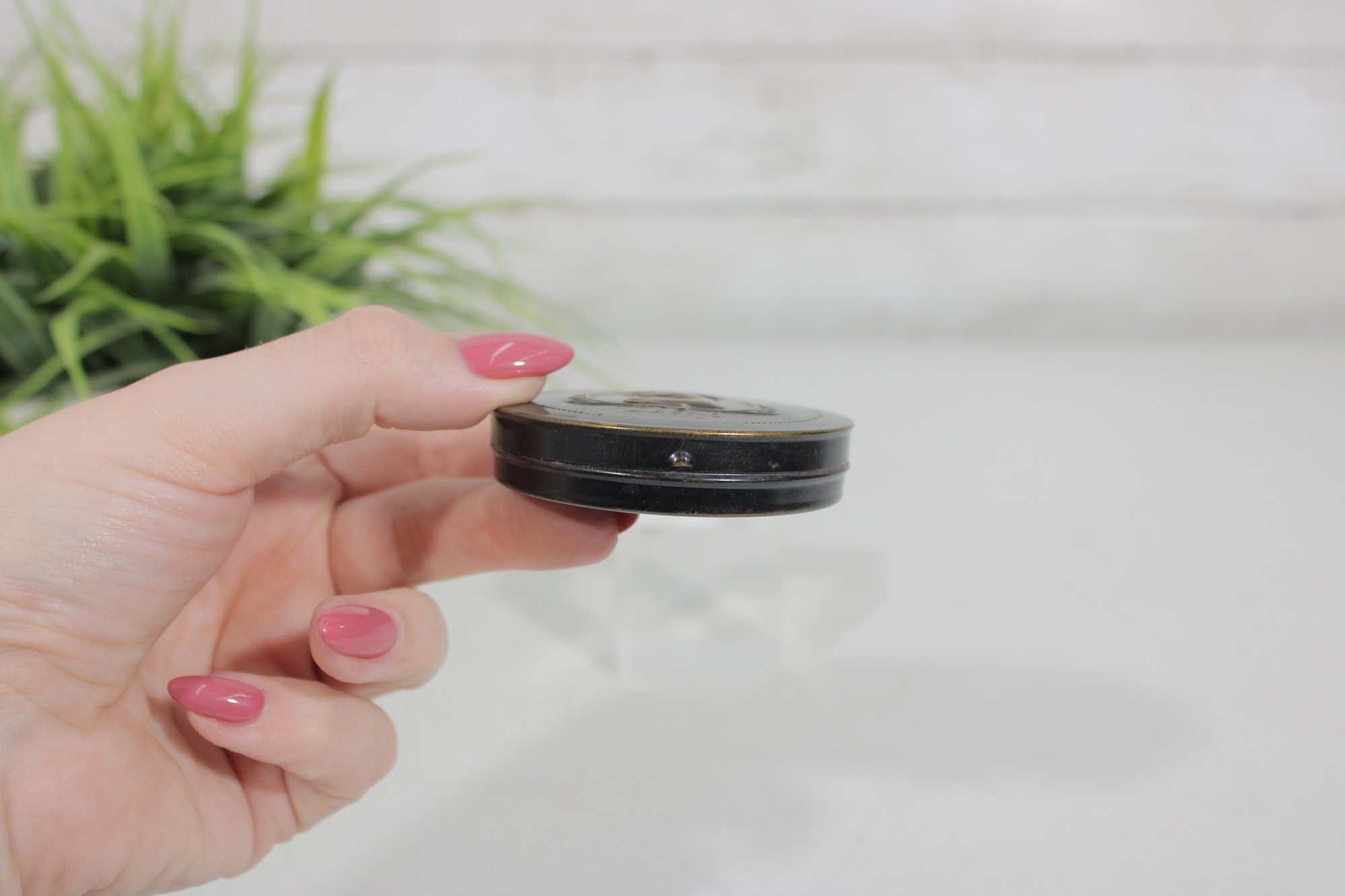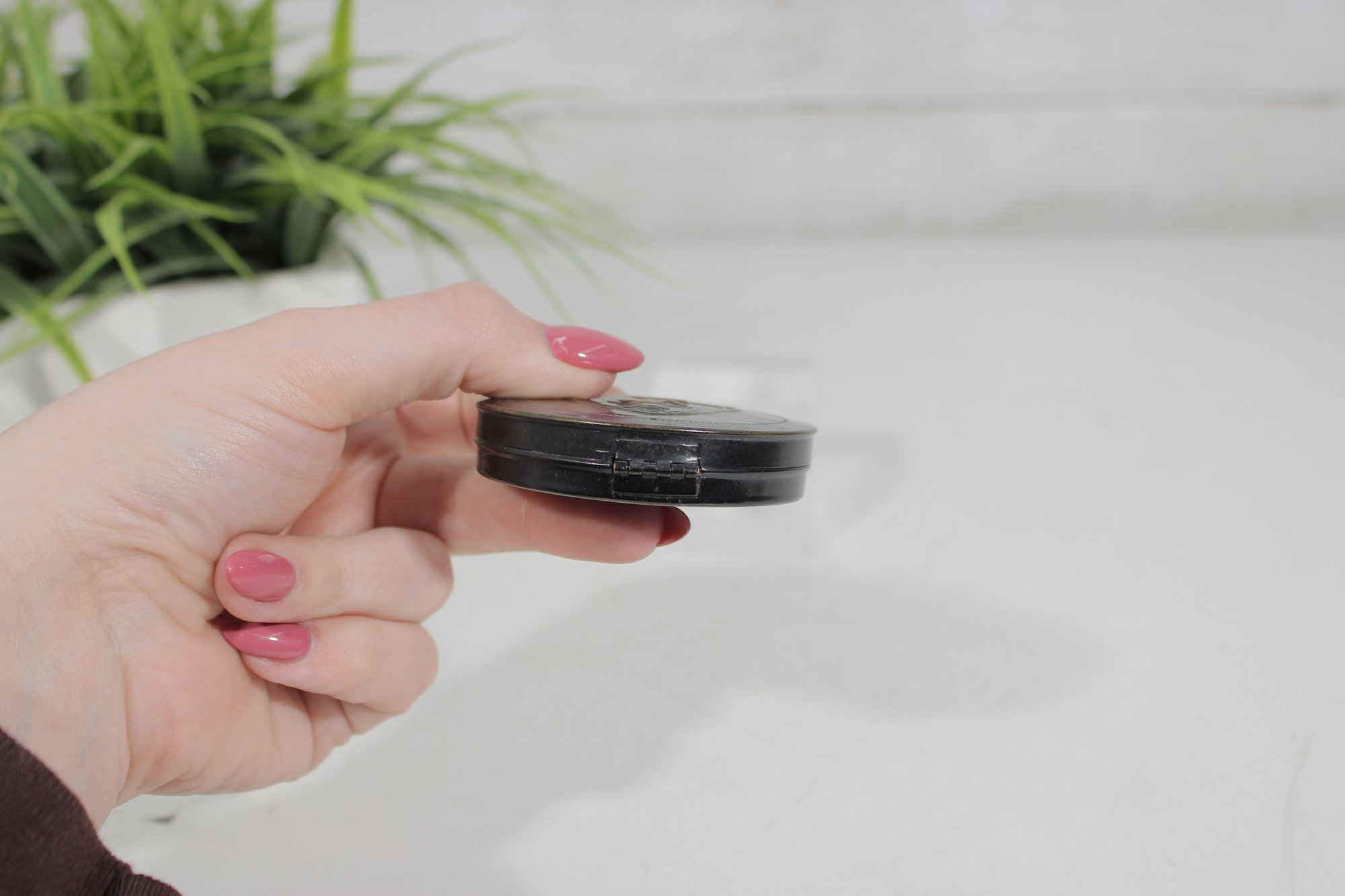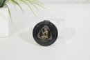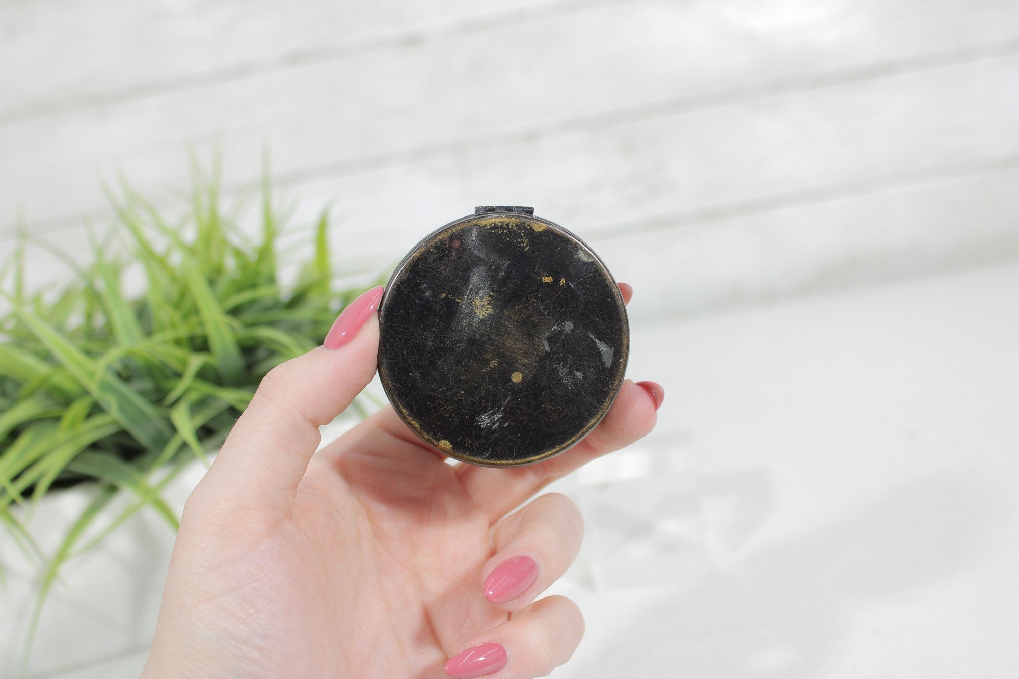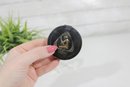 The compact opens to reveal an interior mirror and powder compartment, and still retains a vintage powder puff. Its compact size and striking Deco motif make it a desirable collectible for enthusiasts of Art Deco vanity accessories and early cosmetic advertising pieces.