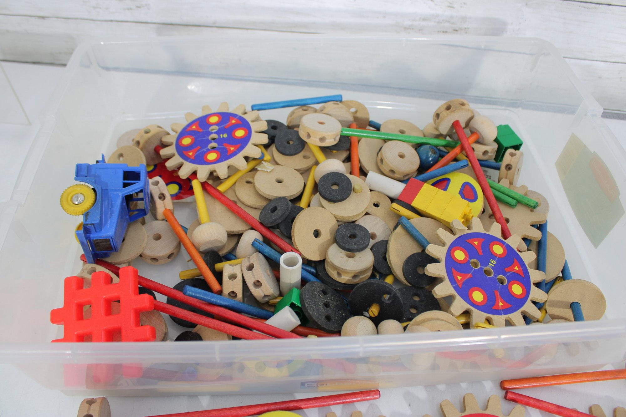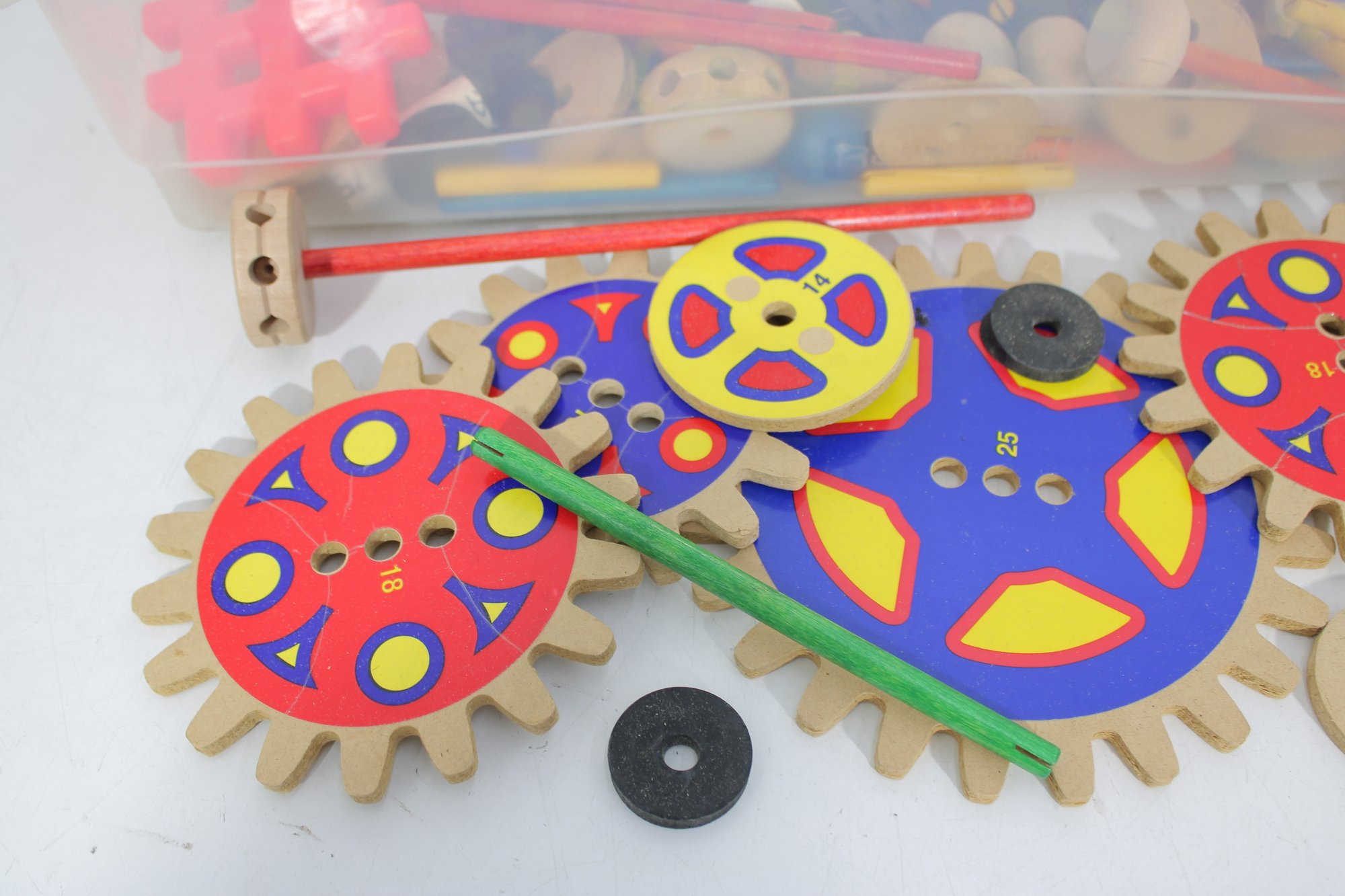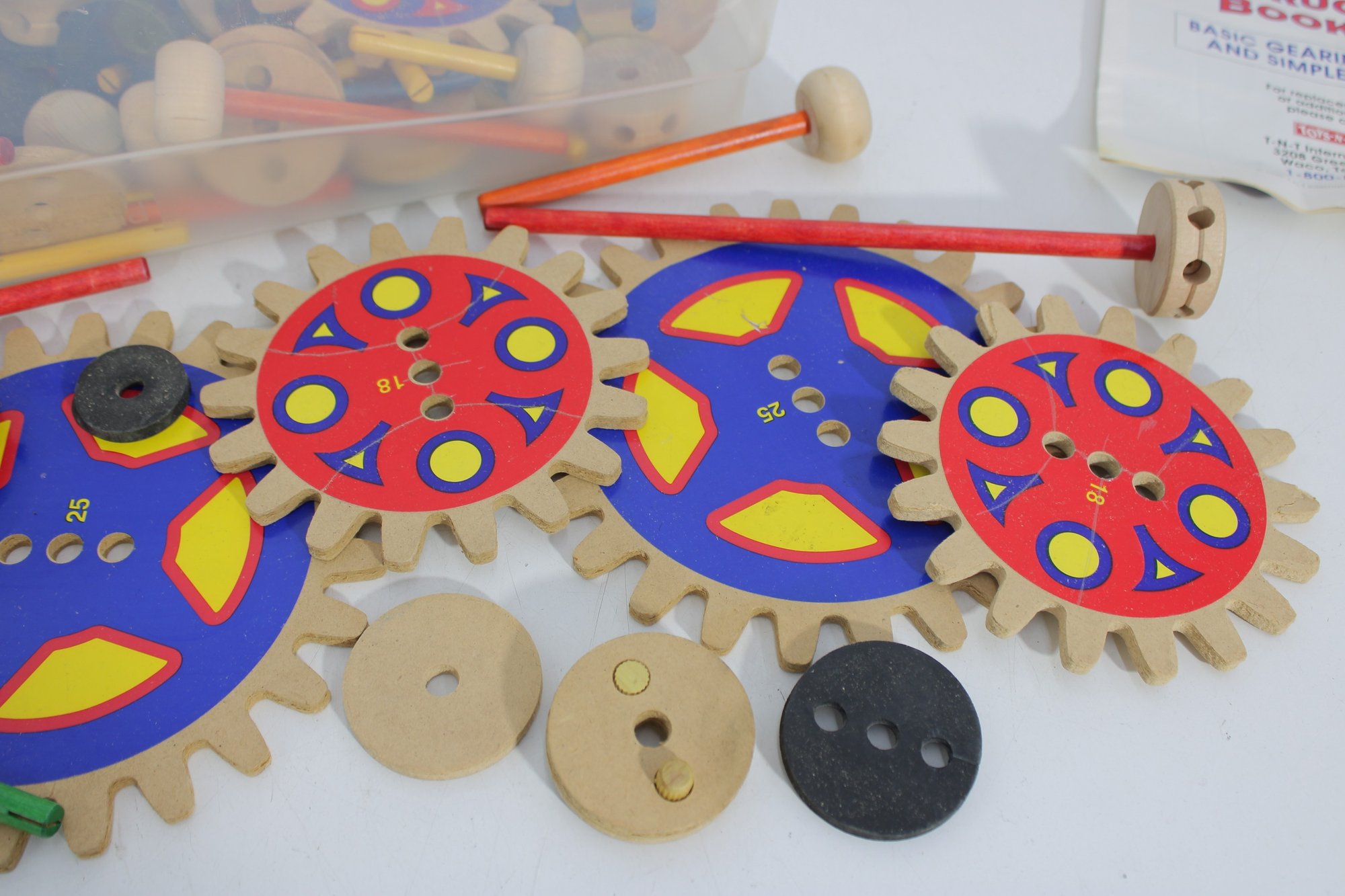 The lot includes a variety of plastic and wooden-style gear pieces along with the pictured pictorial instruction booklet and storage bin. Perfect for classrooms, homeschool learning, or creative play projects.
