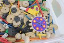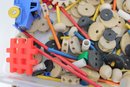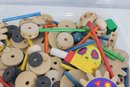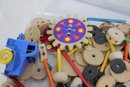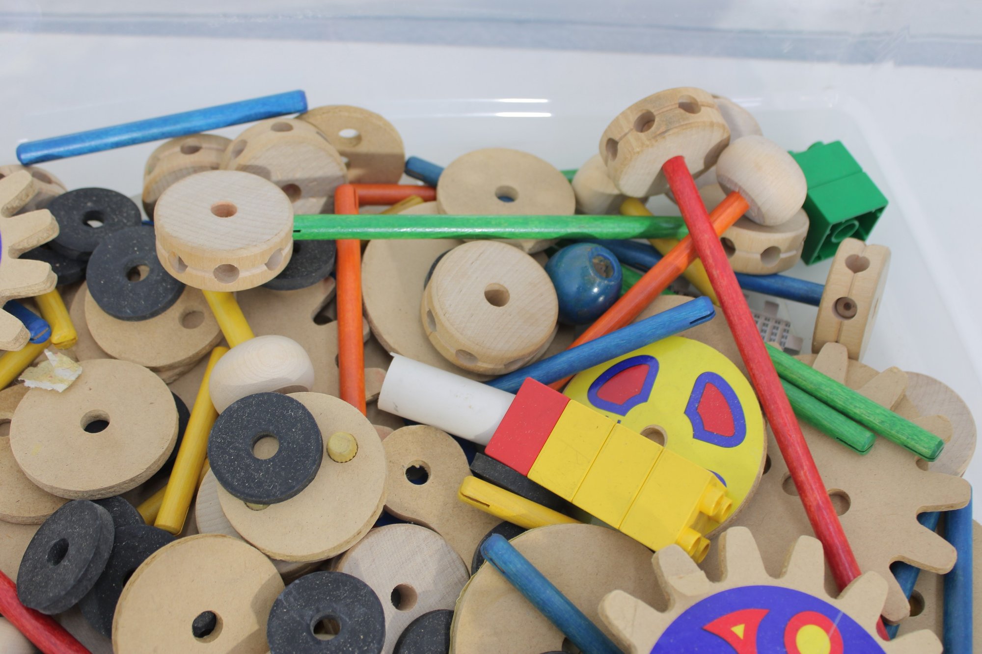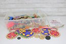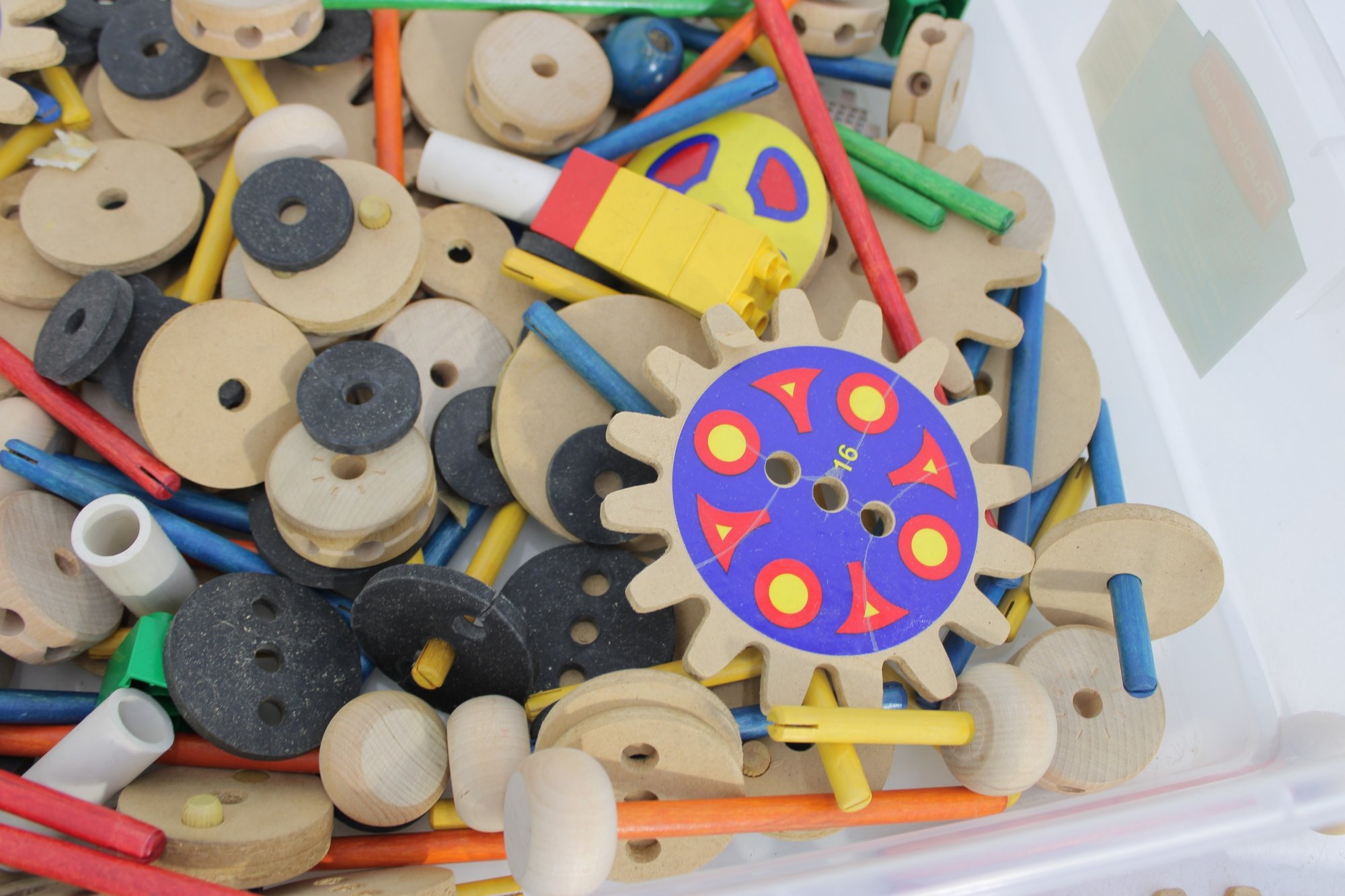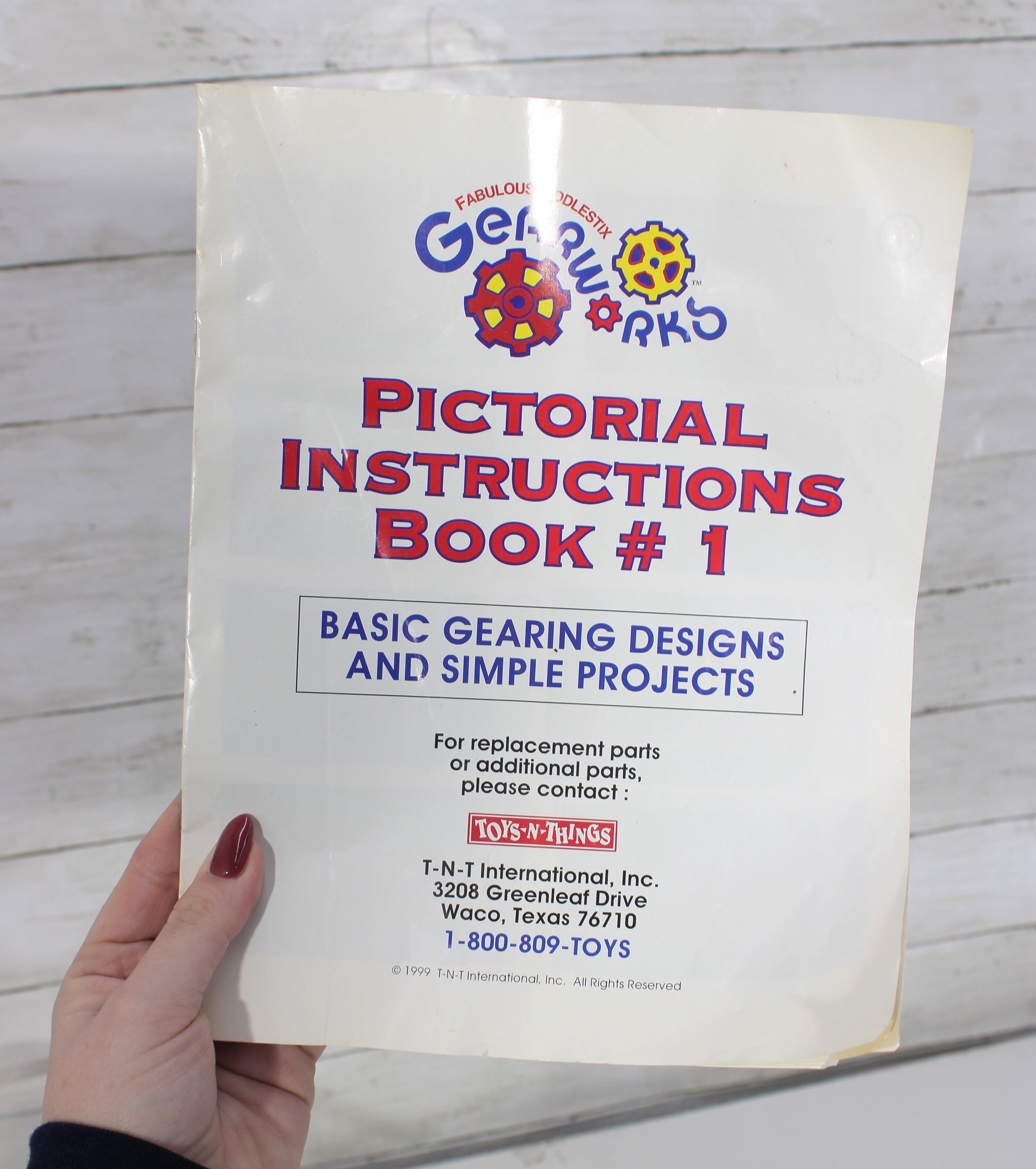 The lot includes a variety of plastic and wooden-style gear pieces along with the pictured pictorial instruction booklet and storage bin. Perfect for classrooms, homeschool learning, or creative play projects.