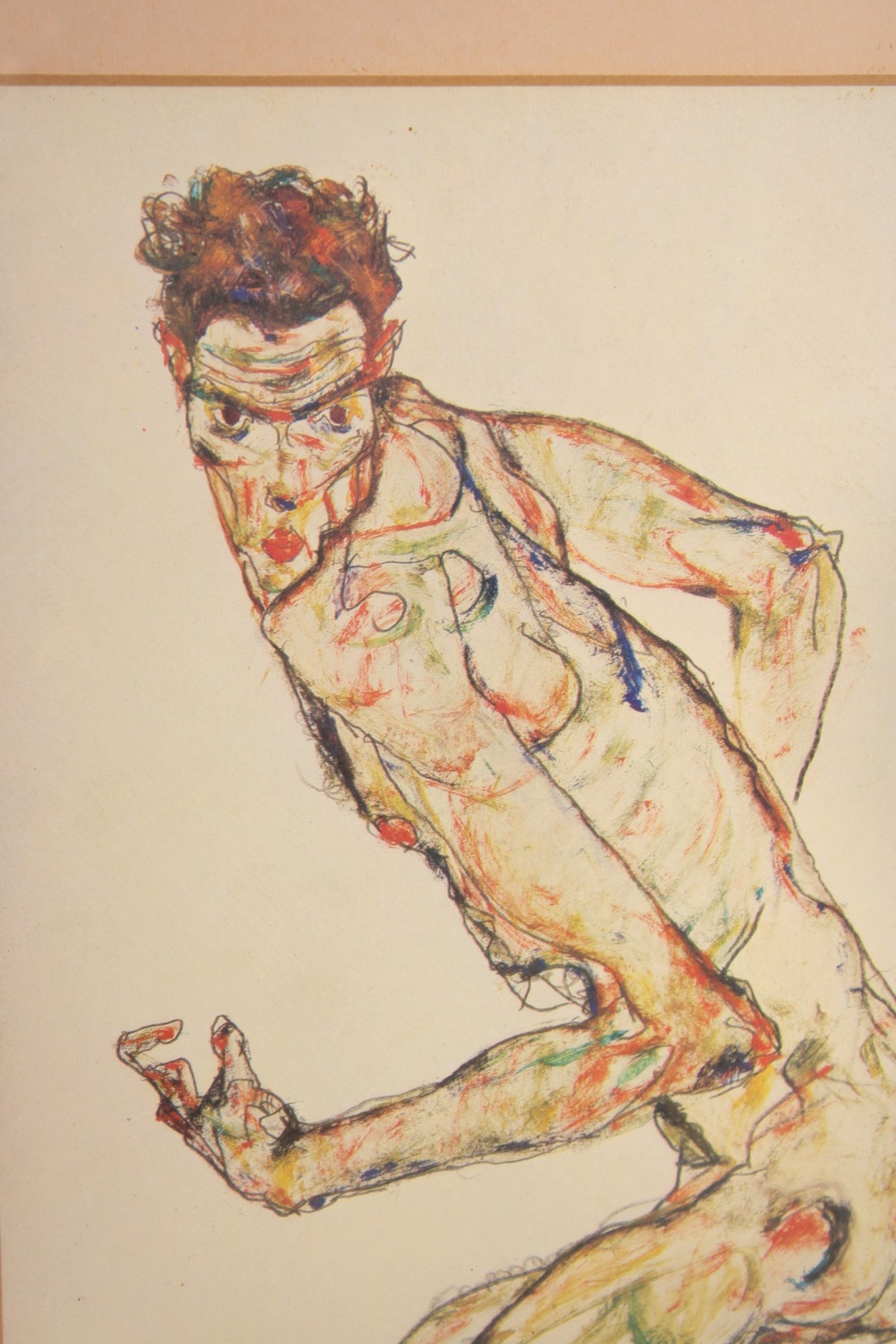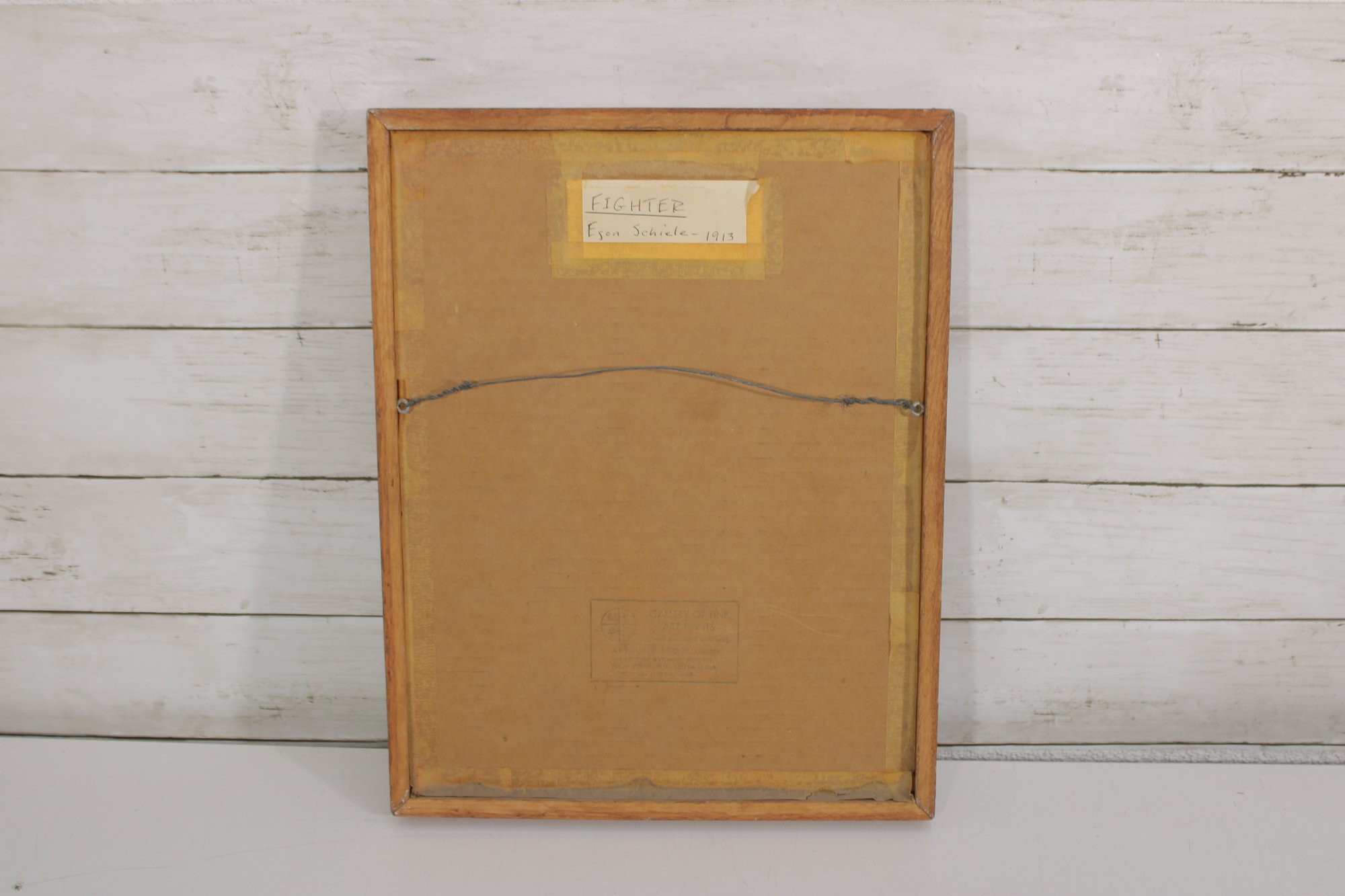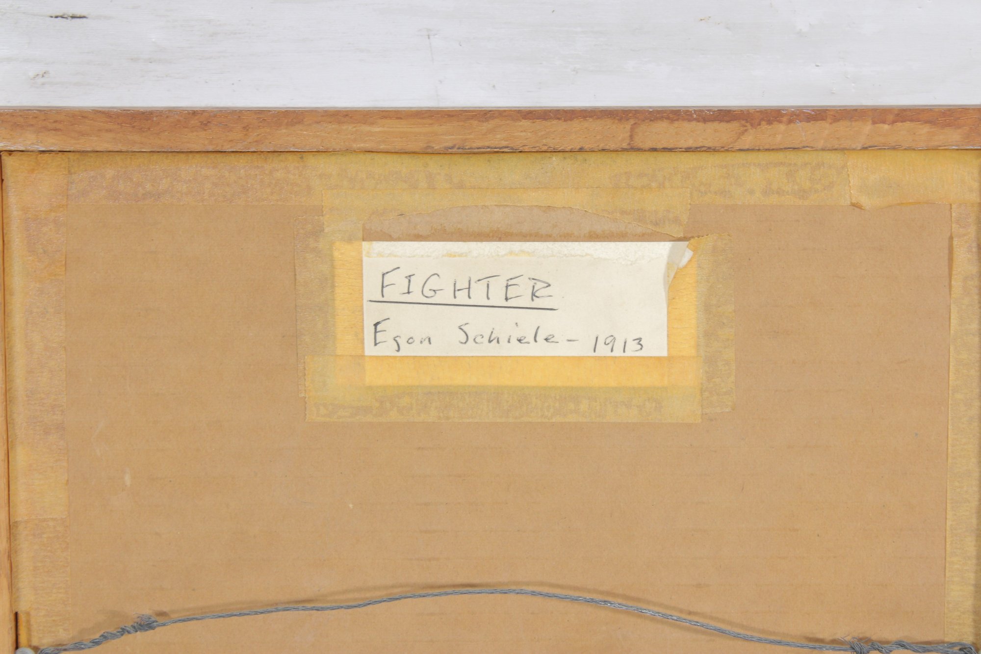 framed print after Egon Schiele, titled “Fighter” and dated 1913. This piece reproduces one of Schiele’s iconic expressionist figure studies, featuring a dynamic and emotionally charged male form rendered in his distinctive angular linework and expressive color accents.
