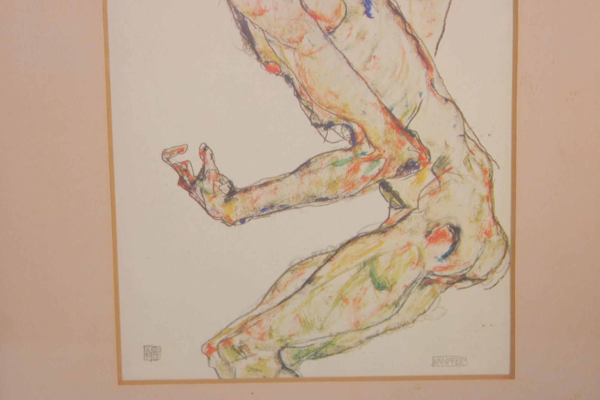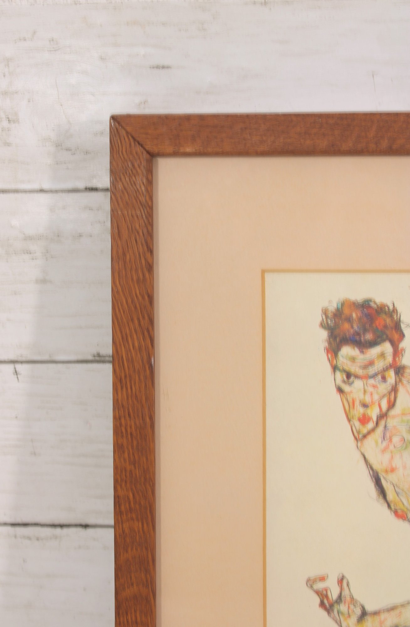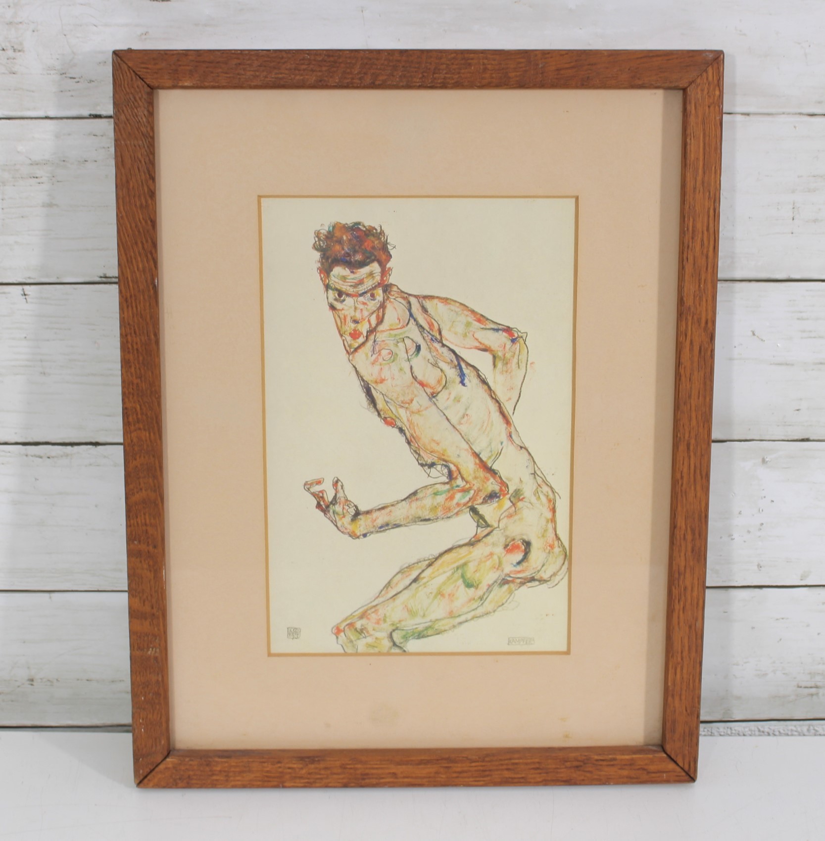 framed print after Egon Schiele, titled “Fighter” and dated 1913. This piece reproduces one of Schiele’s iconic expressionist figure studies, featuring a dynamic and emotionally charged male form rendered in his distinctive angular linework and expressive color accents.