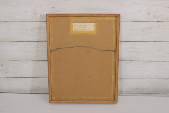 The print is matted and housed in a simple wood frame, making it ready for display. A label on the reverse identifies the work and artist.