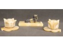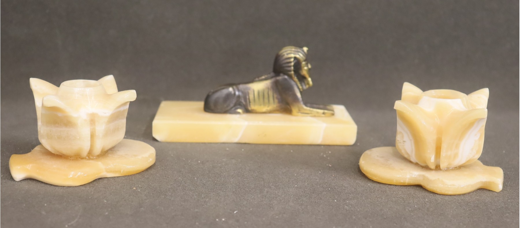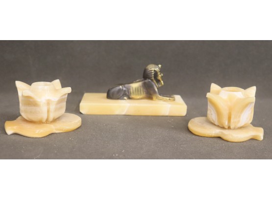Egyptian Yellow Onxy Rose Bud Candle Holders & Cast Bronze Sphynx Figuring On Onyx Base