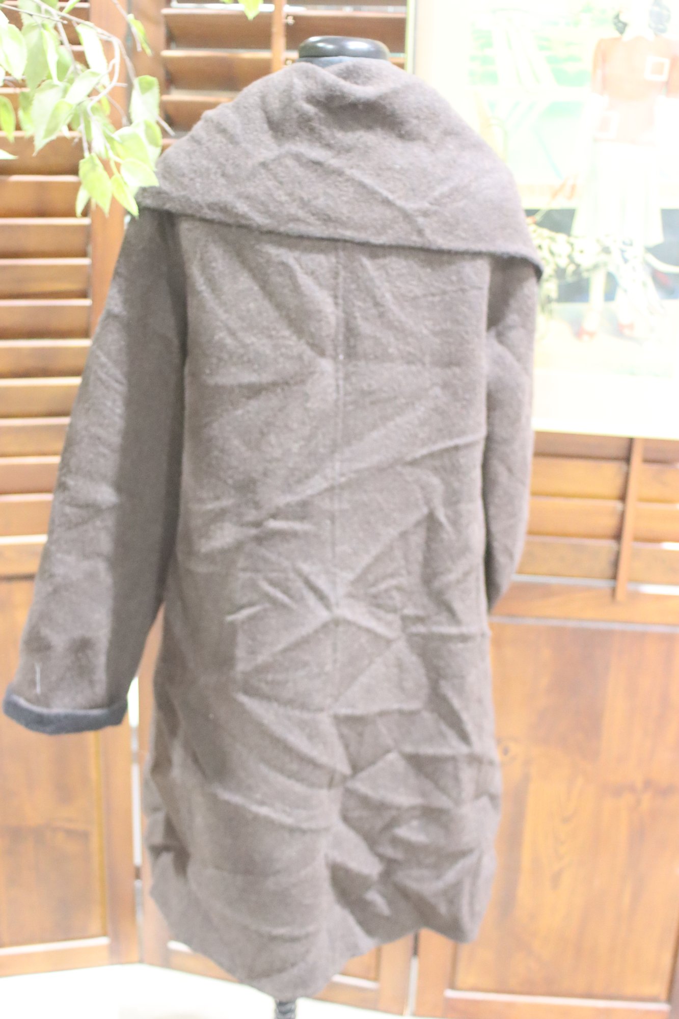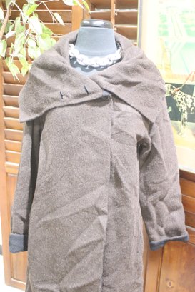 Stay stylish and warm with this Eileen Fisher brown wool blend coat, designed for effortless sophistication and comfort. With its asymmetrical collar and contemporary draped design, this coat is perfect for layering over casual and formal outfits alike.