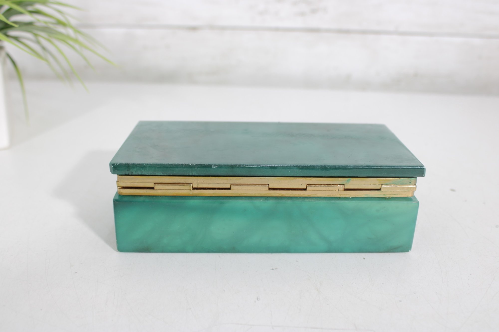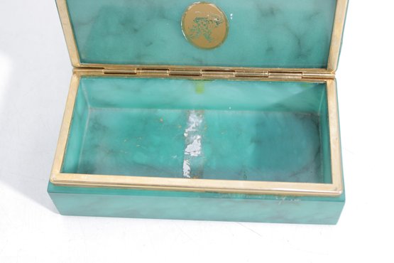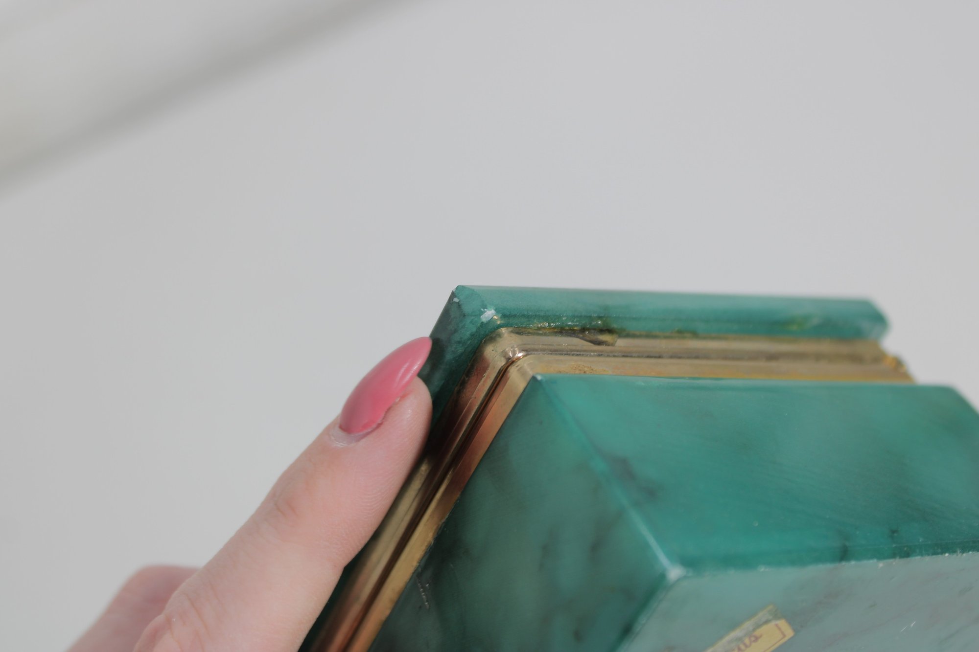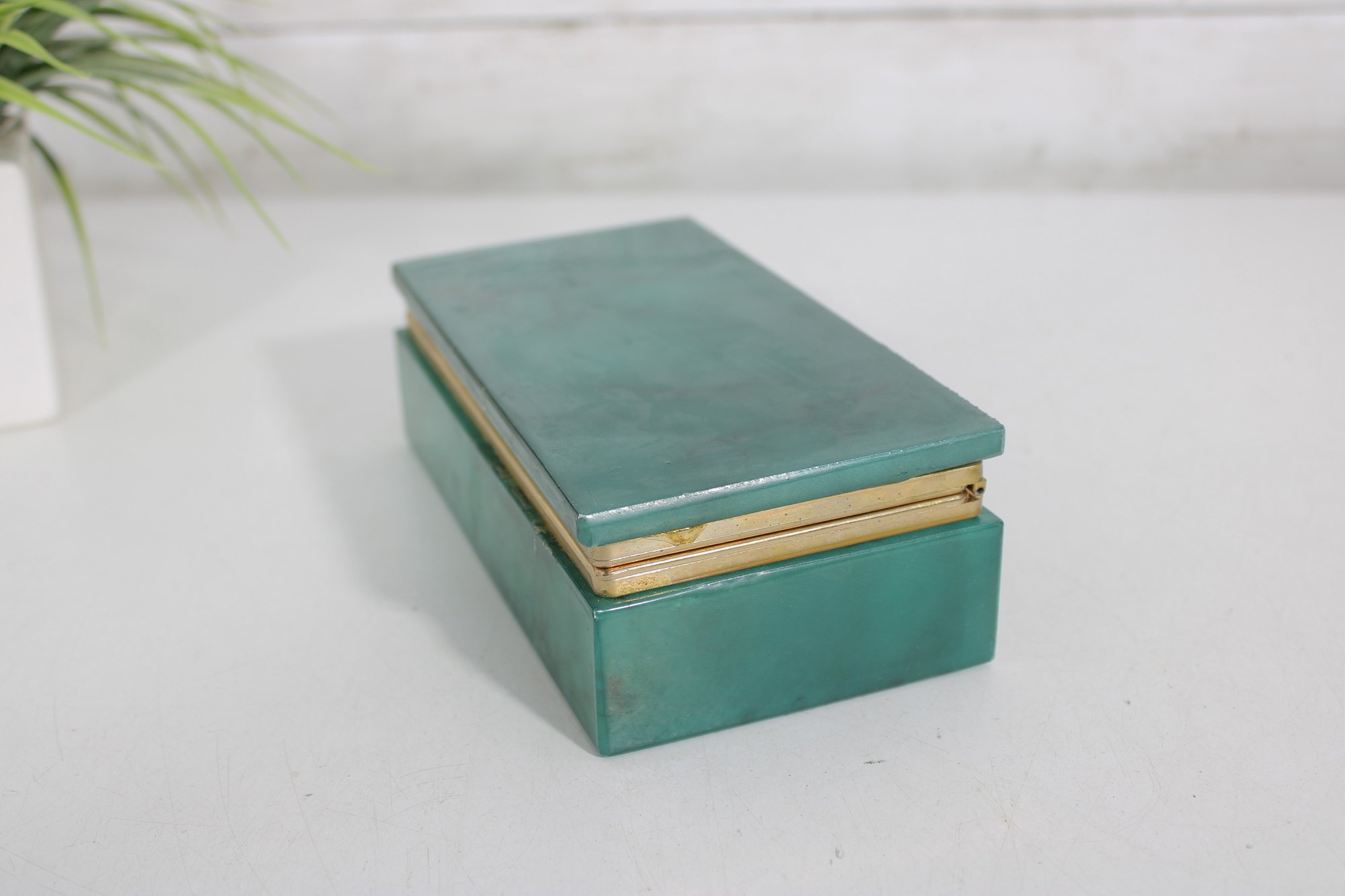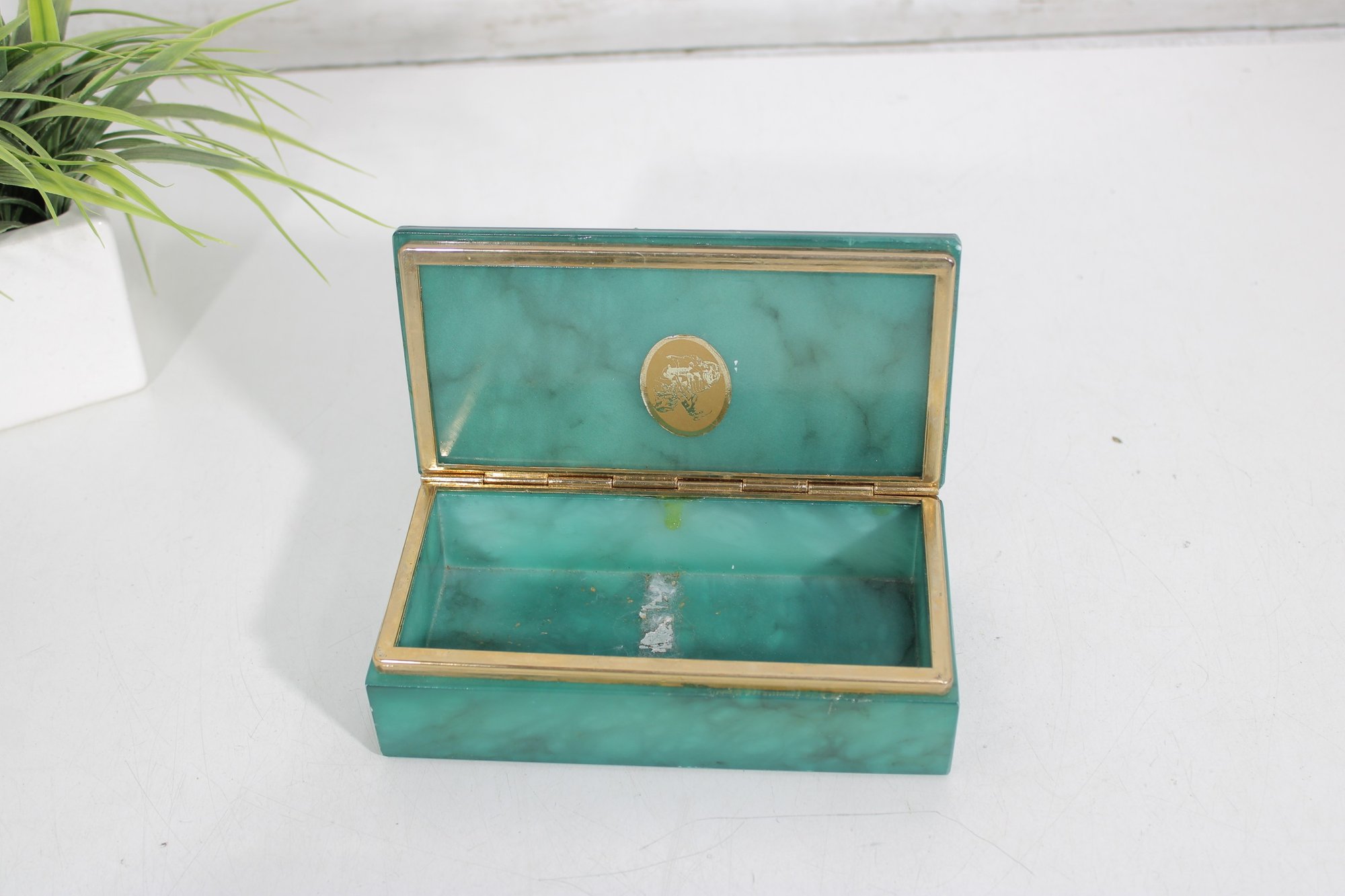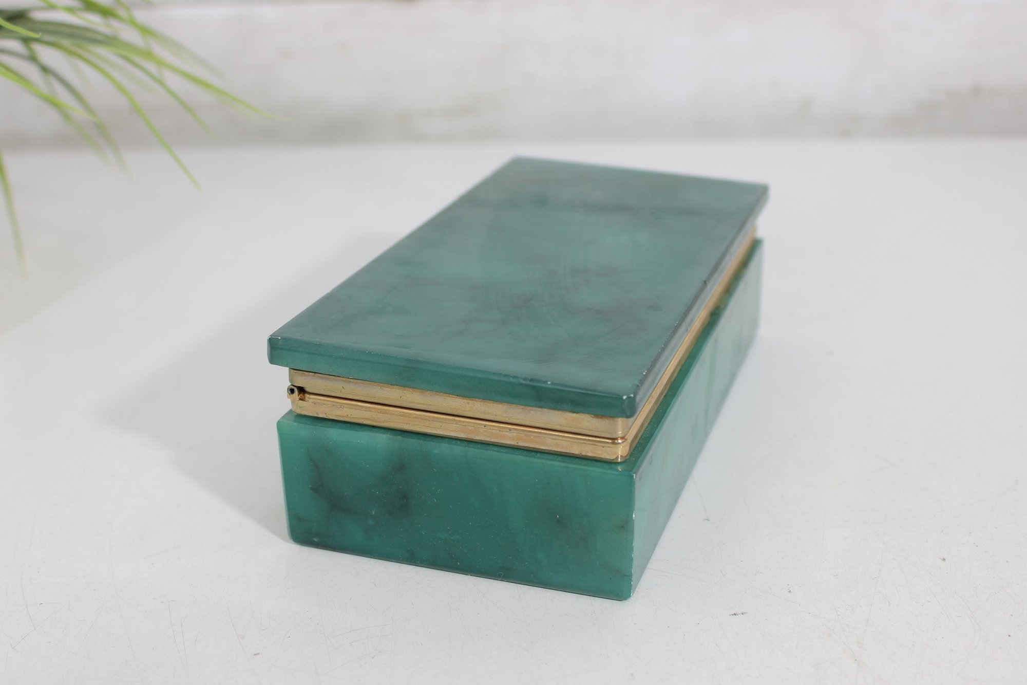 genuine alabaster trinket box crafted in Italy and retailed by Neiman Marcus. This beautifully hand-carved piece features a rich emerald green stone with natural marbling, complemented by polished brass trim and hinge.