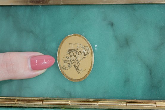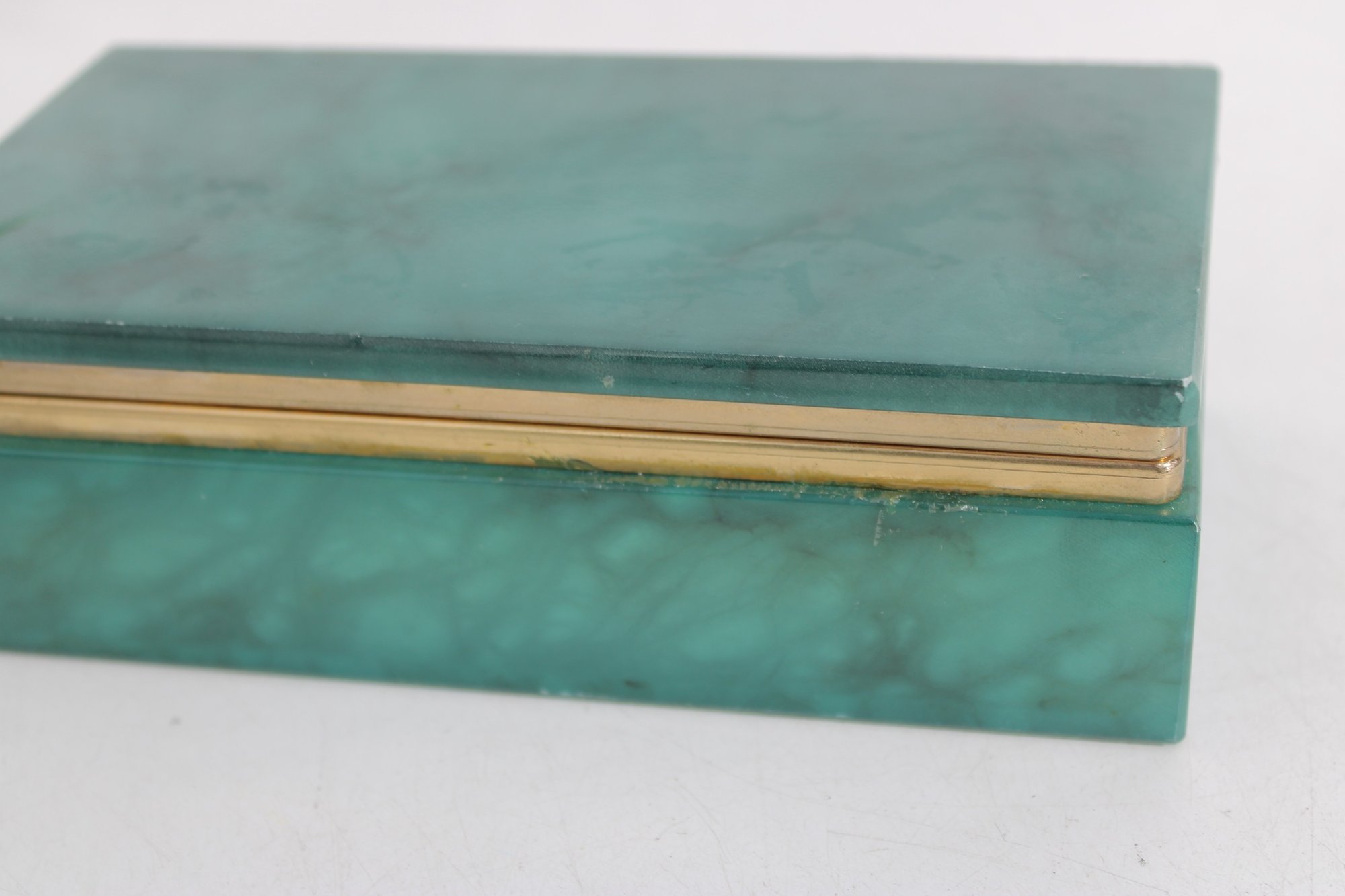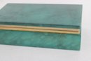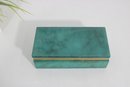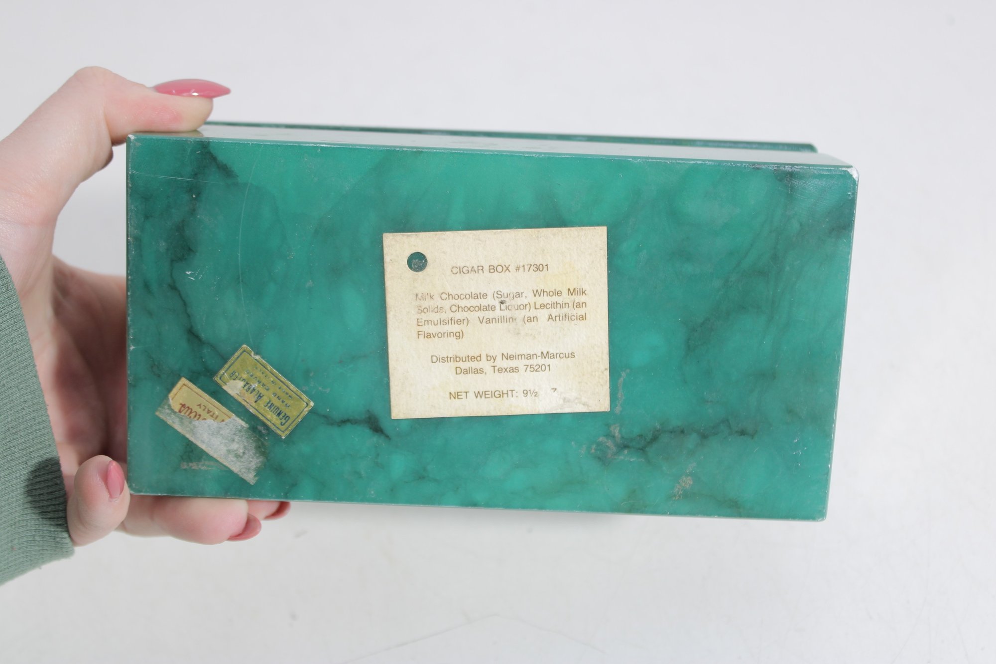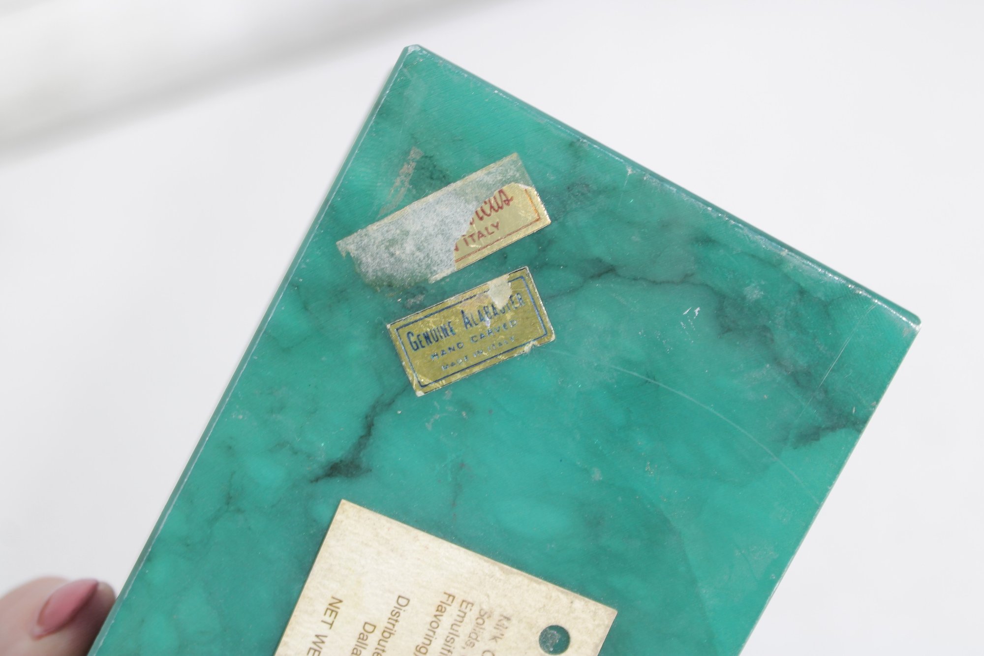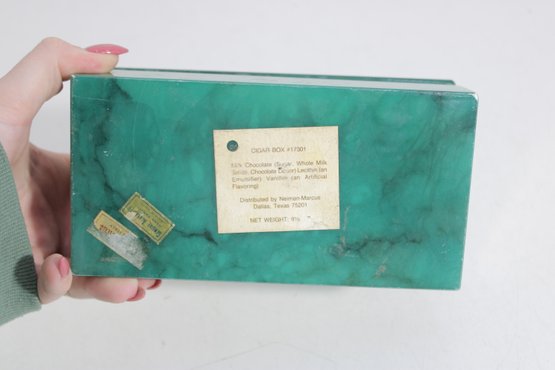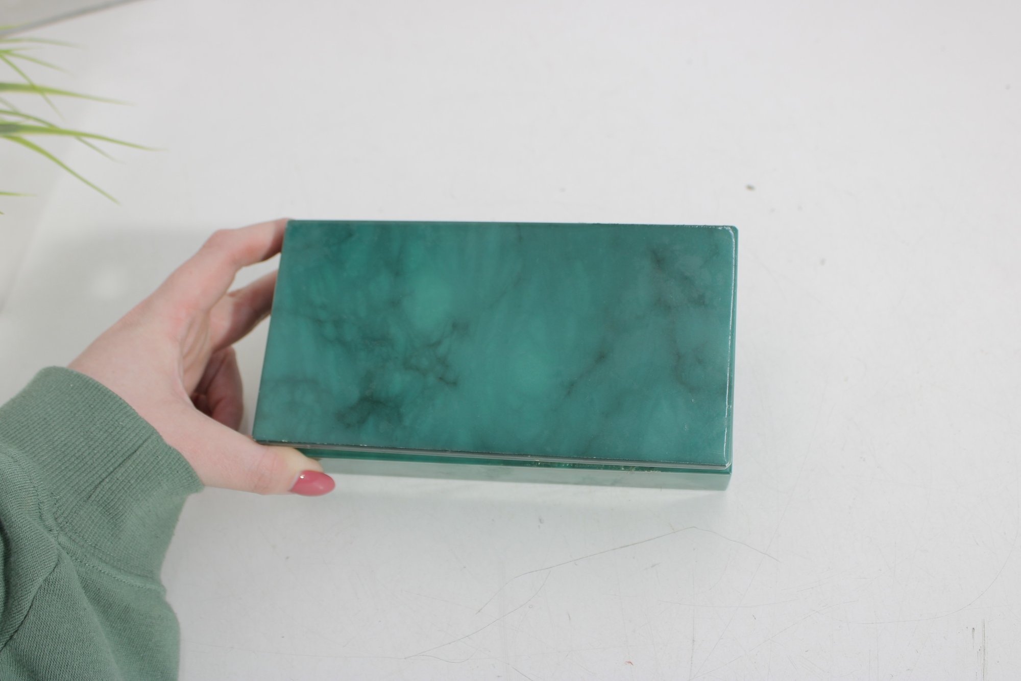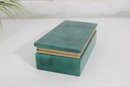 genuine alabaster trinket box crafted in Italy and retailed by Neiman Marcus. This beautifully hand-carved piece features a rich emerald green stone with natural marbling, complemented by polished brass trim and hinge.