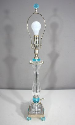 Add a touch of glamour to your space with this striking 30-inch vintage table lamp, a beautiful blend of Hollywood Regency elegance and mid-century charm. This lamp features a faceted clear glass body with ornate silver-toned accents and stunning aqua blue glass embellishments at the base, column, and finial.