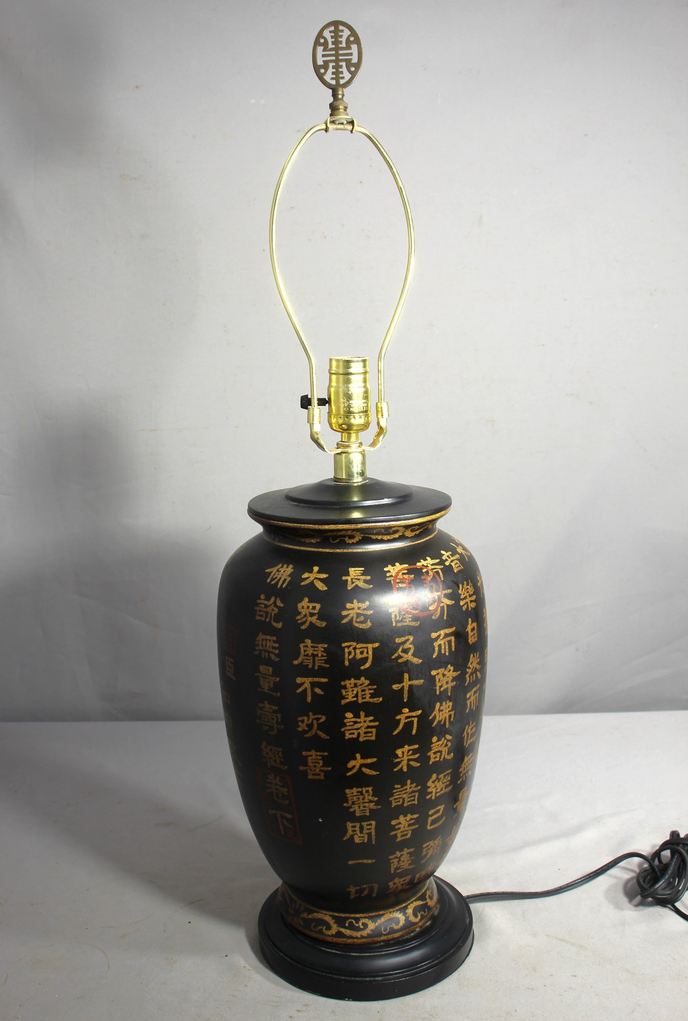 Traditional Chinese calligraphy in gold on a sleek black background, complemented by a decorative golden base and a stylish lamp fixture with a unique oriental motif at the top.