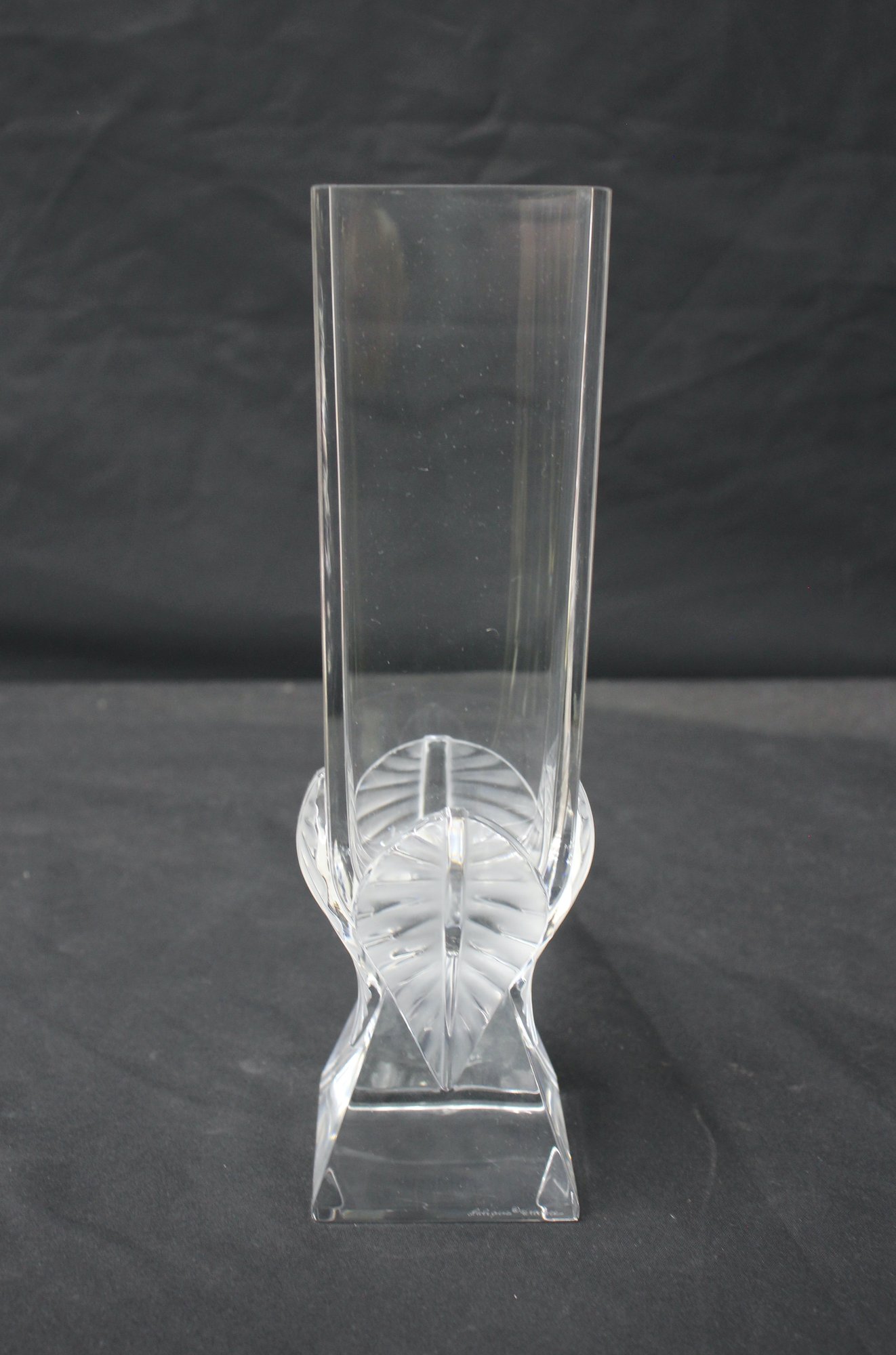 Add sophistication to your decor with this stunning lalique etched glass vase. Crafted with precision, this vase features a beautifully etched leaf motif at its base and a sleek, modern silhouette. Perfect for displaying flowers or as a standalone decorative piece.