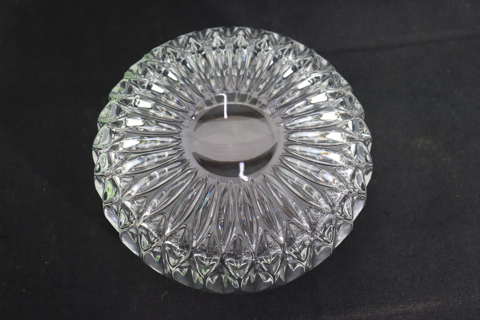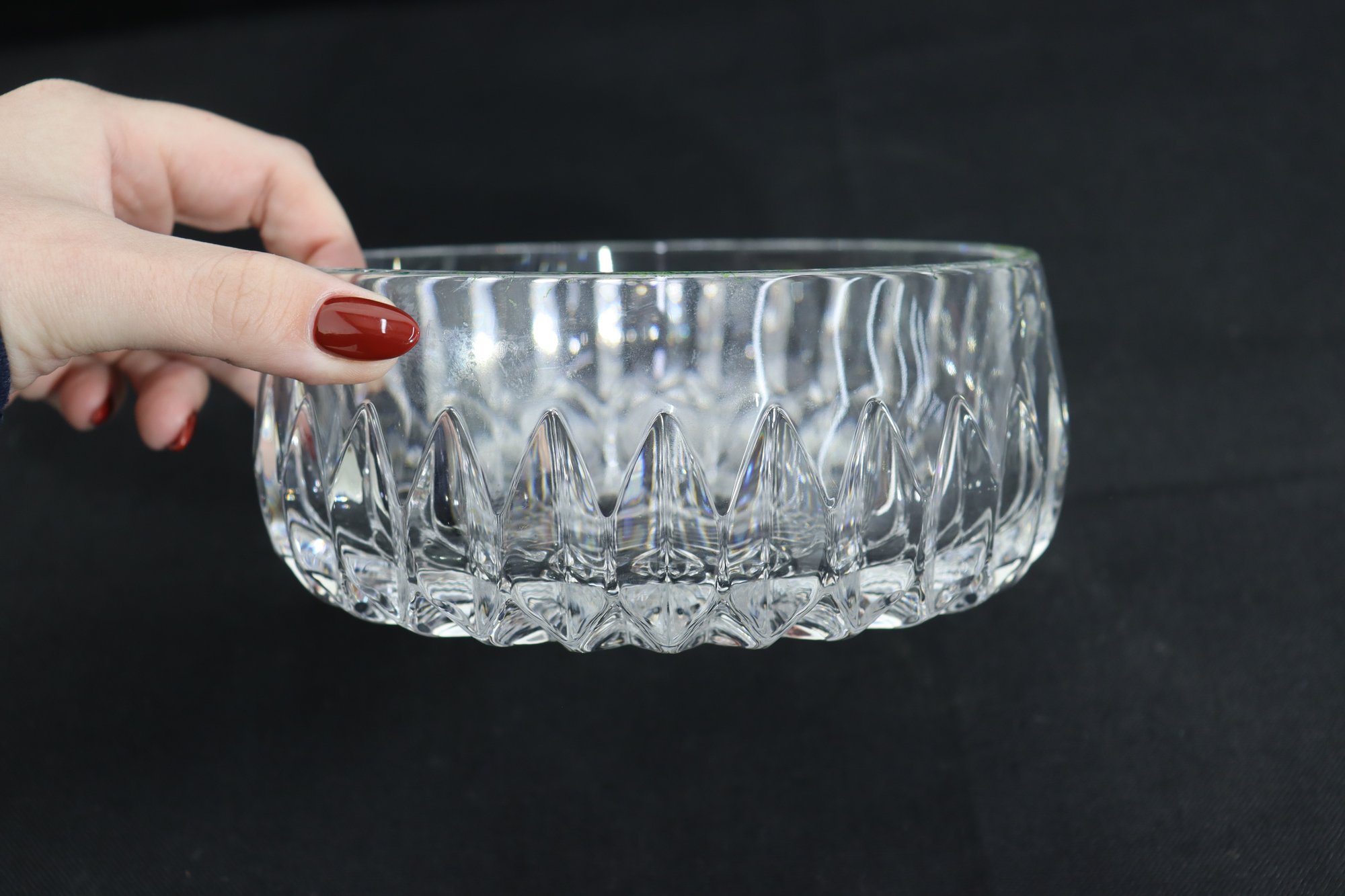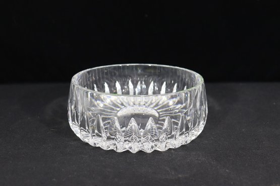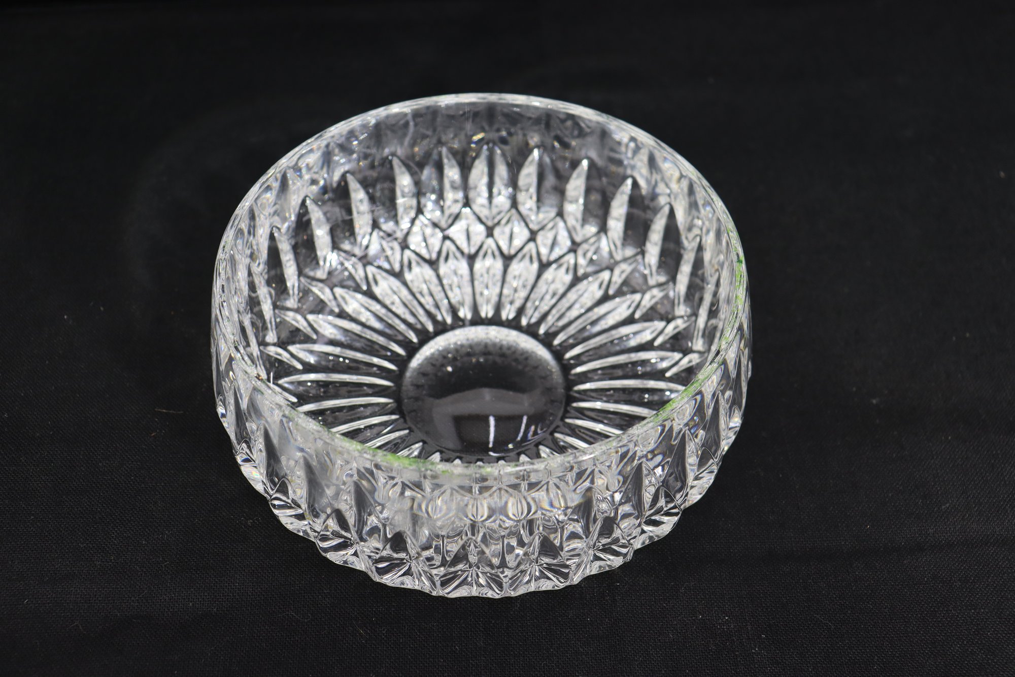 Add timeless sparkle to your décor with this elegant cut crystal bowl, measuring approximately 3 inches high and 6.5 inches in diameter. The bowl features a beautiful starburst base with vertical cut panels and a diamond-faceted pattern that catches and reflects light from every angle.