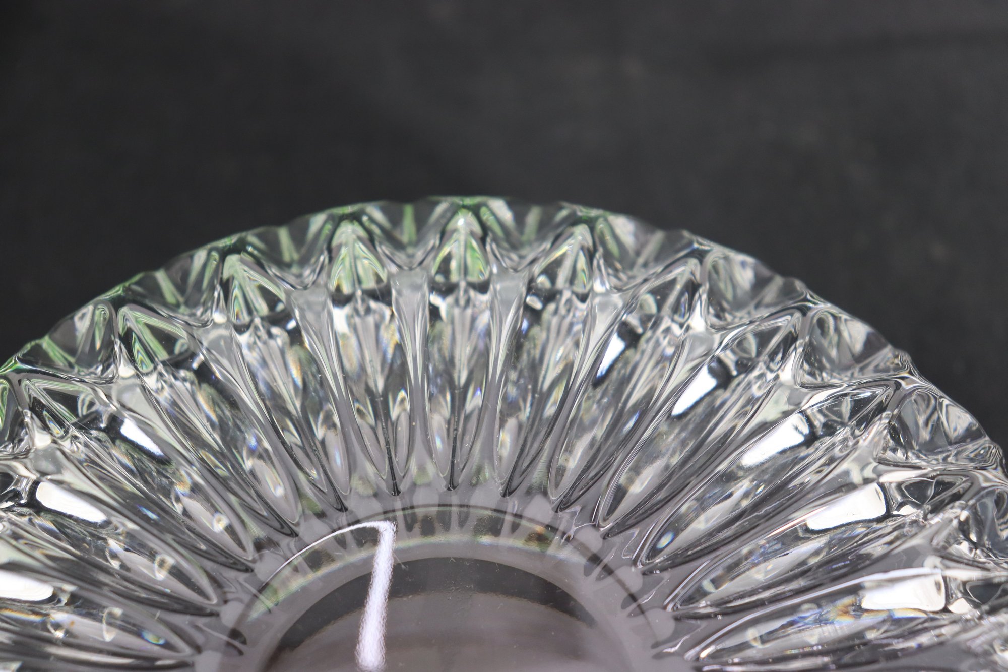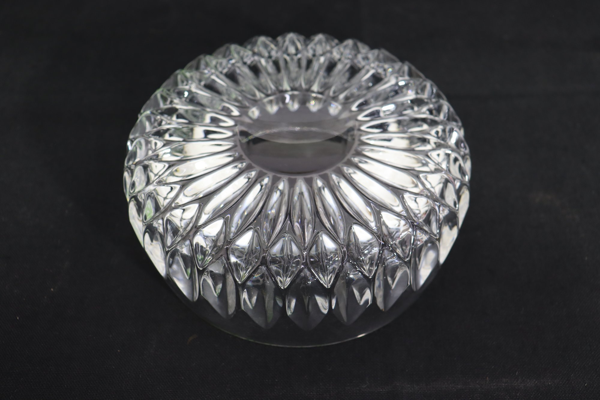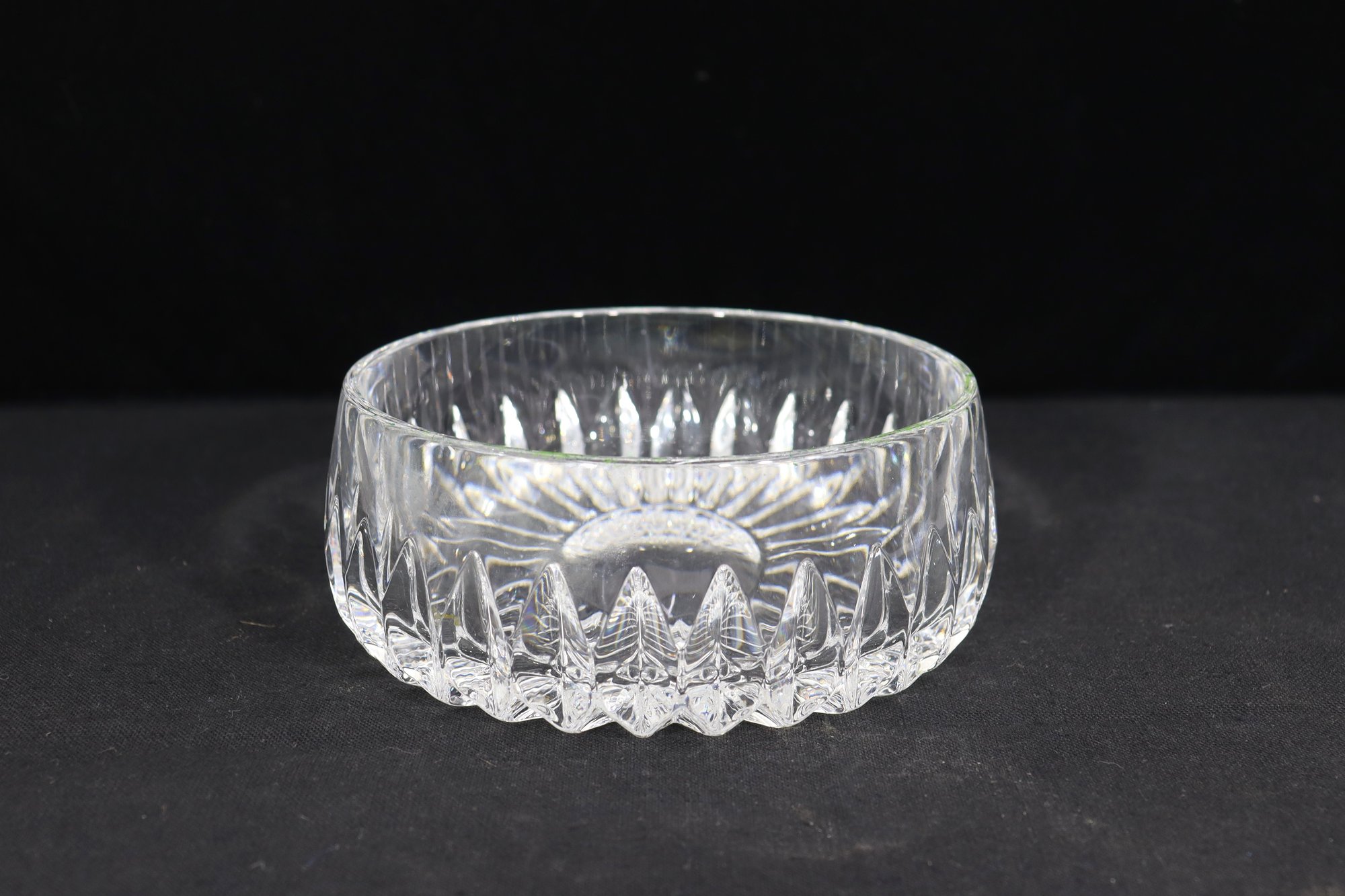 Add timeless sparkle to your décor with this elegant cut crystal bowl, measuring approximately 3 inches high and 6.5 inches in diameter. The bowl features a beautiful starburst base with vertical cut panels and a diamond-faceted pattern that catches and reflects light from every angle.
