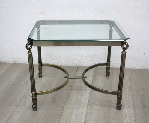 This beautiful end table features a clear glass top and a sturdy brass frame, perfect for adding a touch of sophistication to any room. The intricate design includes decorative scrollwork accents on the corners and a unique circular base, creating a balanced and stylish appearance. Ideal for placing beside a sofa or armchair, this end table combines functionality with timeless elegance. A lovely piece that will complement both modern and traditional decor styles.
