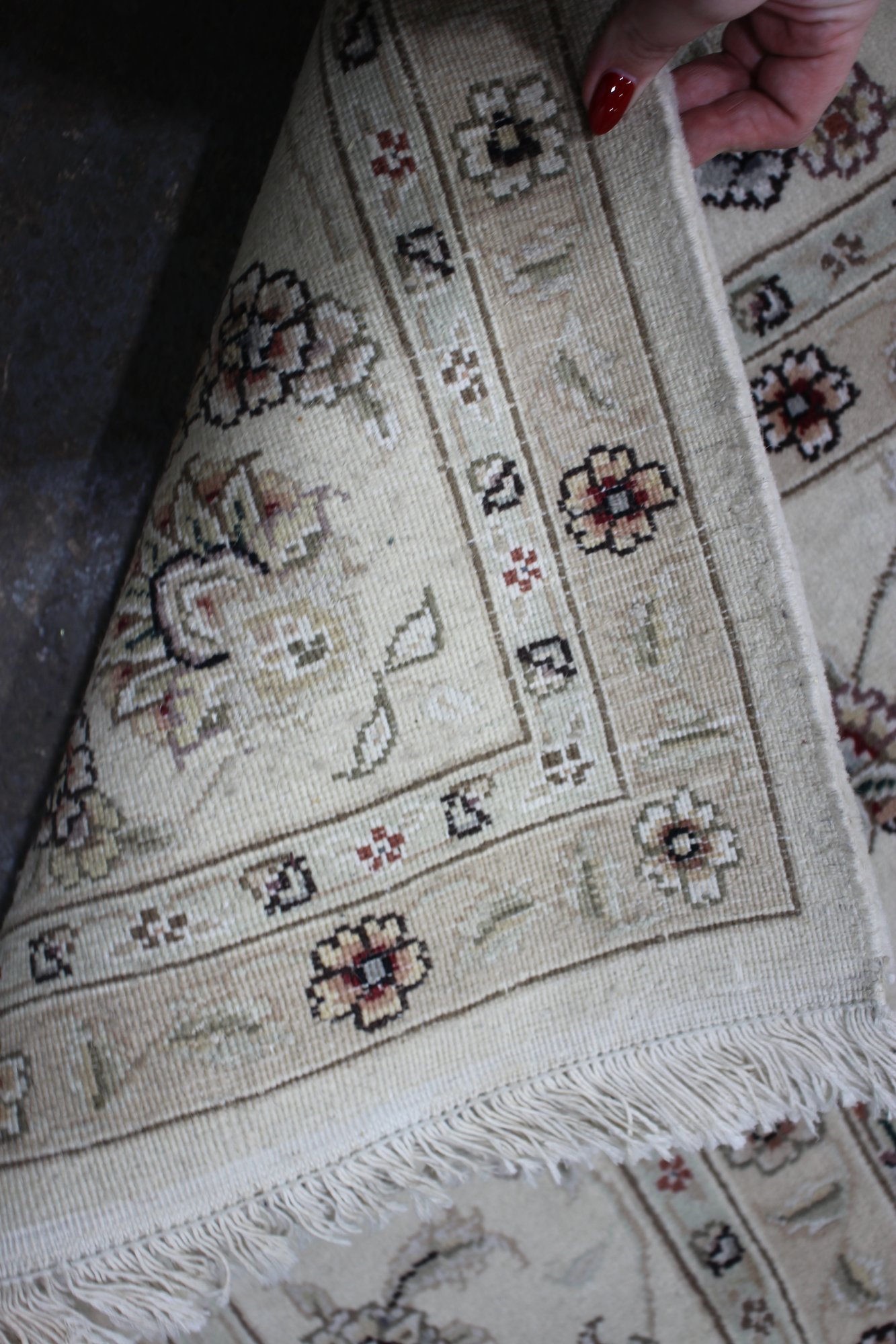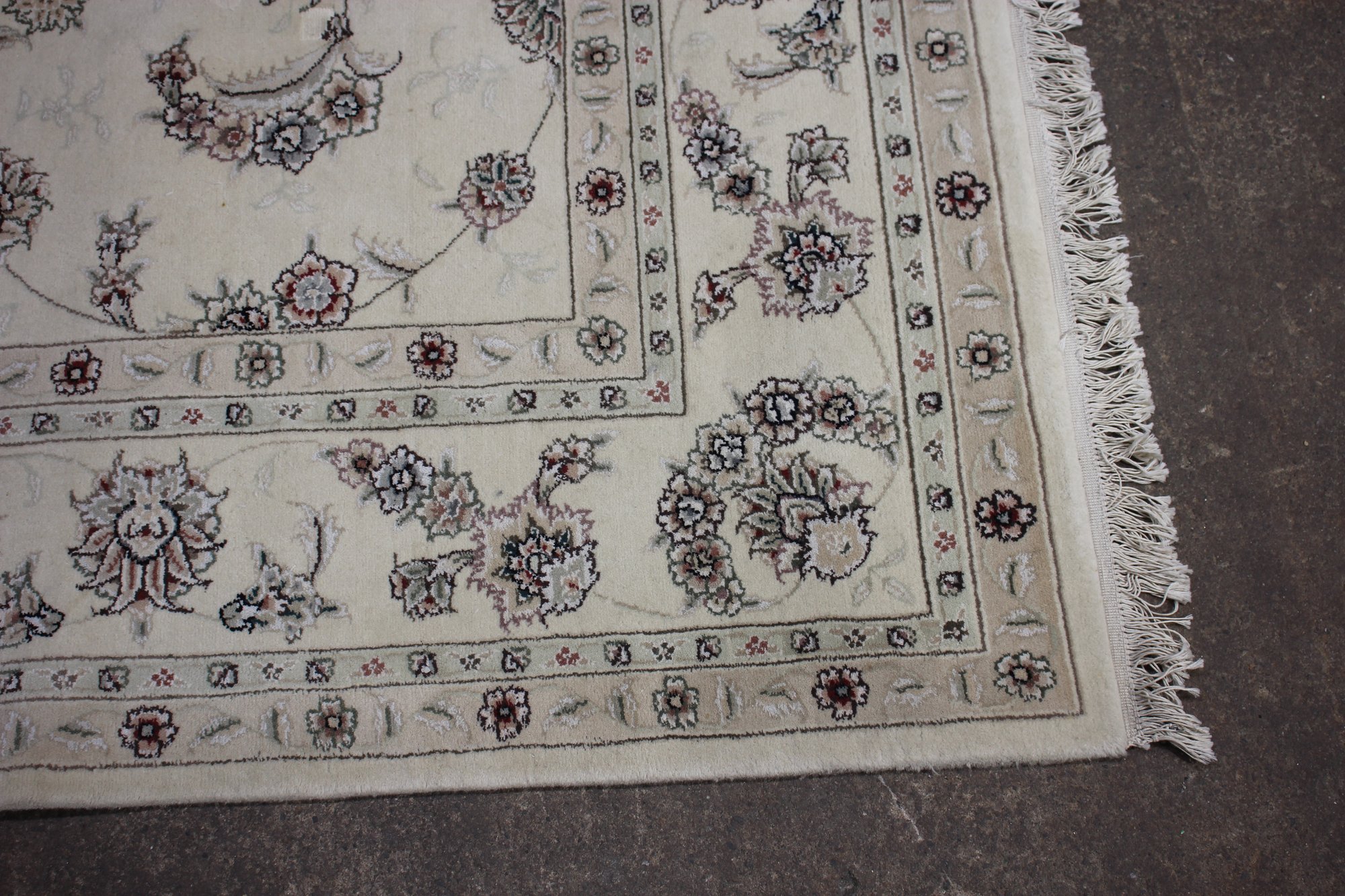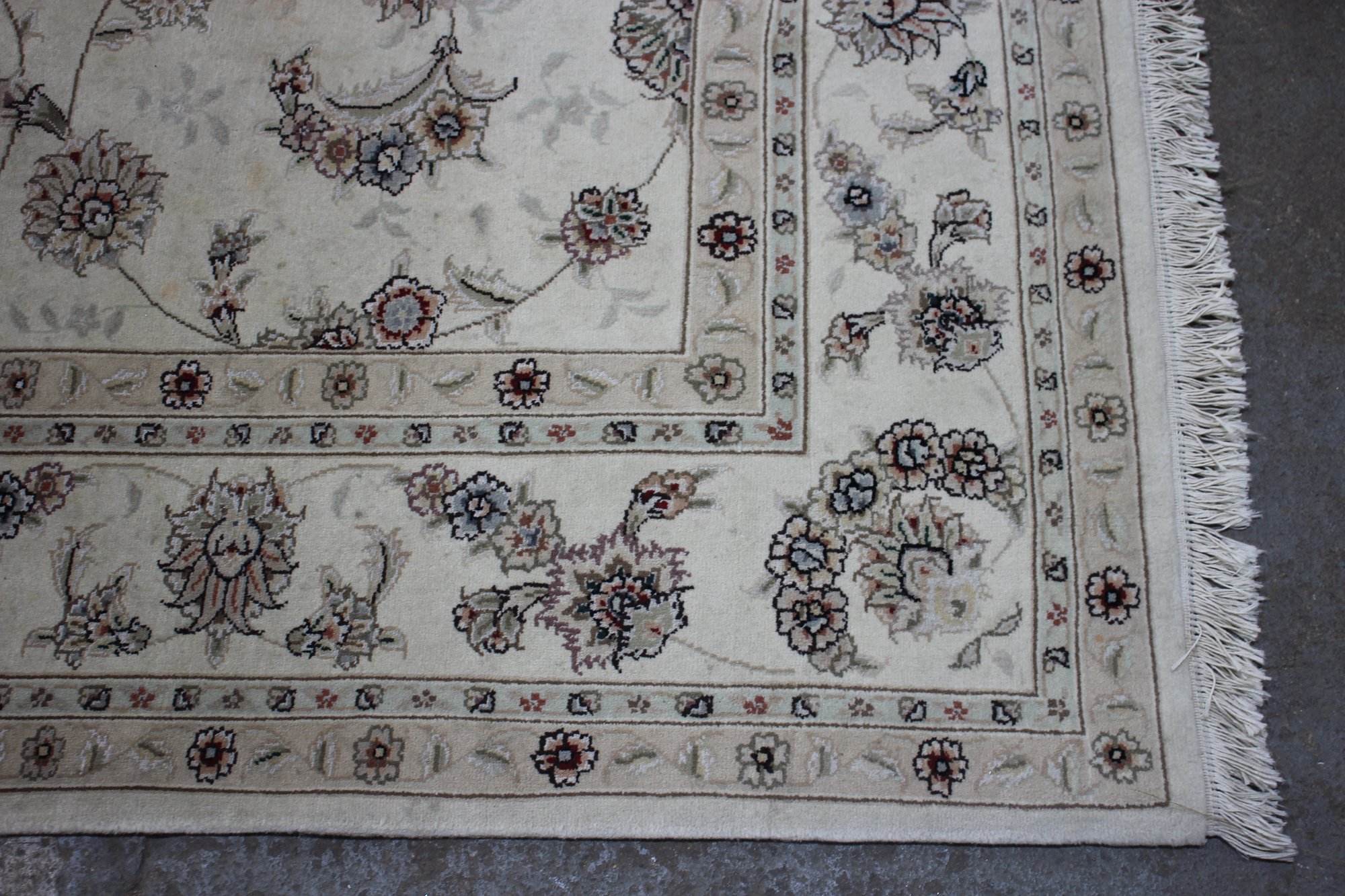 This exquisite hand-woven Persian-style rug combines timeless elegance and masterful craftsmanship. The intricate floral patterns and light cream background make it a versatile piece for enhancing any interior space.