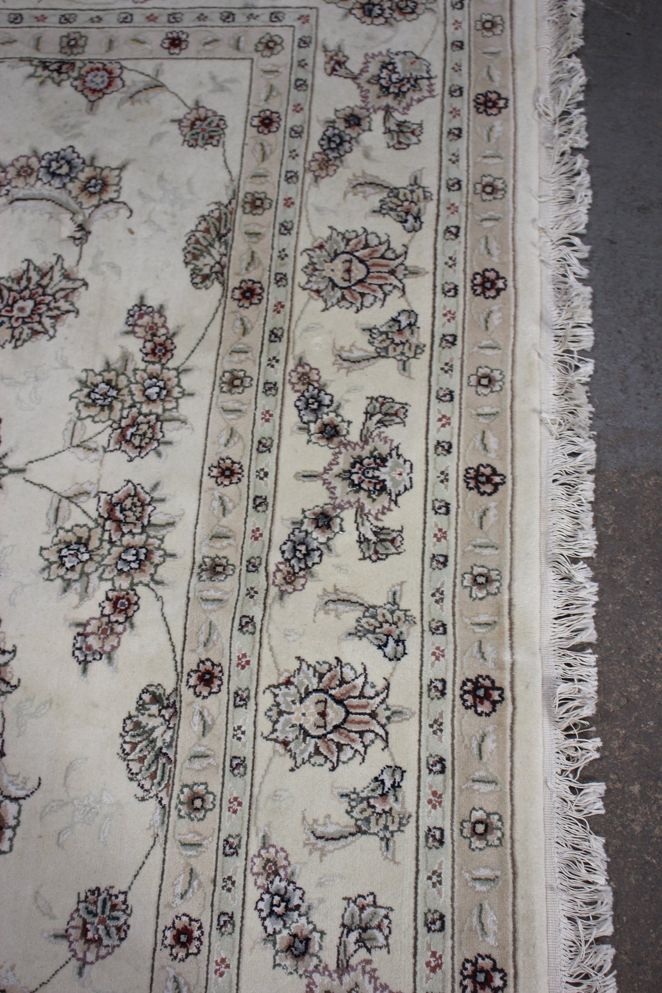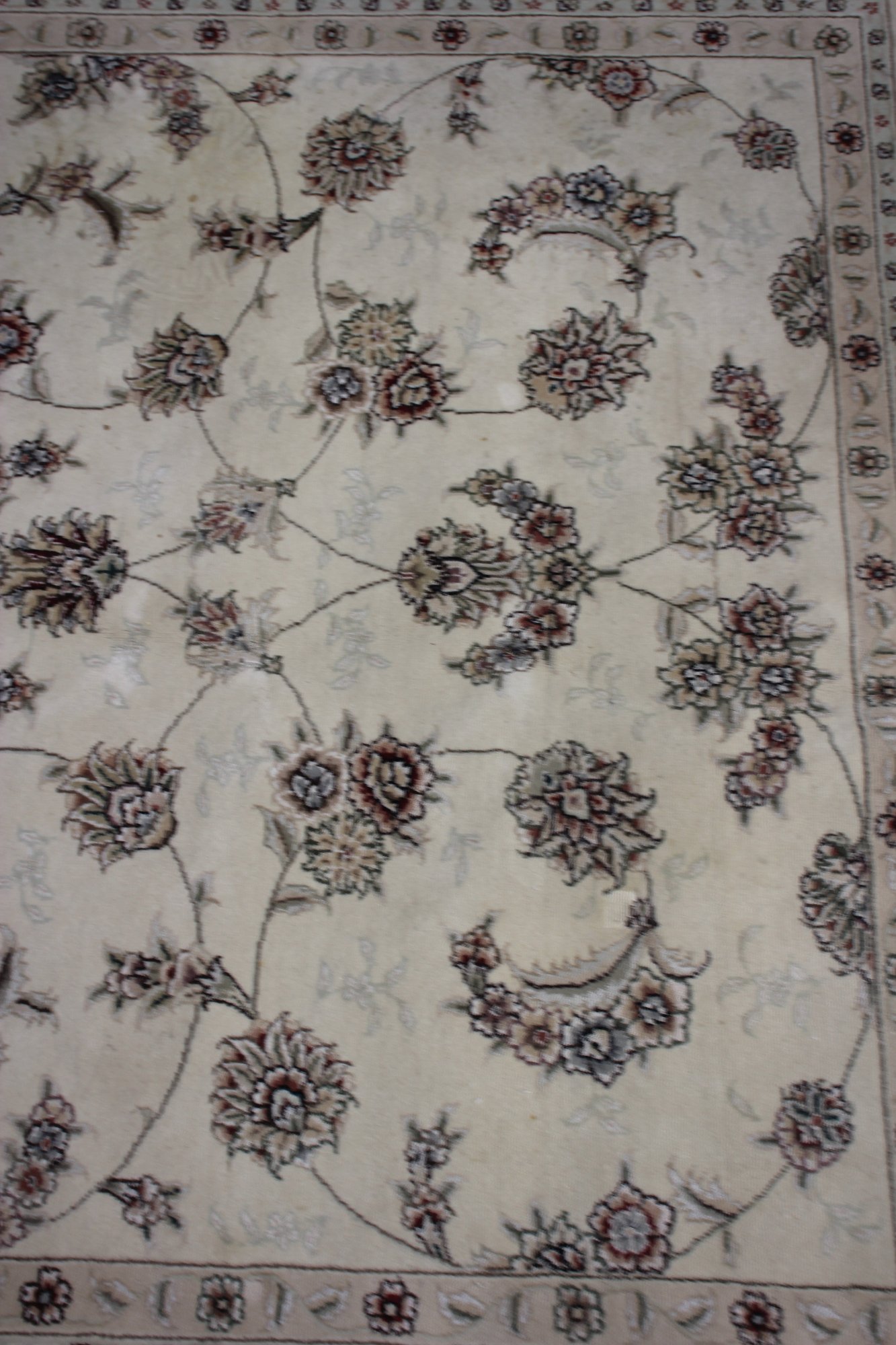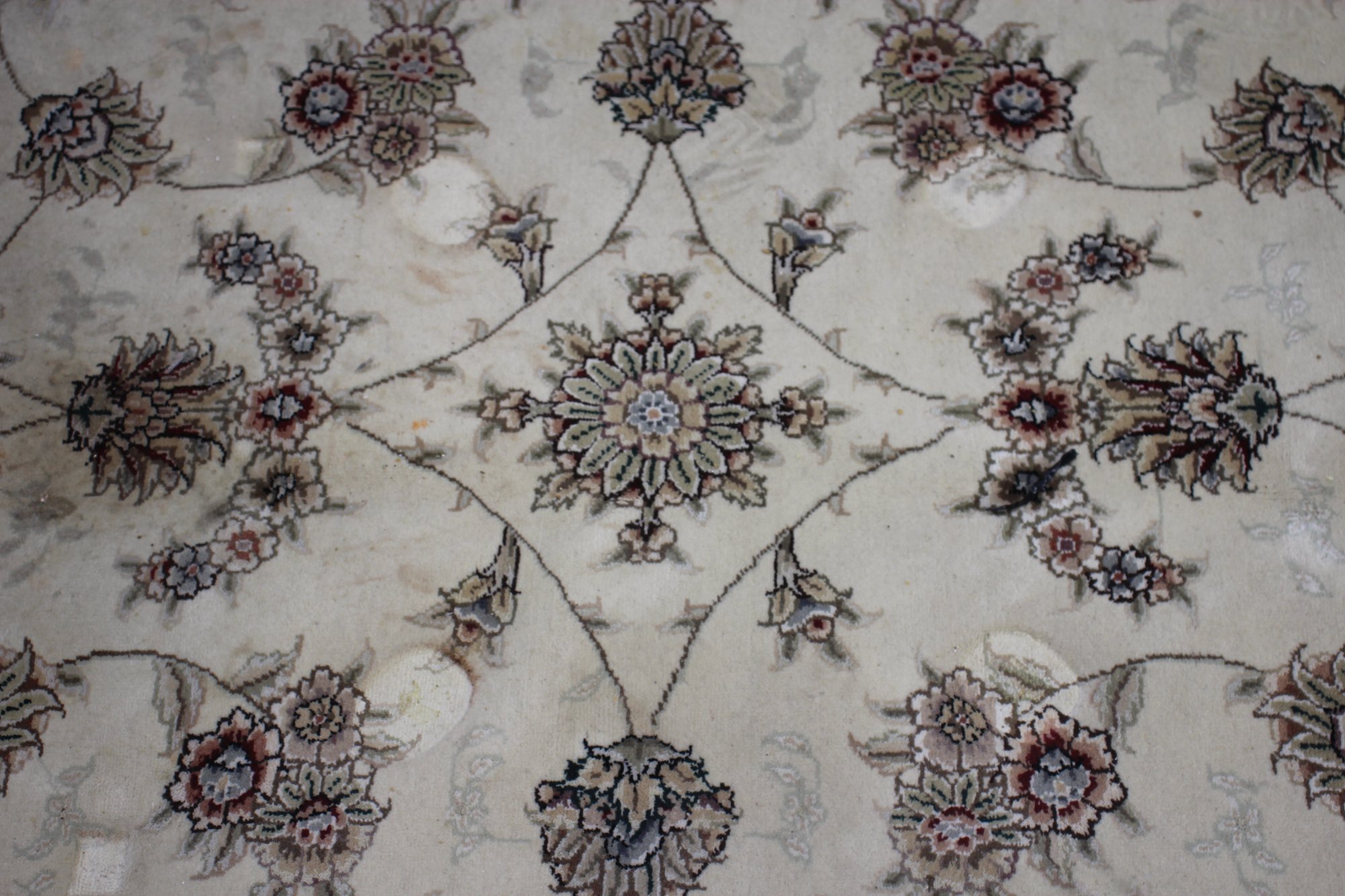 This exquisite hand-woven Persian-style rug combines timeless elegance and masterful craftsmanship. The intricate floral patterns and light cream background make it a versatile piece for enhancing any interior space.