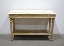 The table features a richly veined marble top that exudes luxury and is perfectly complemented by the sumptuous gilded detailing on the apron and legs.