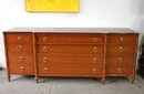 This exquisite vintage dresser by Daniel Jones Inc. brings both sophistication and functionality to any room. Crafted with rich mahogany wood, this piece features a smooth top surface with a beautiful grain pattern and a refined finish that highlights its mid-century aesthetic. The dresser is structured with a combination of large and smaller drawers, all adorned with stylish brass ring pulls, offering ample storage and a touch of elegance.