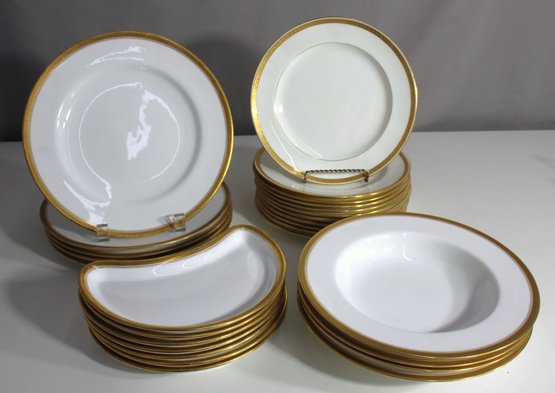 This luxurious 26-piece dinner set by Royal Bavarian China, made by P.T. Bavaria Tirschenreuth, exudes timeless elegance with its classic white porcelain and rich gold trim. This set is perfect for formal dining occasions or as a beautiful display collection.