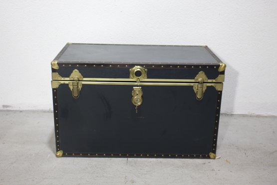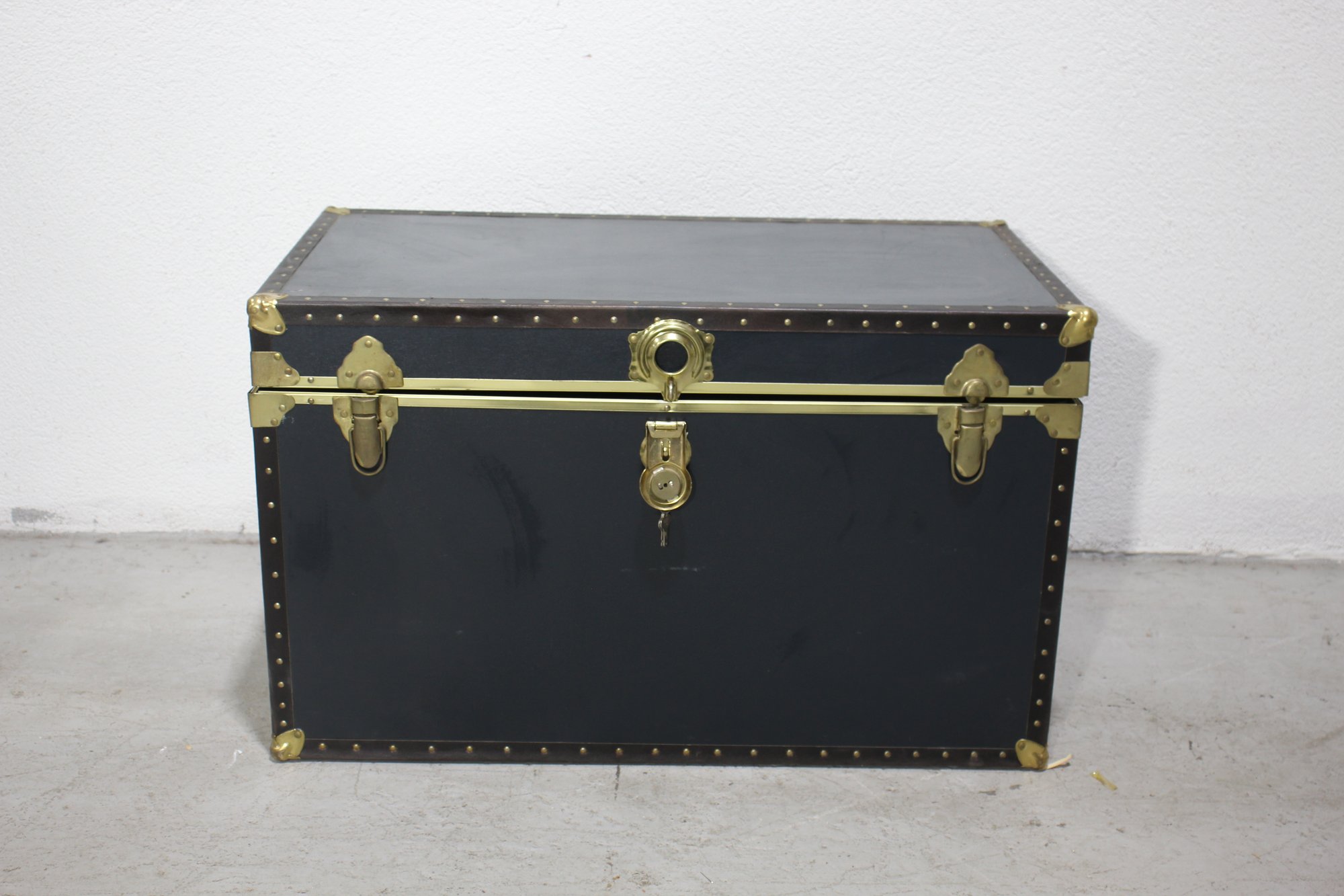 The trunk features a robust brass latch with an accompanying key, brass corner protectors, and brass rivets that highlight its craftsmanship.